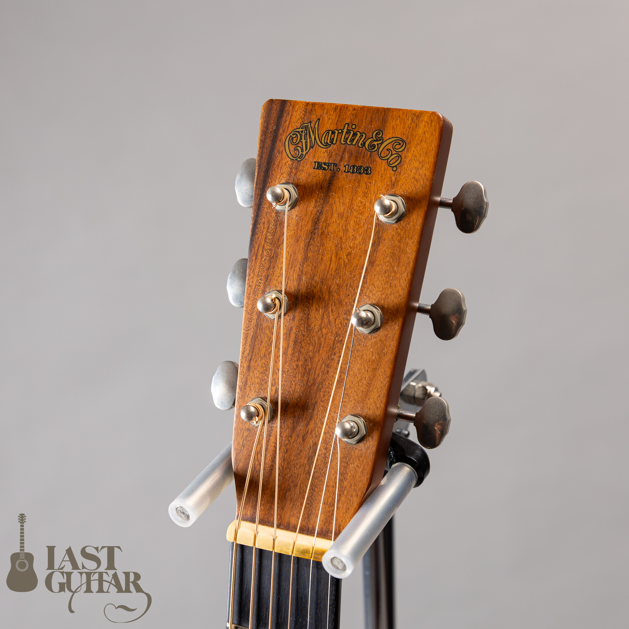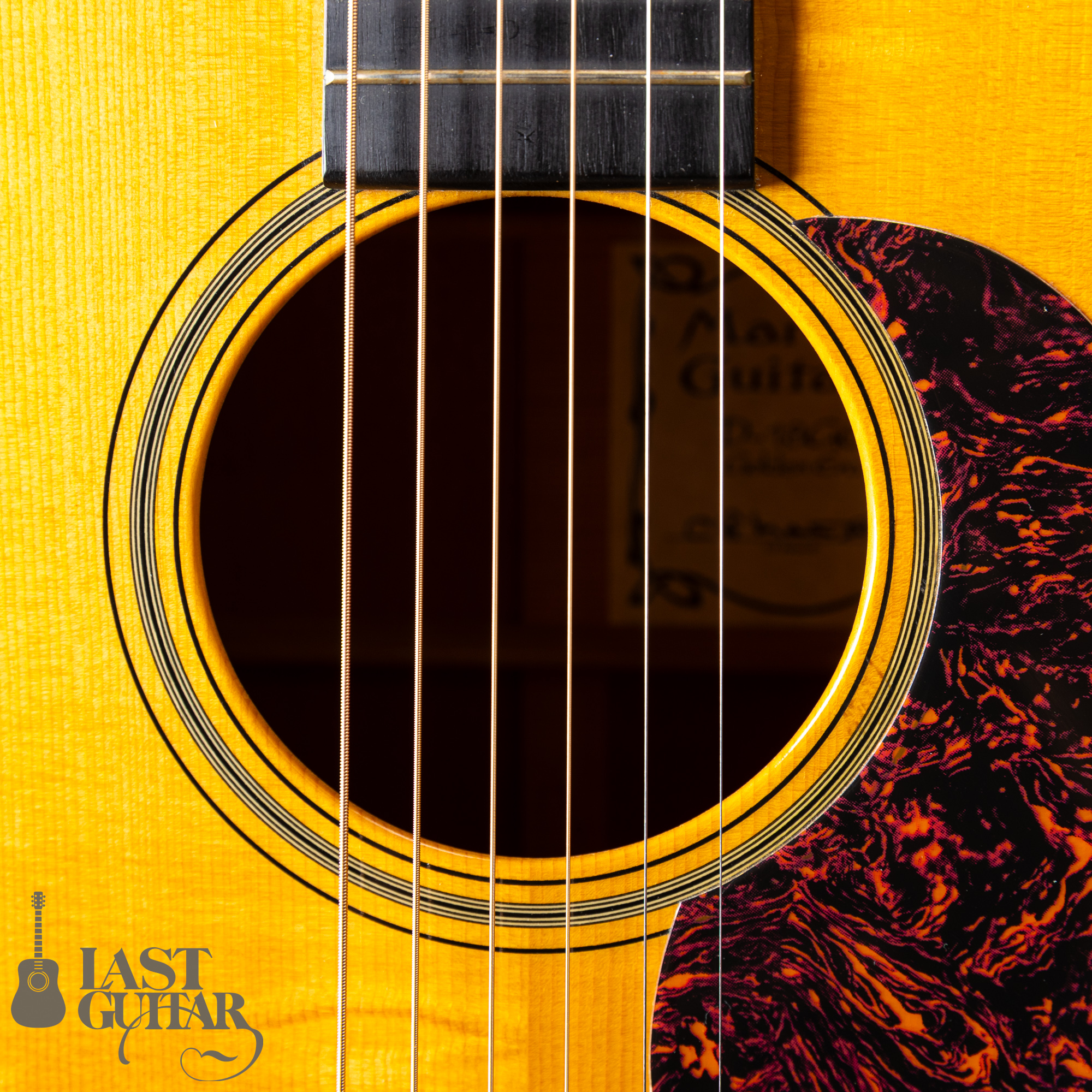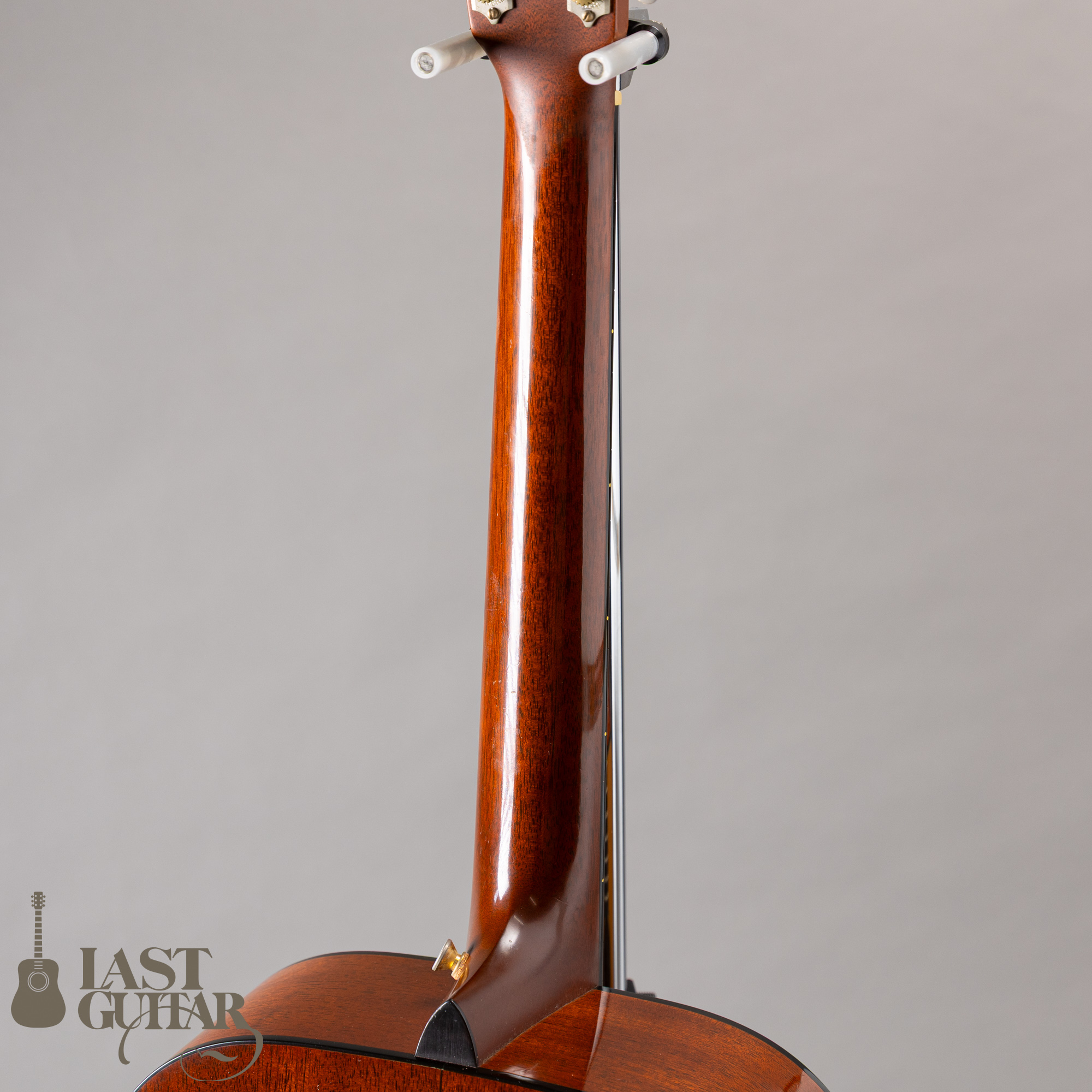 当時のヴィンテージレプリカ最高峰に相応しい、素晴らしい材で組み上げられており、トップは良い感じでベアクロウが入ったきれいな木目のアディロンダックスプルース、サイドとバックのマホガニーもきれいで良質です。ネックはマホガニー、フィンガーボードとブリッジは今では大変貴重な黒く引き締まったエボニーです。ヘッドプレートもなかなか雰囲気あるハカランダでカッコいいです。ネックまわりにつきましては、約44.5mmのナット幅に、少し広めに感じるVシェイプといった印象です。サドルは、ヴィンテージスタイルですのでロングタイプで音の分離感が良いです。ブレイシングはフォワードシフトのスキャロップXブレイシングで音の広がりを感じさせてくれます。チューナーは、ヴィンテージスタイルの高級ペグWaverlyを搭載しており、問題なく動作しております。