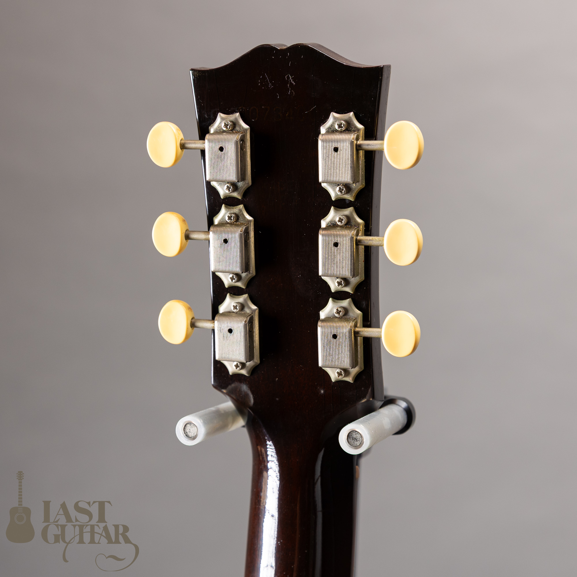 本機は、2004年製で、ウェザーチェックがトップにバリバリと入って貫禄ある風貌に育っております。渋いサンバーストカラーとマッチングしてすごく良い表情をしております。色づいたバインディングやペグボタンも雰囲気があります。シルクスクリーンロゴ、シングルのサウンドホールリング、スモールピックガード、白ボタンペグと王道のスタイルはやはりシンプルですごくカッコいいです。