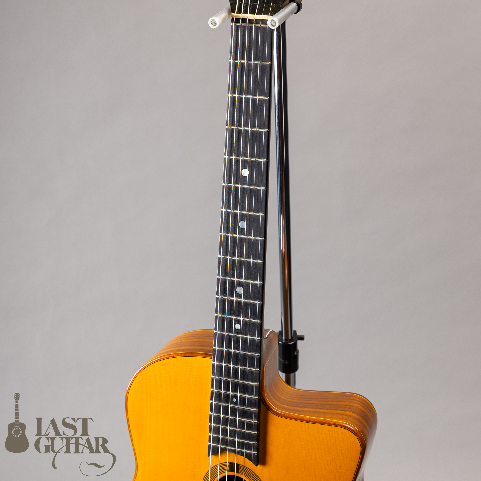 本機は、インサイドラベルより2010年に製作されたダフネモデルです。トップは、目の詰まったソリッドスプルース、サイド、バックは、きれいな木目のラミネートウォルナット、ネックもウォルナットでなかなか雰囲気あります。フィンガーボードとブリッジは、エボニーです。ネックまわりは、約44mmナット幅(0フレット)で、程よい厚みの比較的馴染みやすいDシェイプといった感じです。フィニッシュは、グロス仕上げです。
