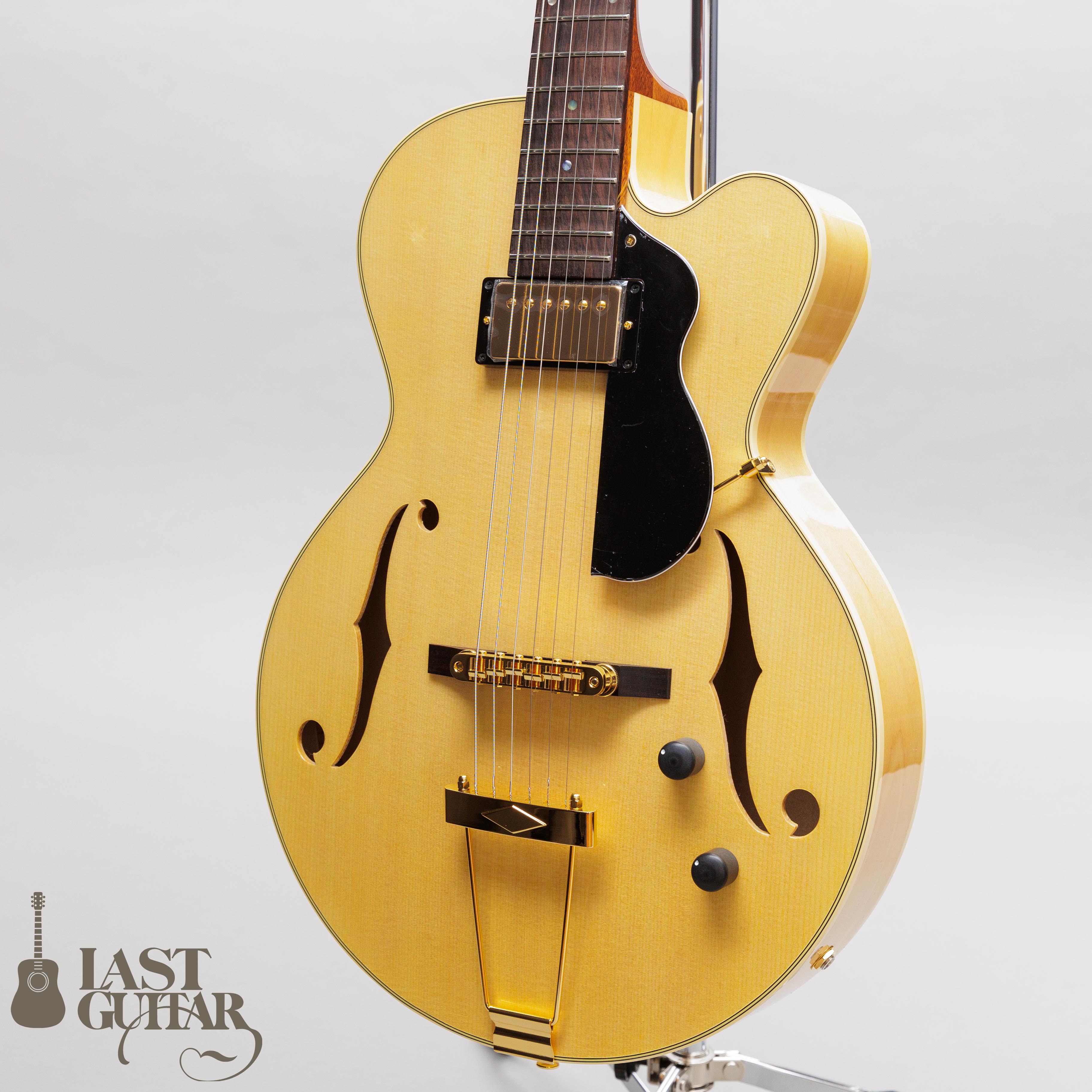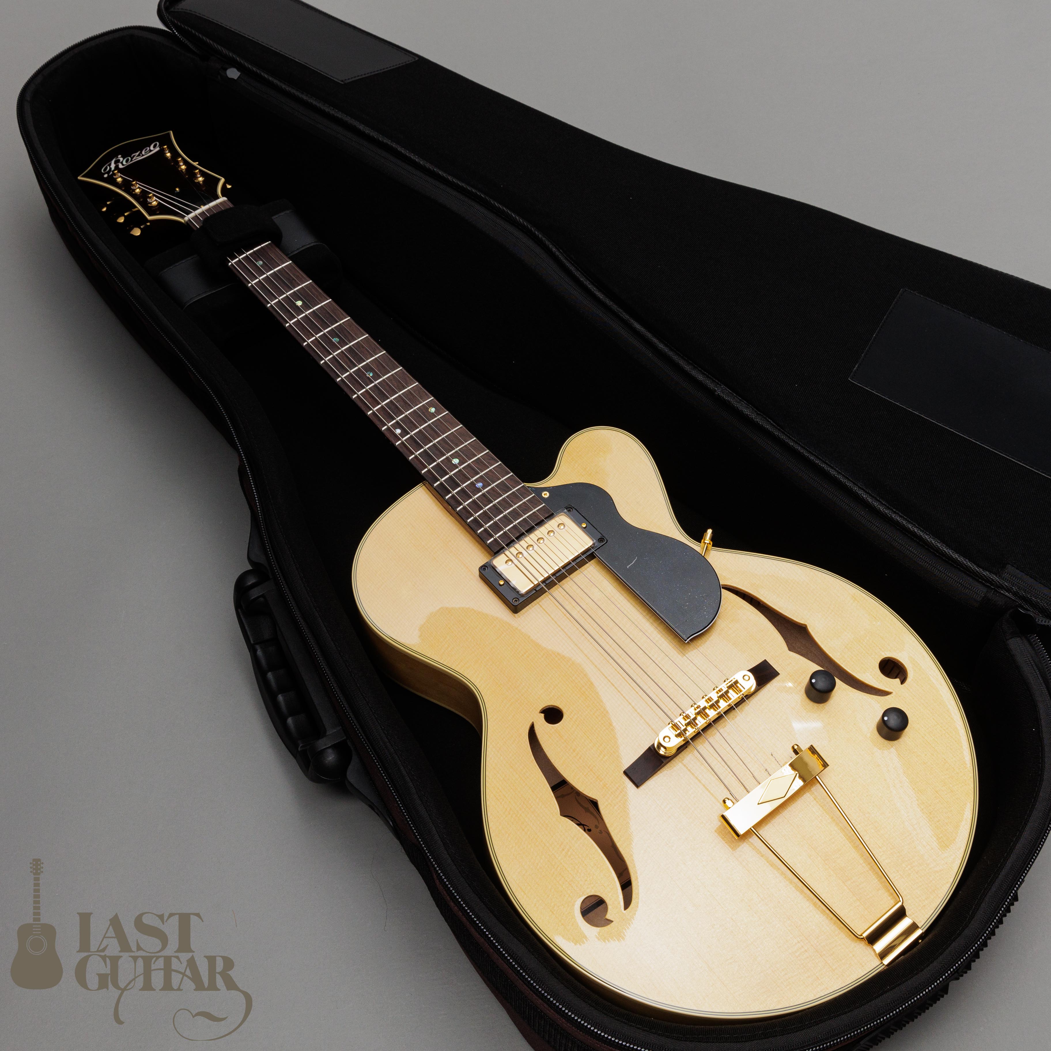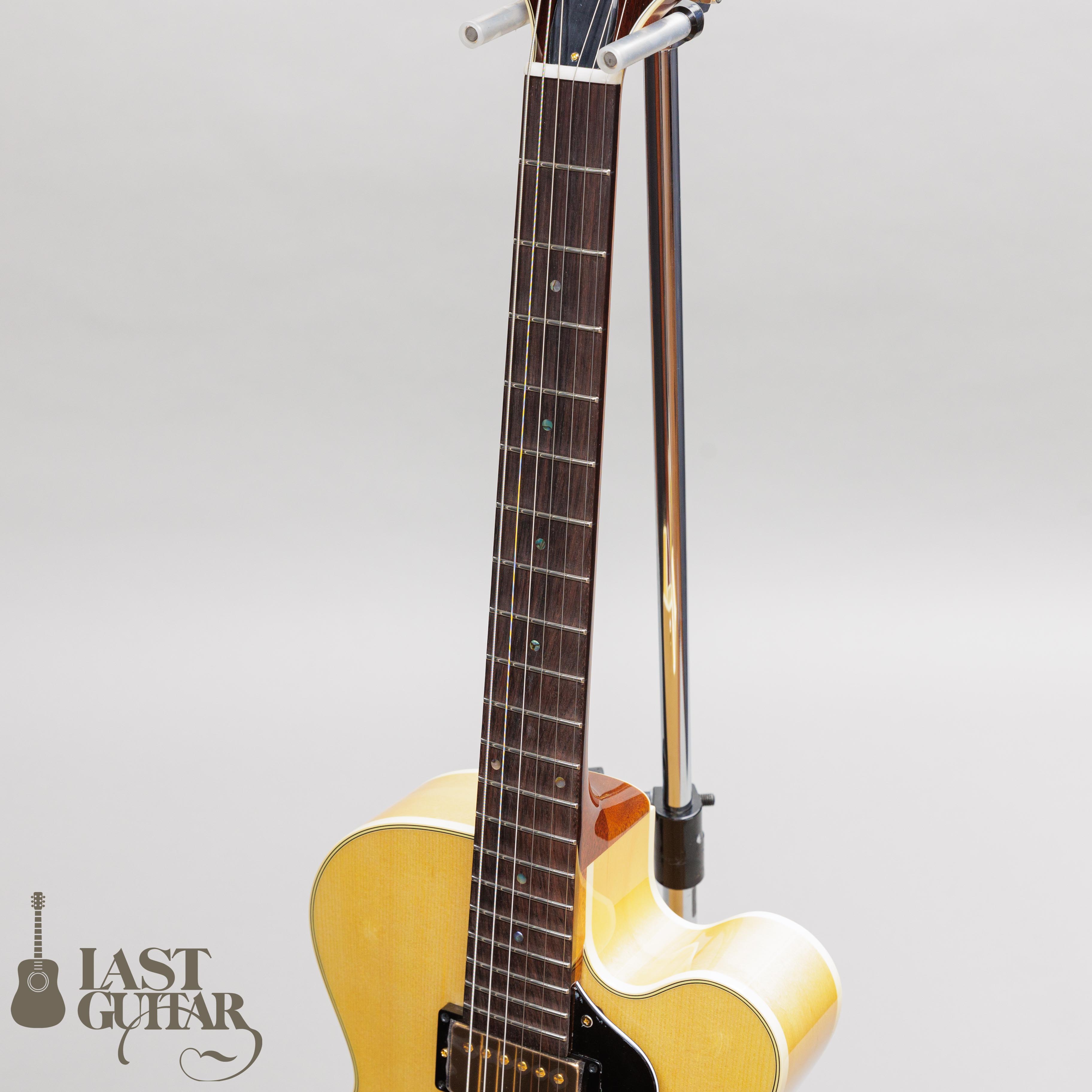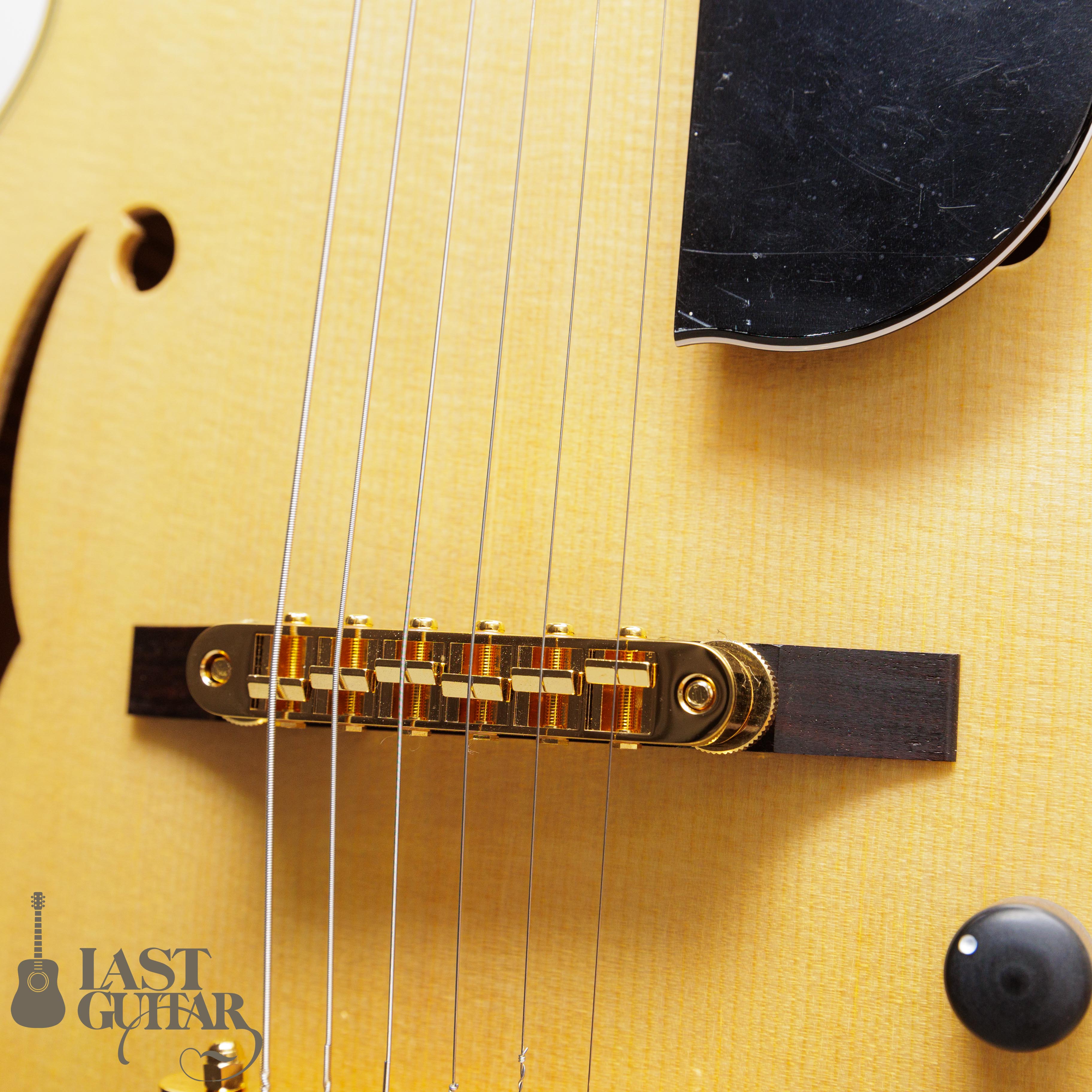 本機は、レギュラーライン、フルアコースティックタイプ、胴厚(70ミリ)、シングルカッタウェイ、ハムバッカータイプのピックアップを1基マウントしたナチュラルカラーモデルで、シンプルでカッコいいです。