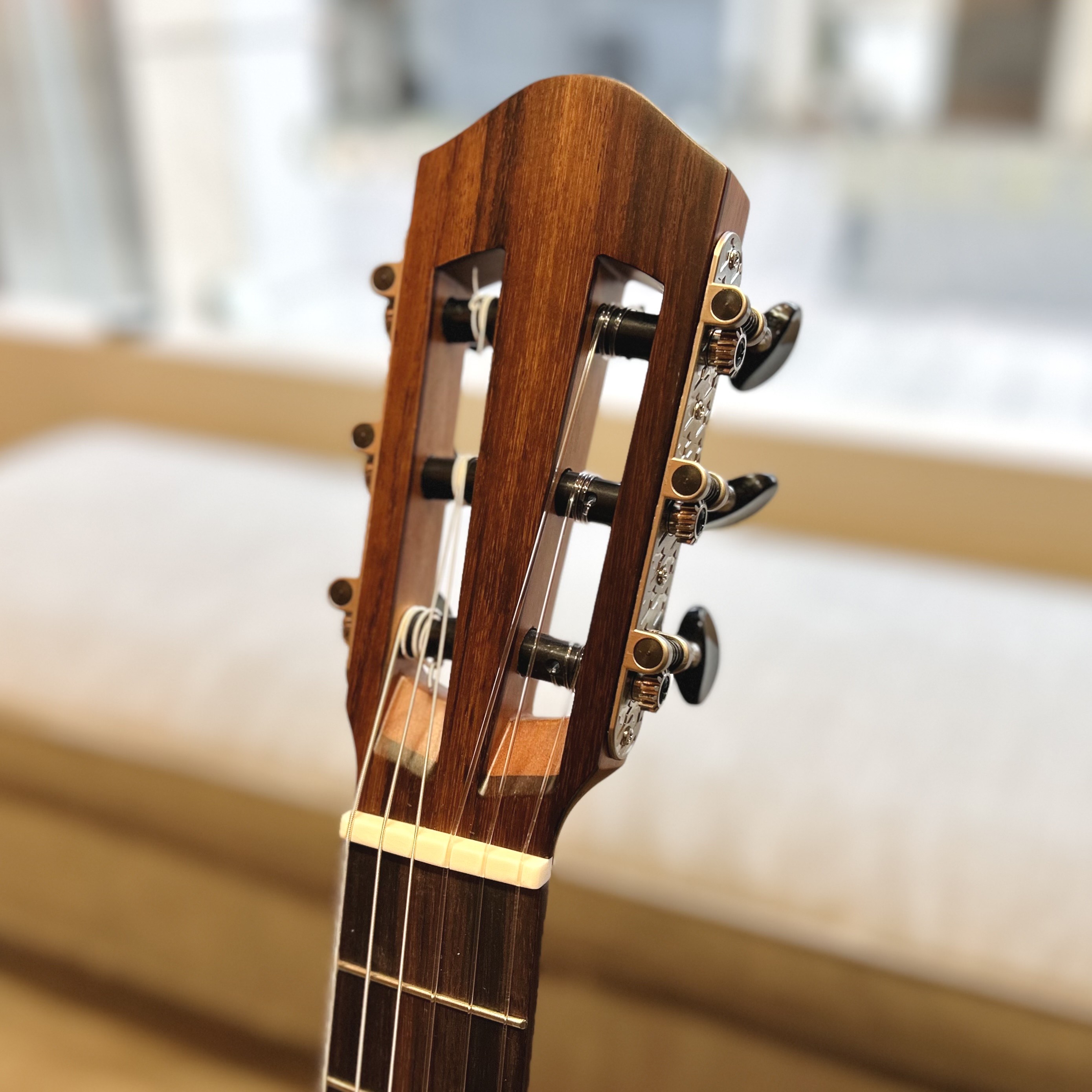 ウッドマテリアルにつきましては、シダートップ、マホガニーのサイド、バック、ネック、ローズウッドのフィンガーボードとブリッジです。ネックまわりは、ナット幅は、46ミリで一般的なクラシックギターより狭く、程よい厚みで馴染みやすいと思います。フィニッシュは、さらさらとした手触りの艶を抑えたセミグロス仕上げで木の温もりが感じられます。またペグのベースプレートは、千鳥柄が入っていて可愛らしくこのシリーズのポイントになっています。