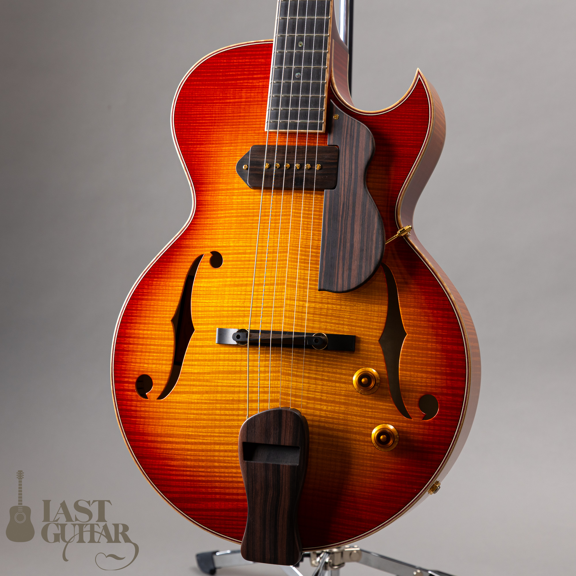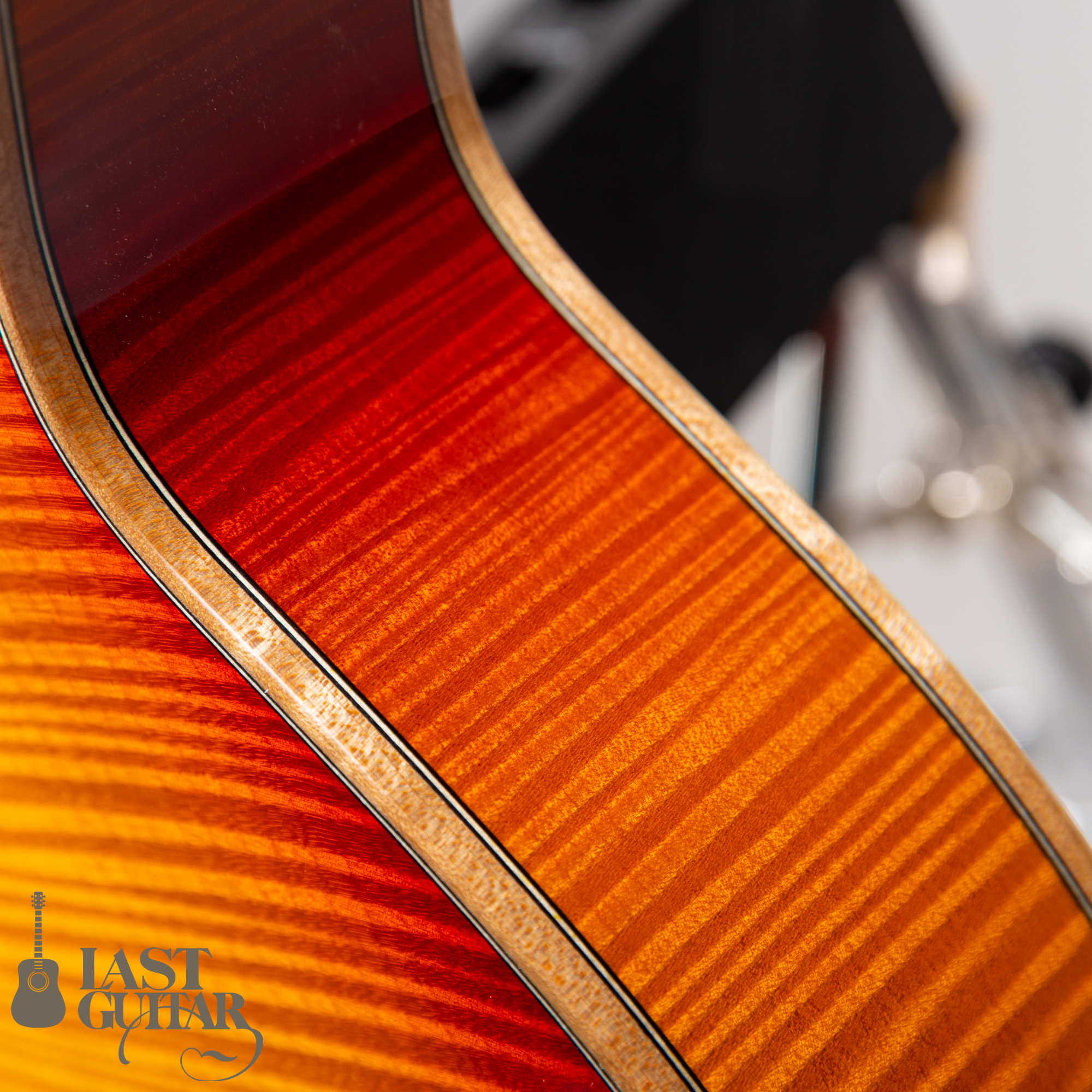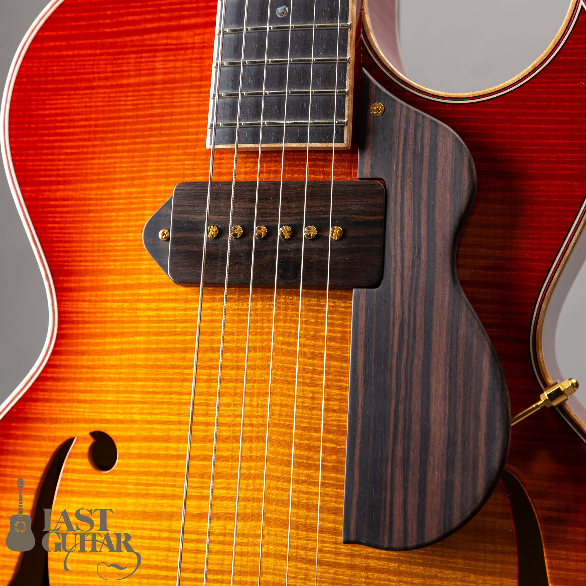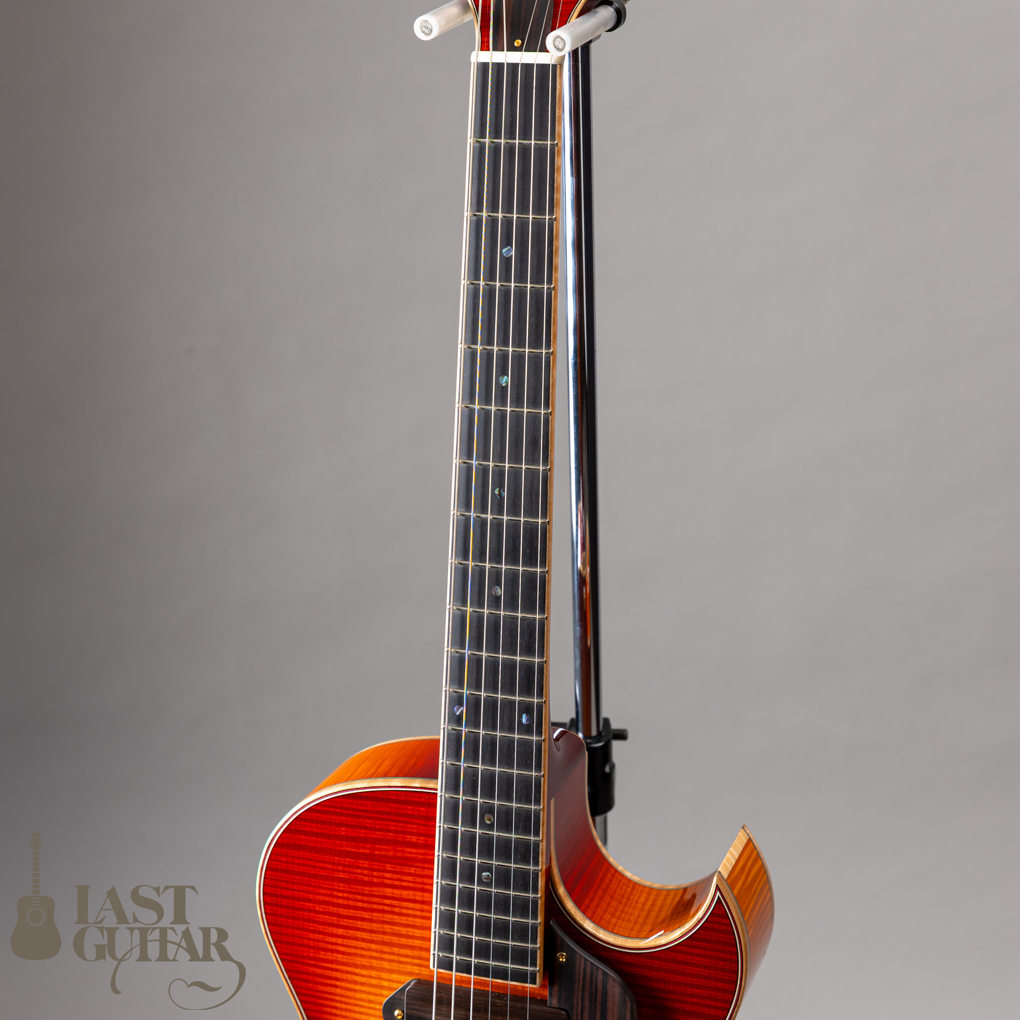 シャープカッタウェイスタイルで、樋口氏チョイスによる今ではなかなか入手ができない素晴らしい杢が入ったデッドストックフレイムメイプルがボディに贅沢に使用されております。カラーリングは、ロゼオでは珍しいチェリー―サンバーストカラーで美しい木目をよりいっそう引き立て気品があります。マッチングしたスルーカラーのフレイムメイプルヘッドプレート、フレイムメイプルのバインディング、パーフリングの赤いラインなど細かいところまでとってもお洒落です。ウッドで統一されたピックアップカバー、ピックガード、テールピースが楽器全体の印象を引き締めていてまた良いです。ピックアップカバーからきらめくゴールドのポールピースも素敵です。