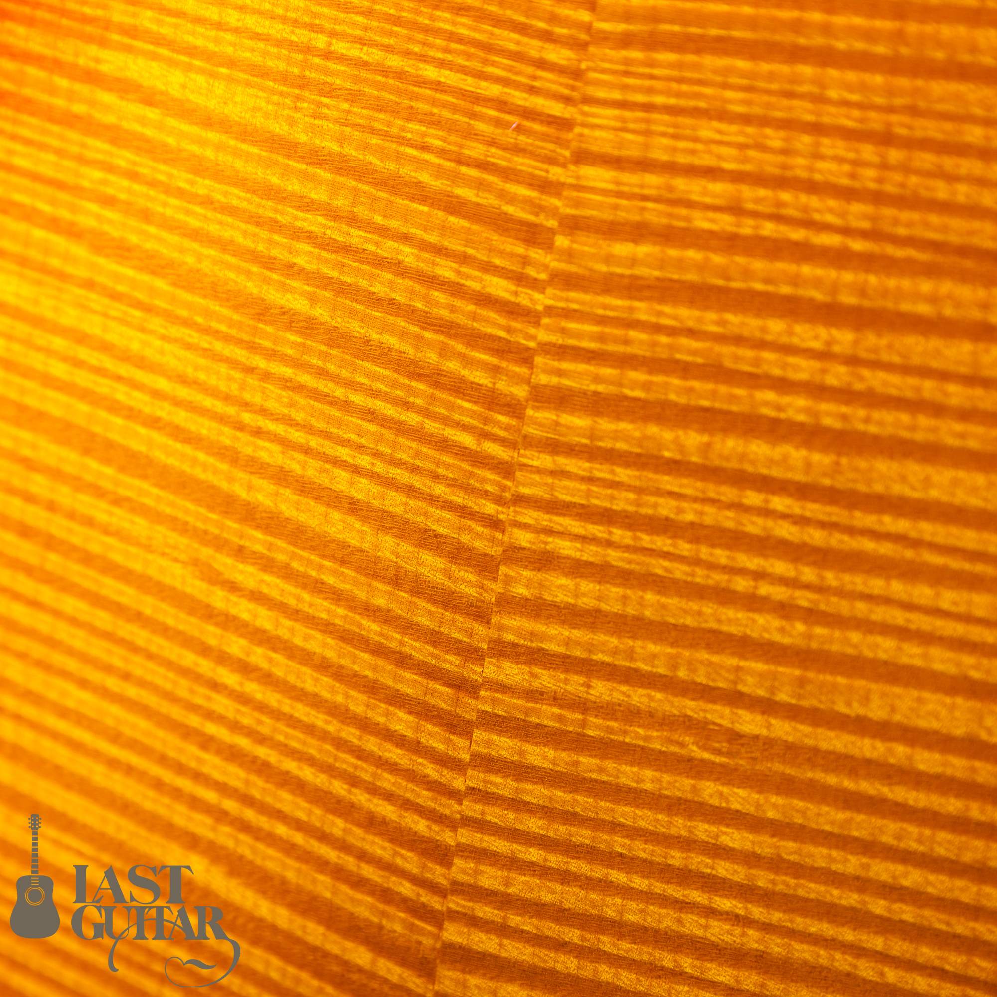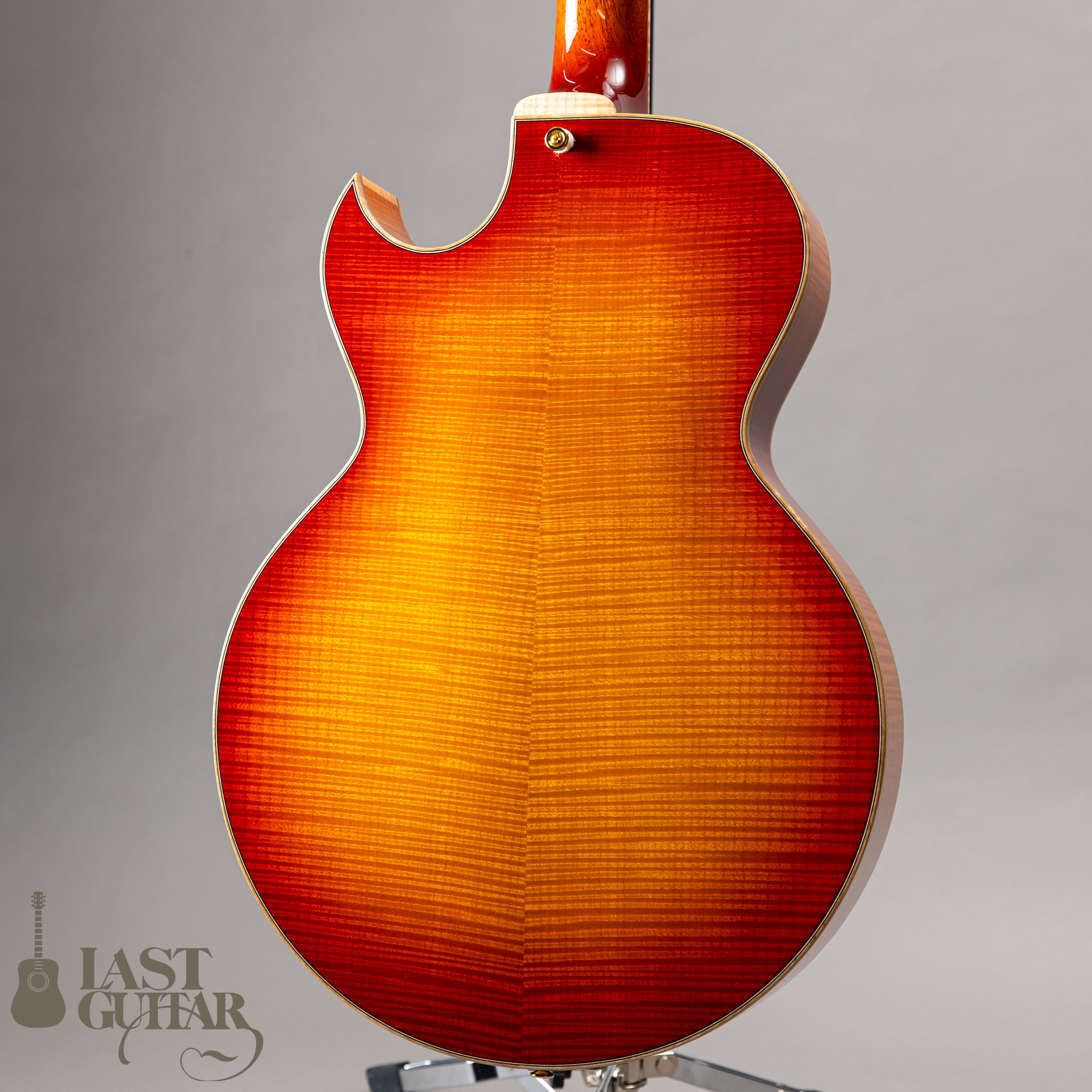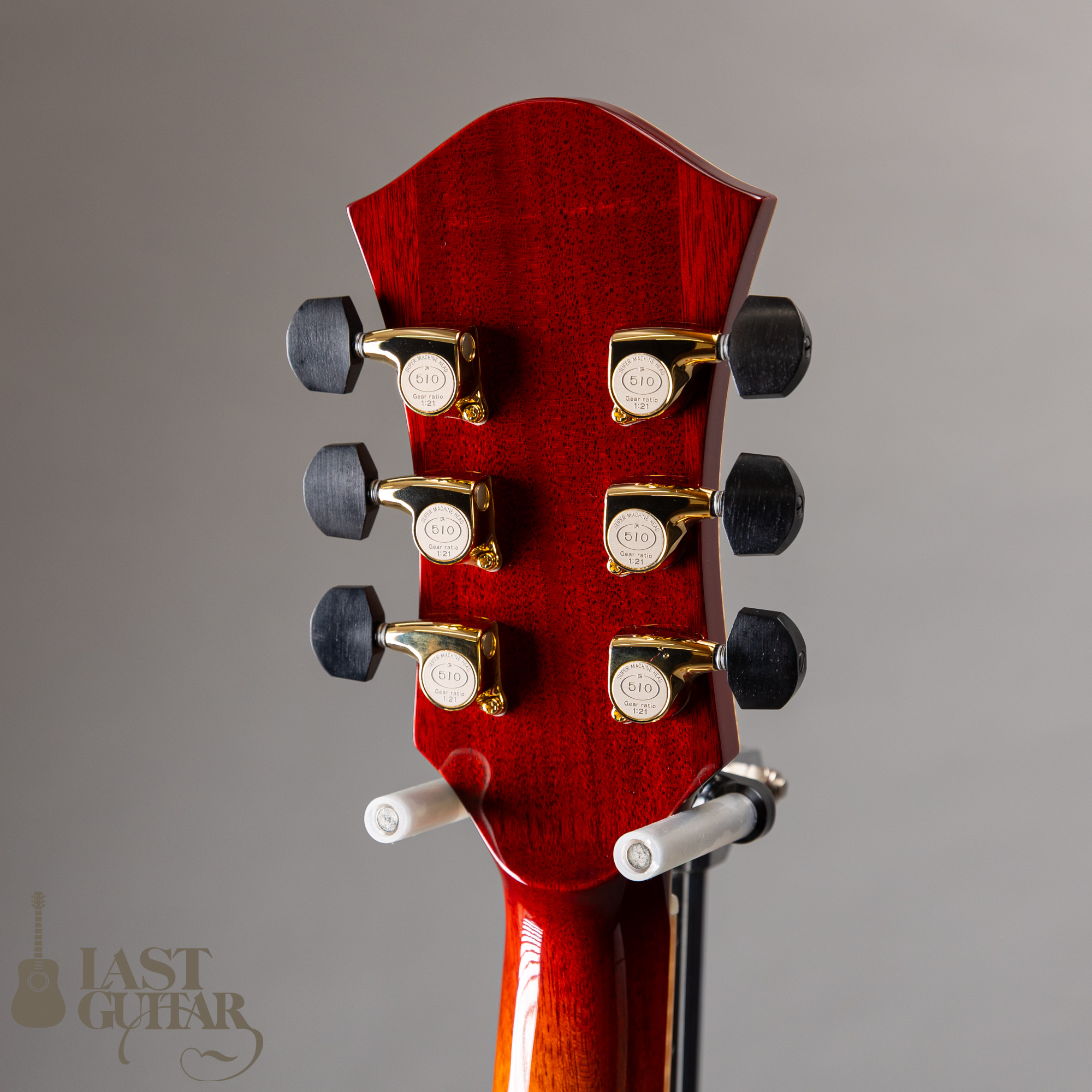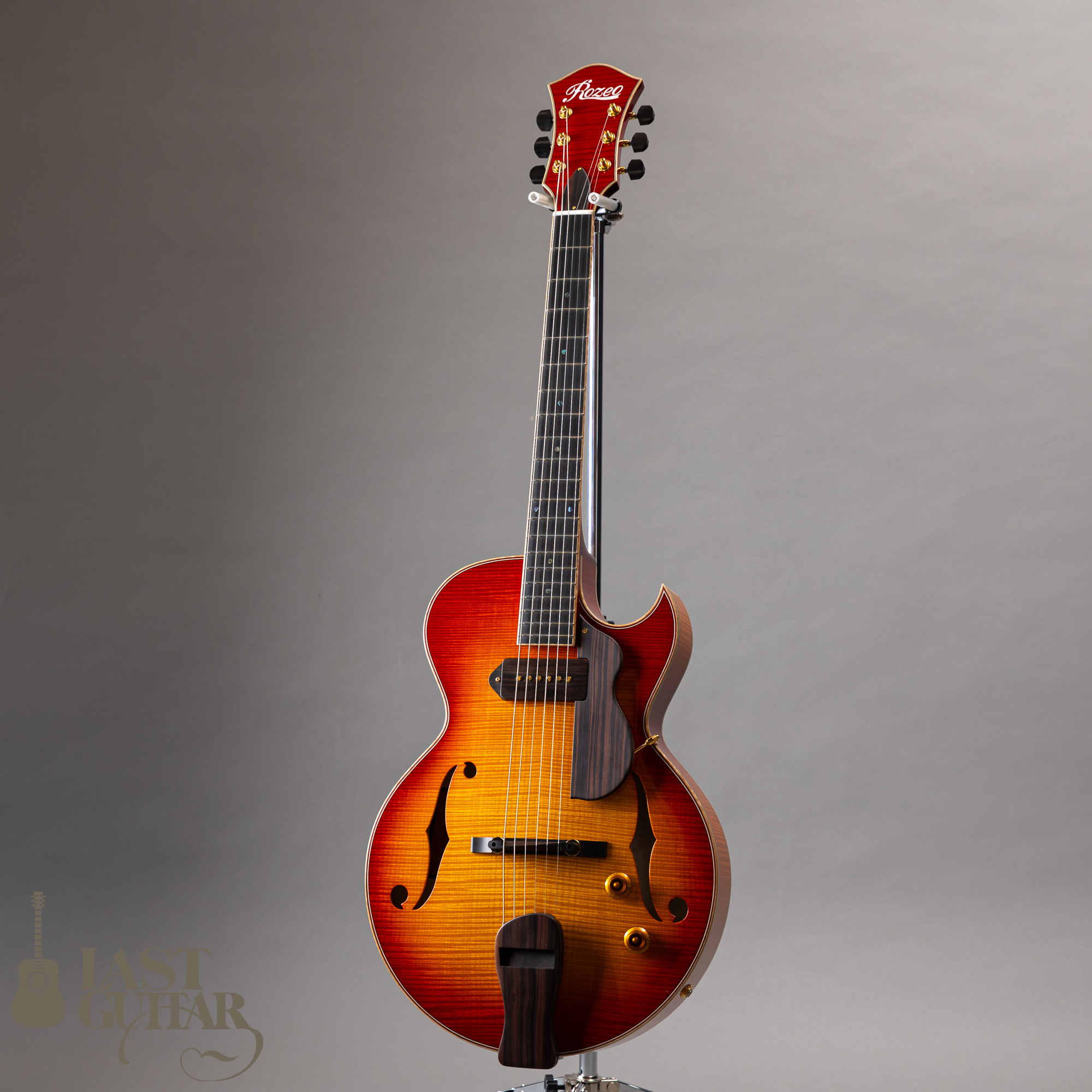 シャープカッタウェイスタイルで、樋口氏チョイスによる今ではなかなか入手ができない素晴らしい杢が入ったデッドストックフレイムメイプルがボディに贅沢に使用されております。カラーリングは、ロゼオでは珍しいチェリー―サンバーストカラーで美しい木目をよりいっそう引き立て気品があります。マッチングしたスルーカラーのフレイムメイプルヘッドプレート、フレイムメイプルのバインディング、パーフリングの赤いラインなど細かいところまでとってもお洒落です。ウッドで統一されたピックアップカバー、ピックガード、テールピースが楽器全体の印象を引き締めていてまた良いです。ピックアップカバーからきらめくゴールドのポールピースも素敵です。