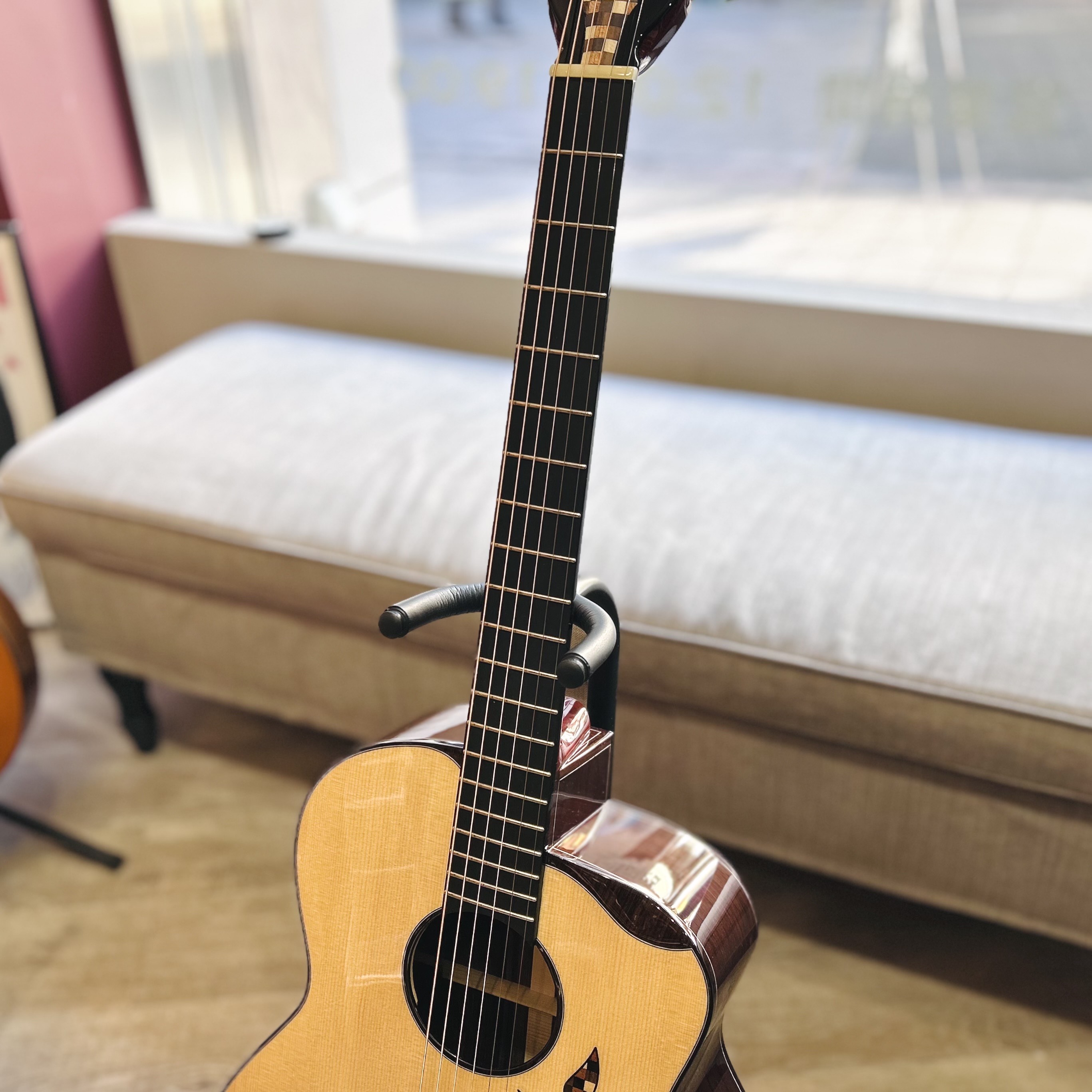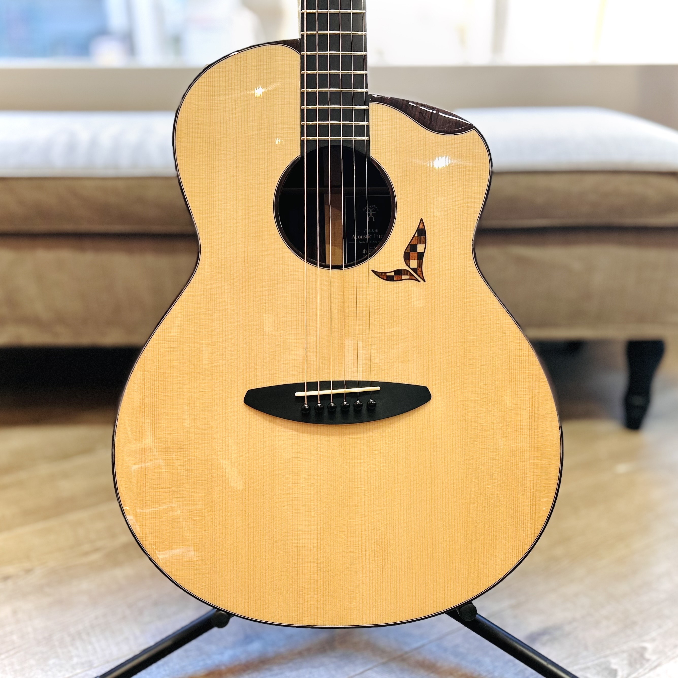 トップは、厳冬期の新月のタイミングにのみ切り出す、希少な白く美しい最上級ムーンスプルース、サイドとバックは、ブラジリアンローズウッドに似たサウンド特性を持つと言われる高級材マダガスカルローズウッドで木目もすごくきれいです。ネックは、良質な南米産マホガニー、フィンガーボードとブリッジは、黒く締まったエボニーと豪華なウッドマテリアルとなっております。