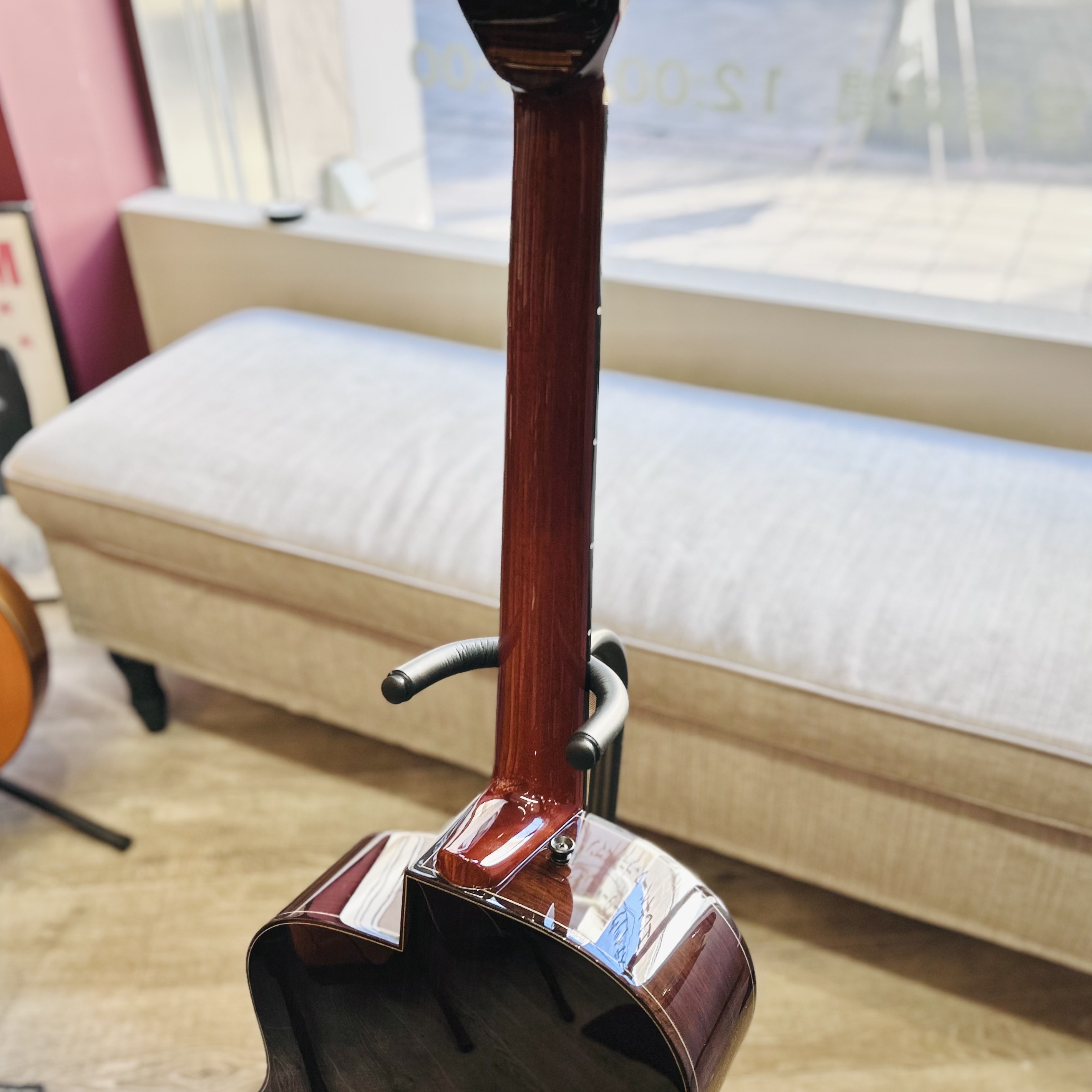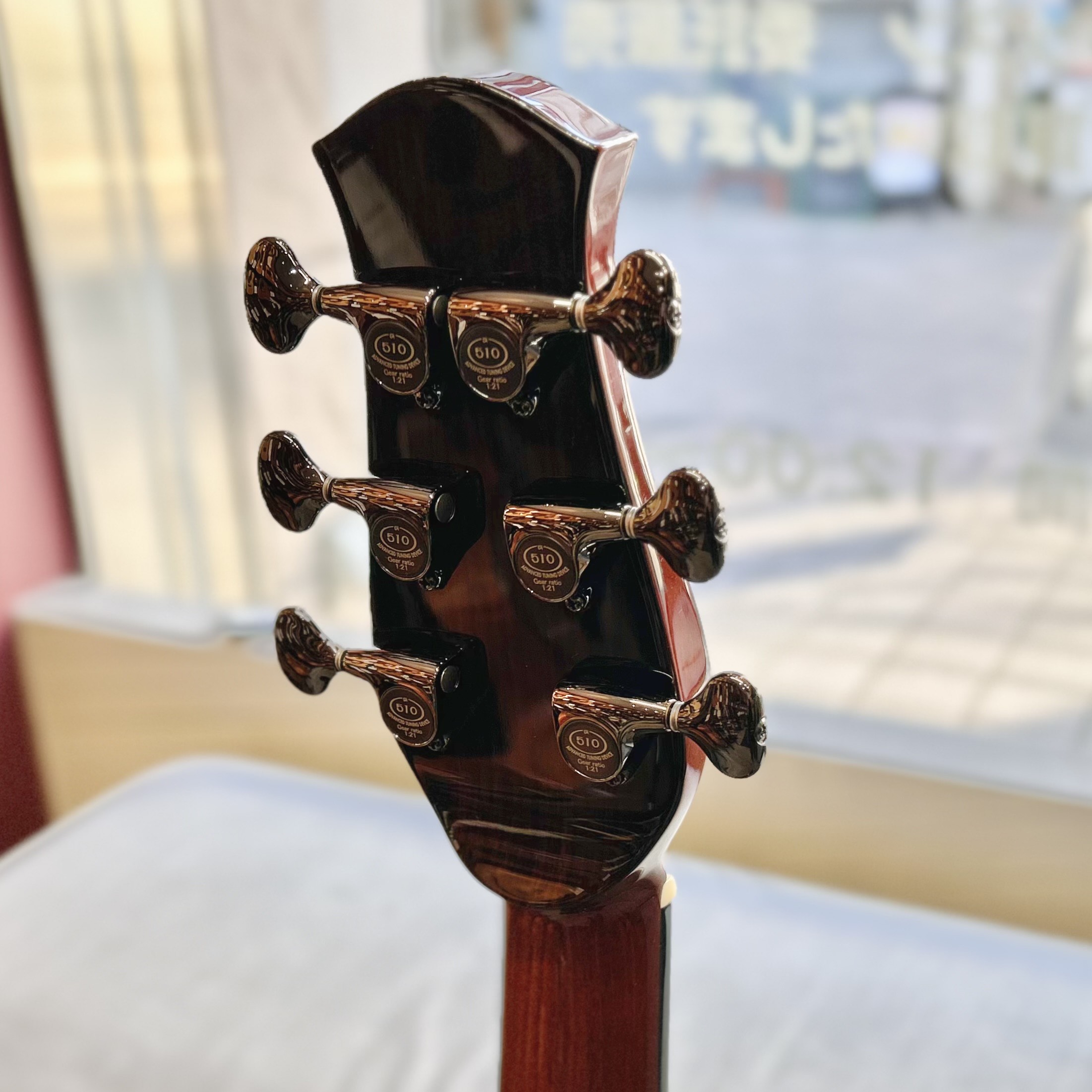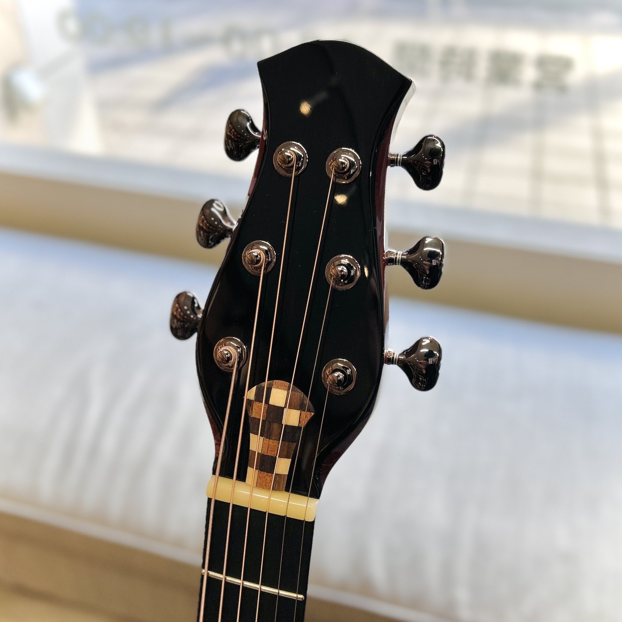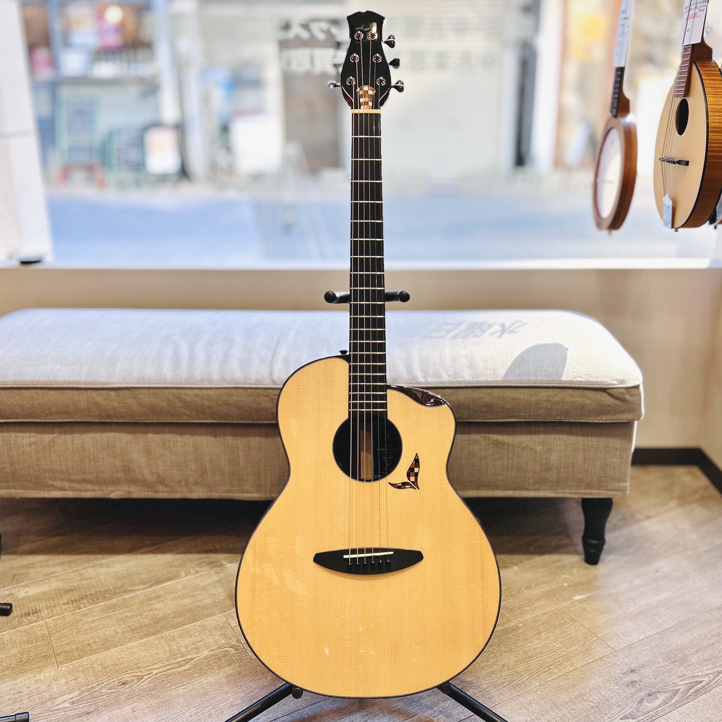 ボディスタイルはOMに近いサイズですが、胴厚はしっかりと取られており、音量豊かで、表現力にも長けております。そしてアヌエヌエと言えばオフセットサウンドホールが特徴ですが本機は、トラッドなセンターサウンドホールが採用されております。これによりピックアップ選択の幅も広がりました。ネックまわりにつきましては、44mmナット幅で、程よい厚みの馴染みやすいラウンドシェイプです。プレイ面では、美しい波形のカッタウェイがハイフレット上での演奏性も高めてくれています。チューナーは、人気のギア比1:21のゴトー510シリーズを搭載しておりチューニングもストレスなく行えます。