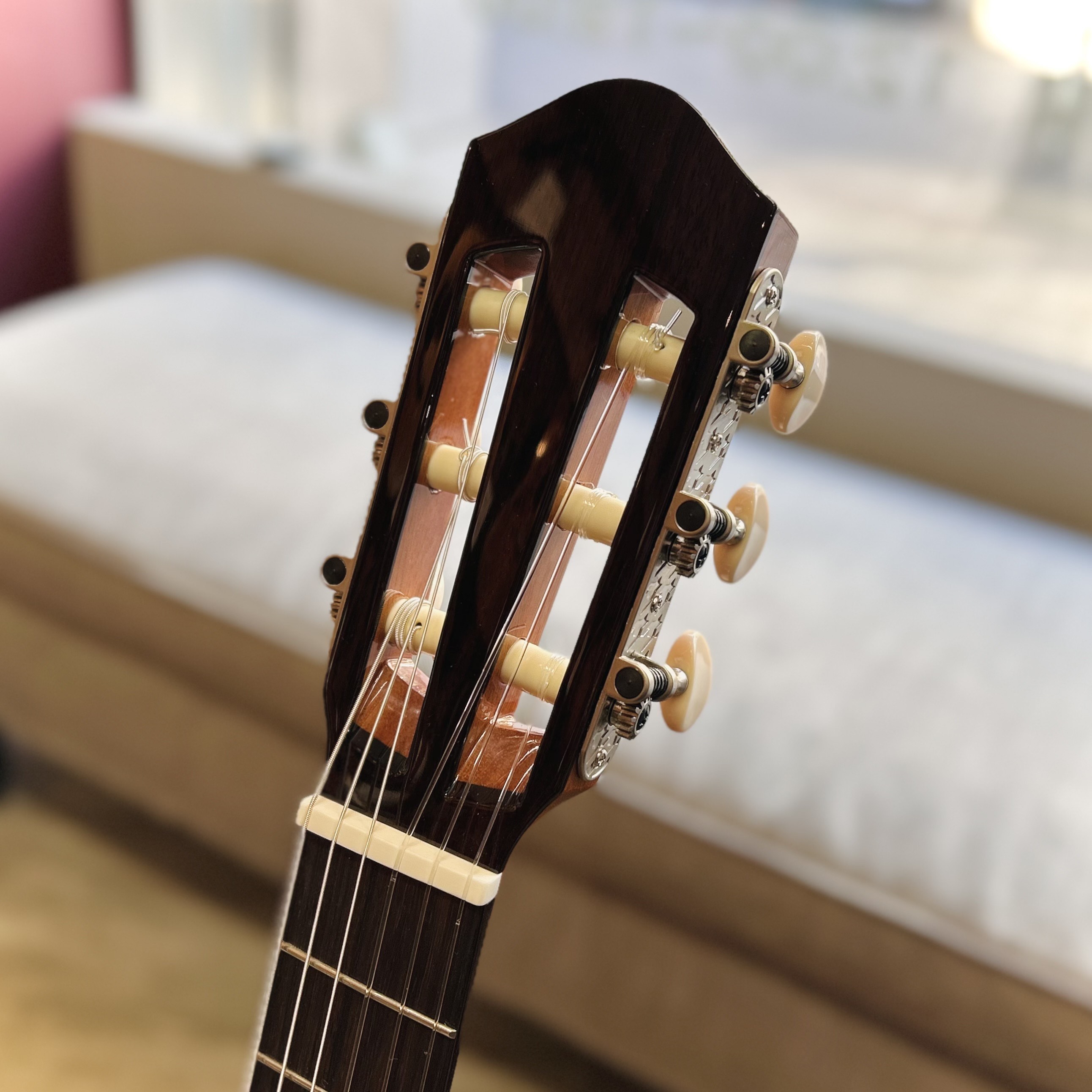 ウッドマテリアルにつきましては、イングルマンスプルーストップ、マホガニーのサイド、バック、ネック、ローズウッドのフィンガーボードとブリッジです。ネックまわりは、ナット幅は、46ミリで一般的なクラシックギターより狭く、程よい厚みで馴染みやすいと思います。フィニッシュは、艶のあるグロス仕上げできれいです。またペグのベースプレートは、千鳥柄が入っていて可愛らしくこのシリーズのポイントになっています。
