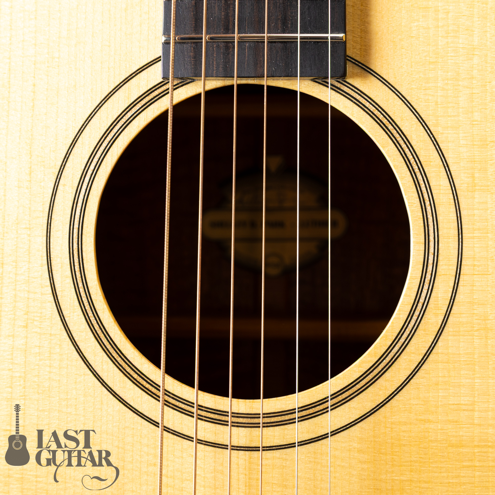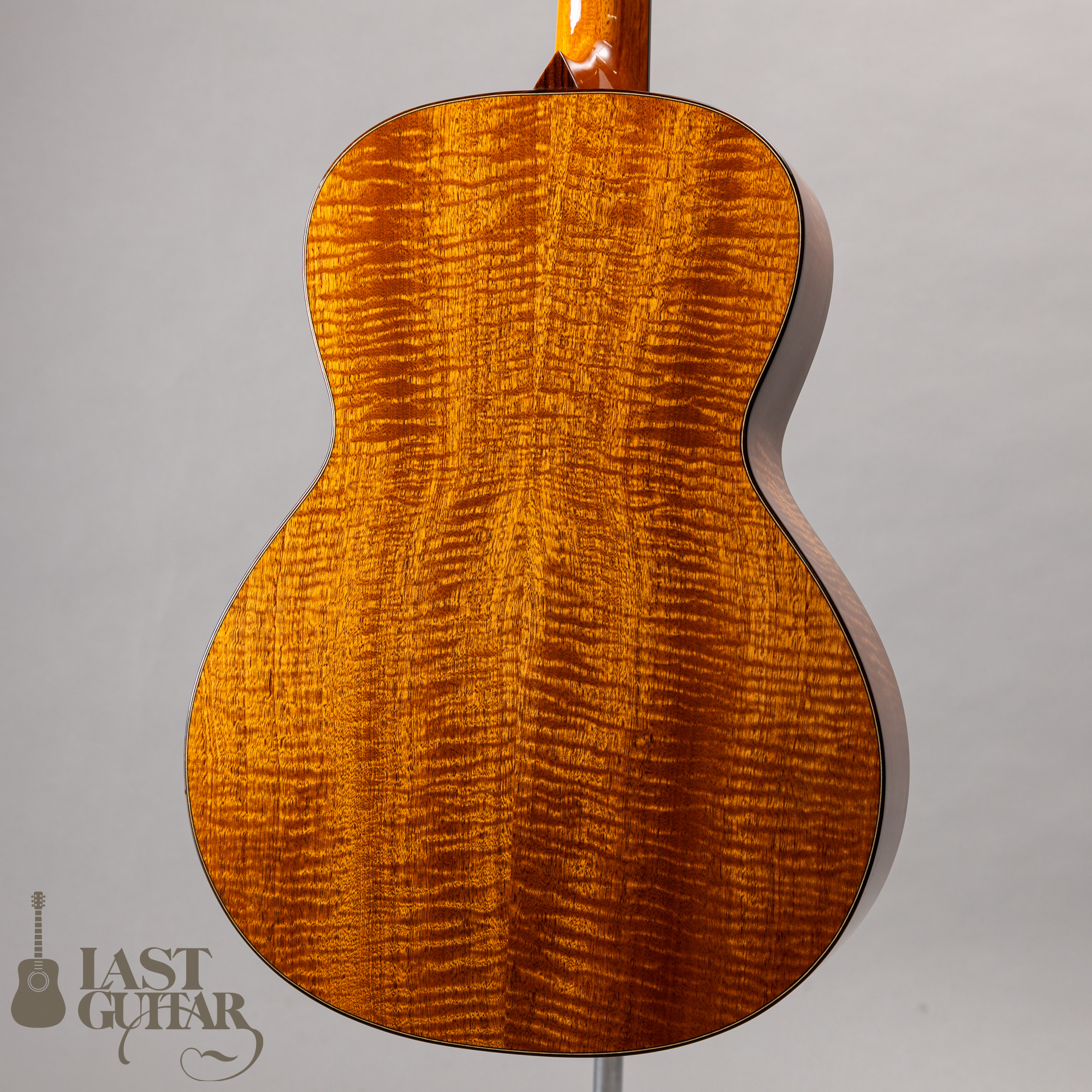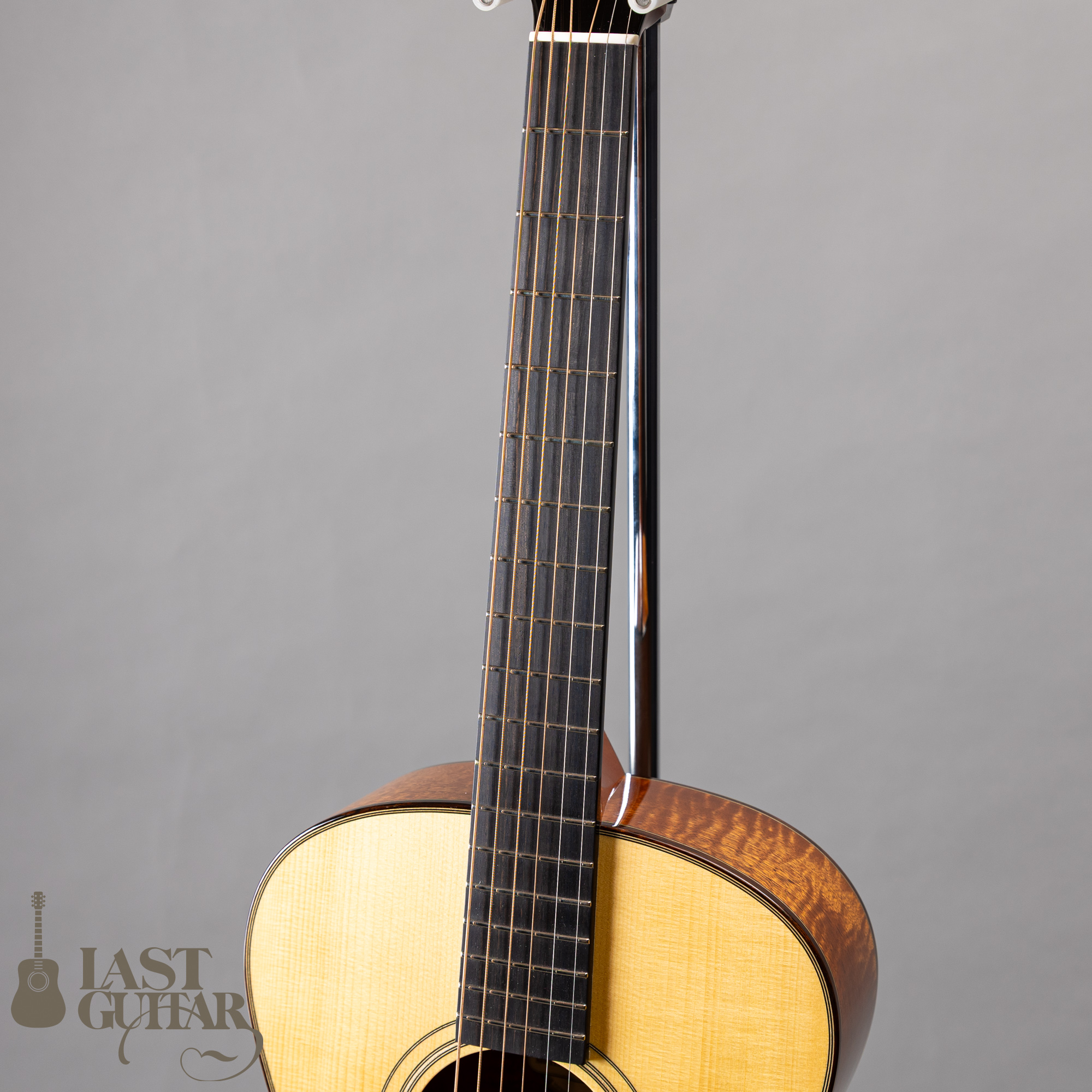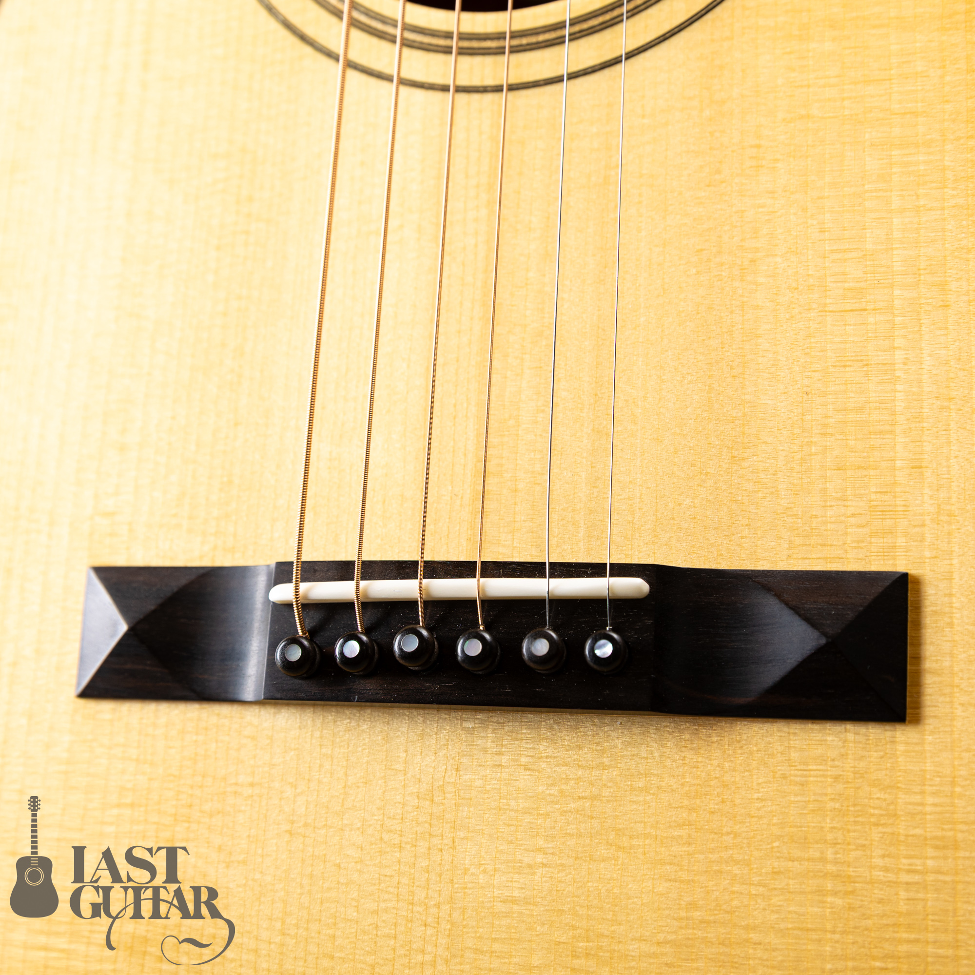 トップには、きれいに杢が入った高級材アディロンダックスプルース、サイドとバックにはギラギラと美しくフレイムの入ったサペリが贅沢に使用されており、シンプルなルックながらも物凄い存在感を放っております。ネックは、良質なマホガニー、フィンガーボードとブリッジは、引き締まった色合いのエボニーでこちらも良質です。ピラミッドのブリッジもまたオールド感があって良い雰囲気です。ブレイシングは伝統的なXブレイシングで、しっかりとハリのあるサウンドを生み出します。