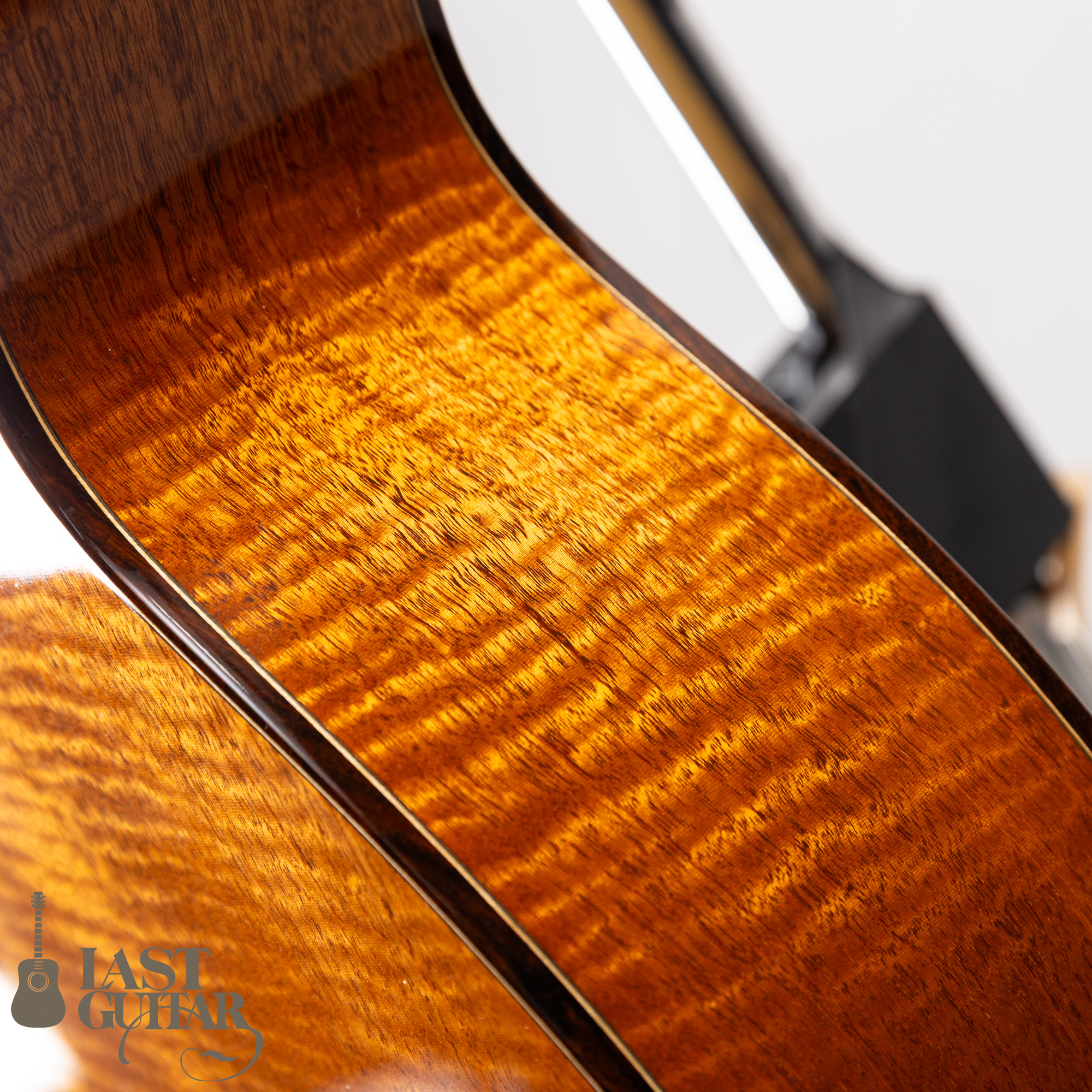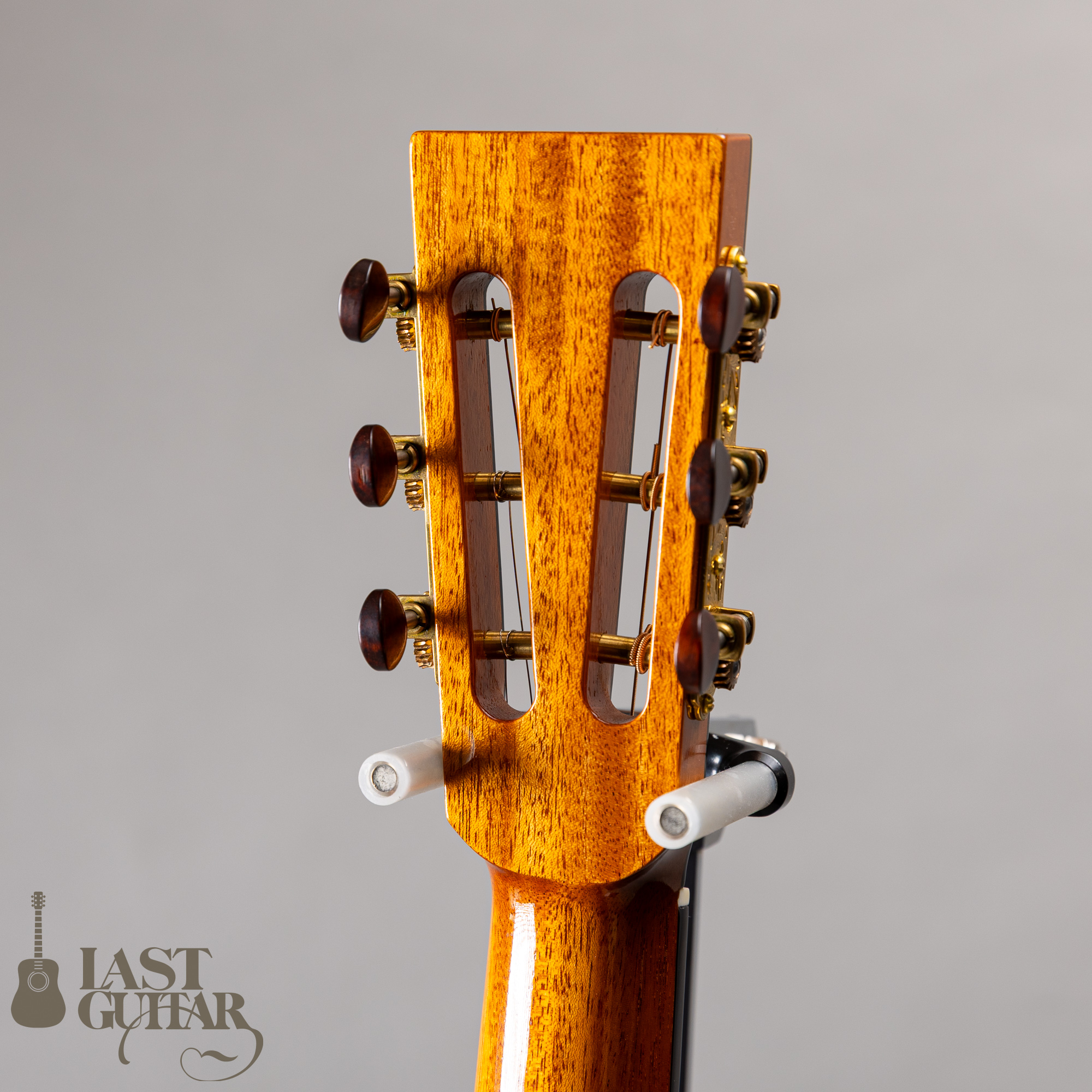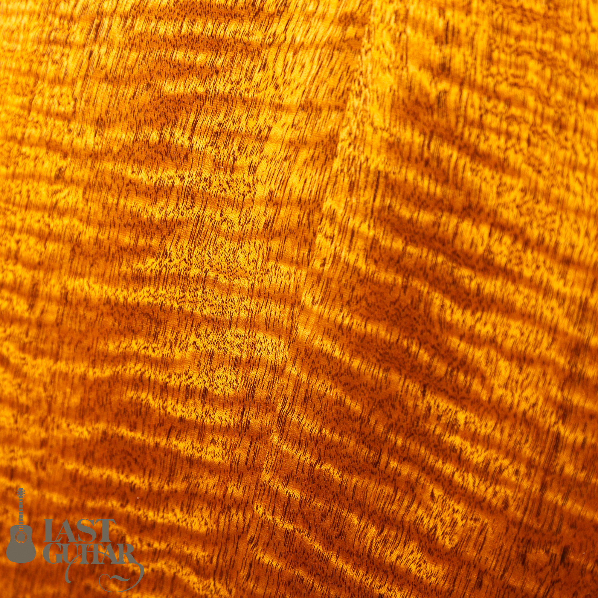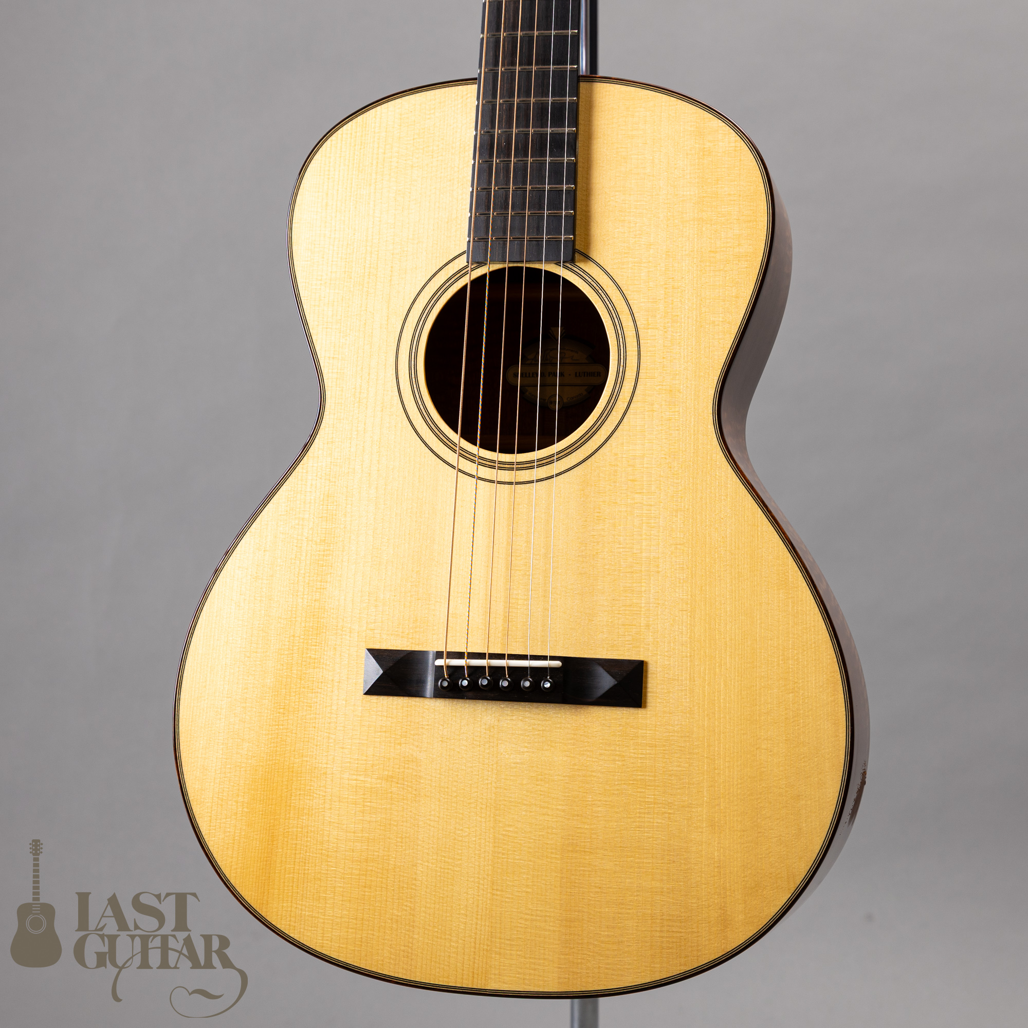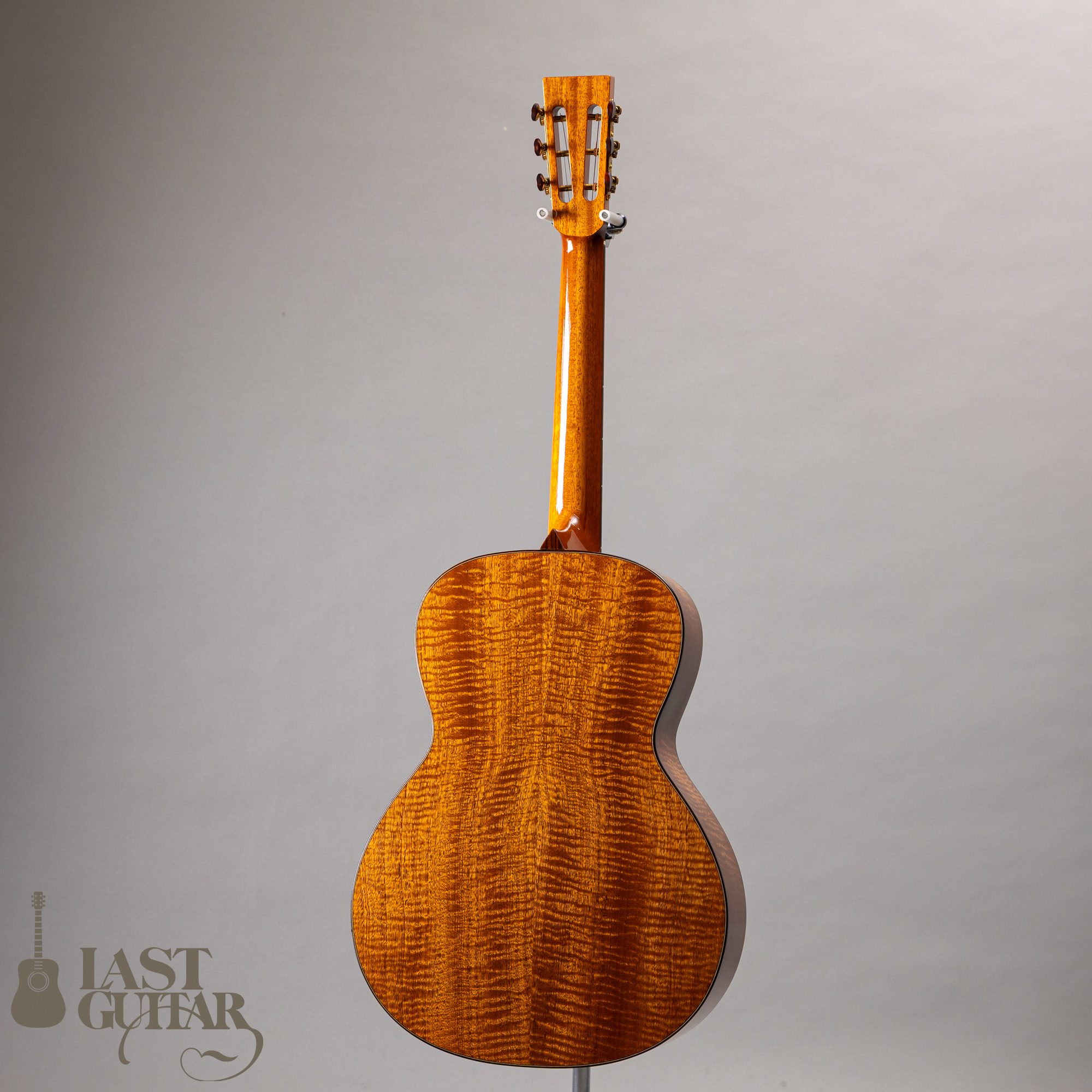 トップには、きれいに杢が入った高級材アディロンダックスプルース、サイドとバックにはギラギラと美しくフレイムの入ったサペリが贅沢に使用されており、シンプルなルックながらも物凄い存在感を放っております。ネックは、良質なマホガニー、フィンガーボードとブリッジは、引き締まった色合いのエボニーでこちらも良質です。ピラミッドのブリッジもまたオールド感があって良い雰囲気です。ブレイシングは伝統的なXブレイシングで、しっかりとハリのあるサウンドを生み出します。