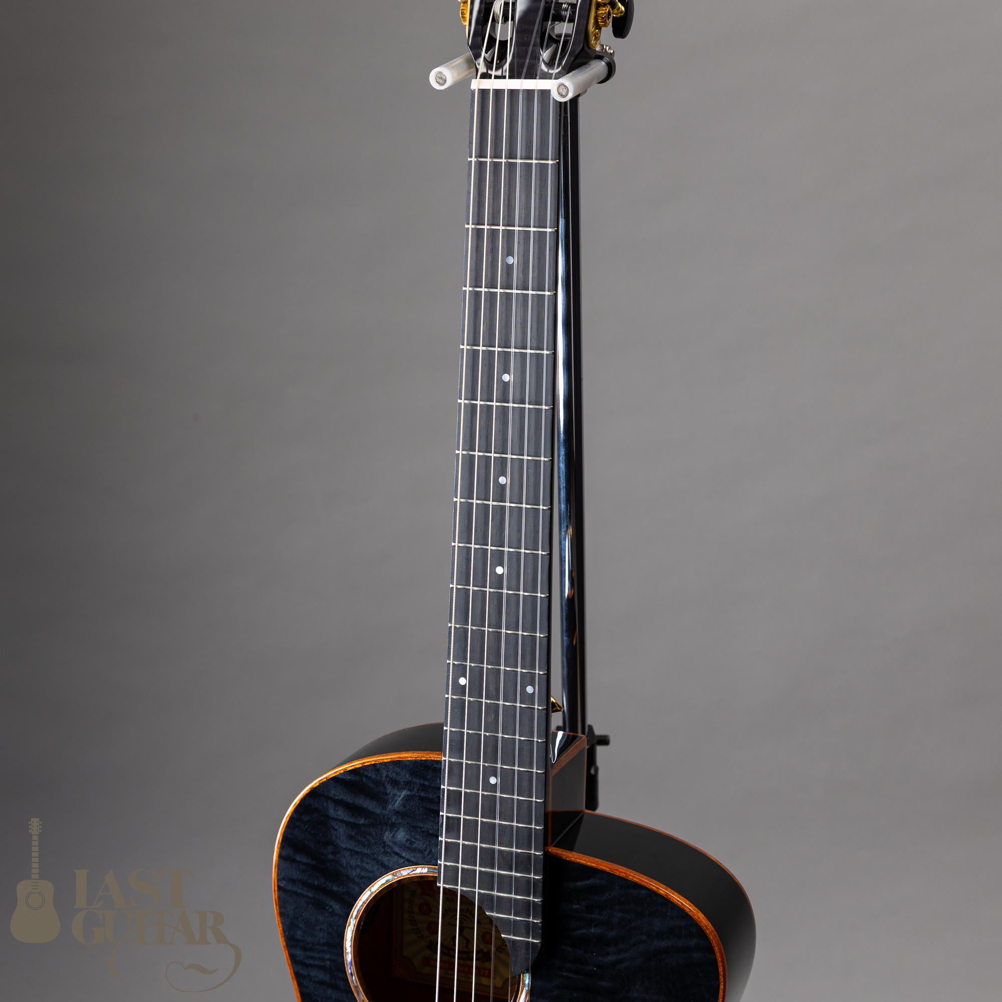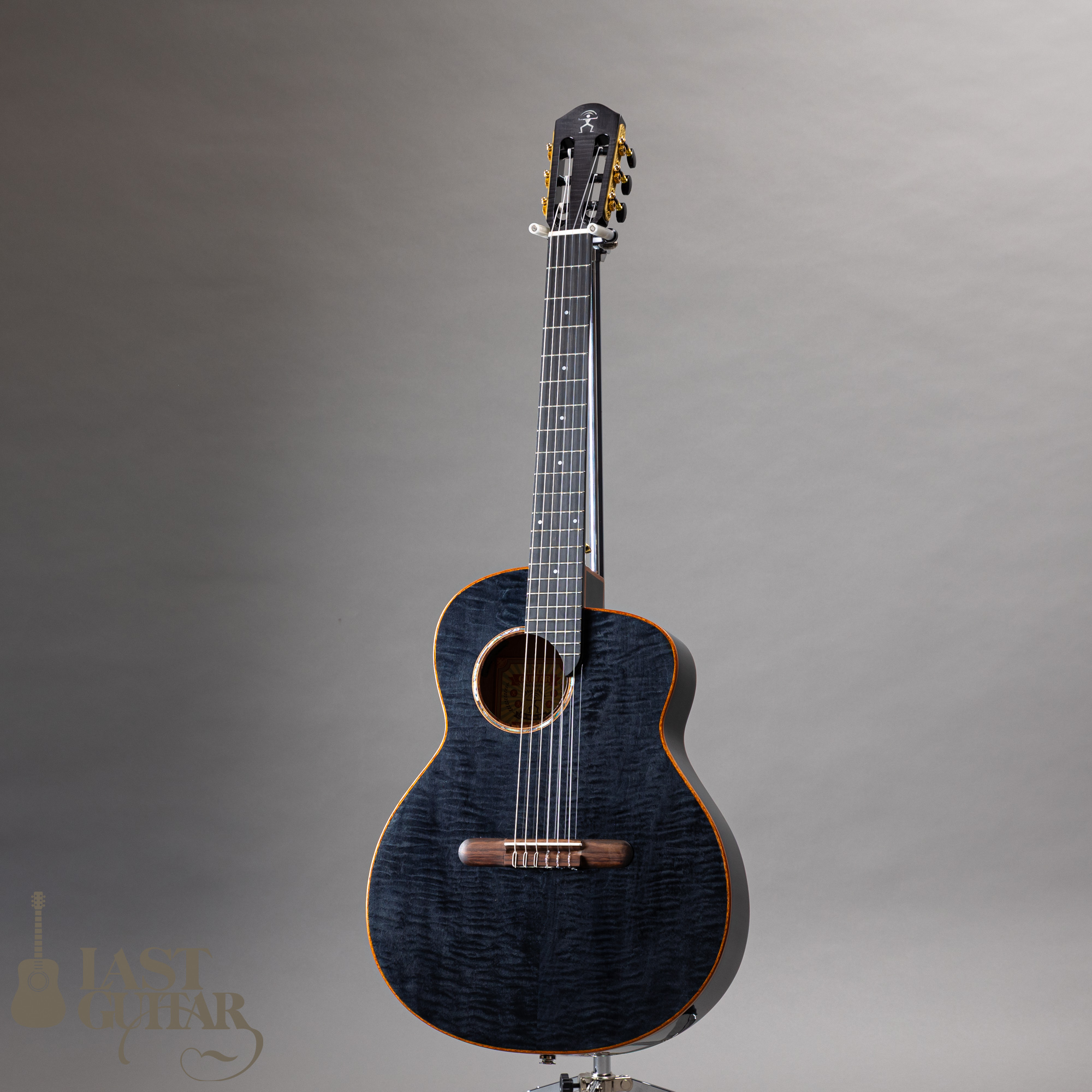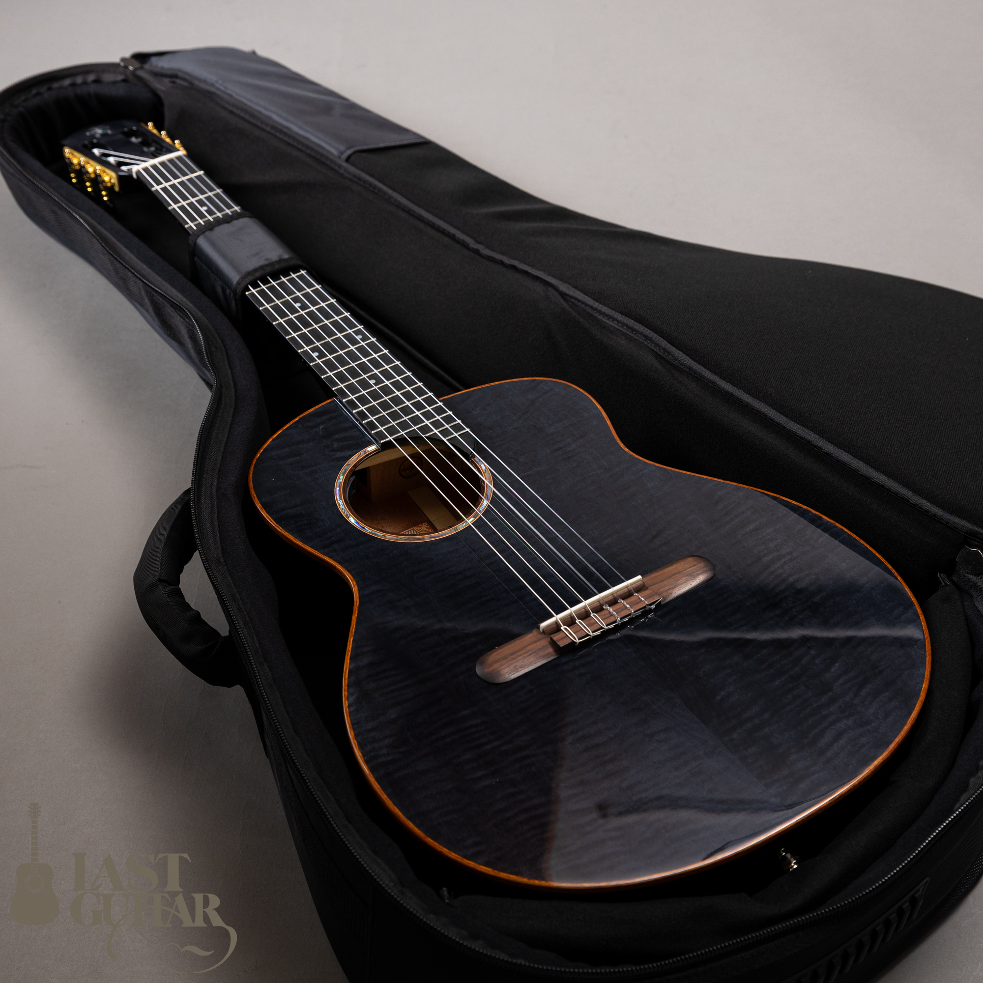 カーリーメイプルをシダー材の表面に使用、シースルーブラックカラーとの組み合わせでステージ映えする美しいルックスに仕上がっています。サイドとバックには、さりげなくラメが入っているのも良いですね。またウッドバインディングも高級感もあります。