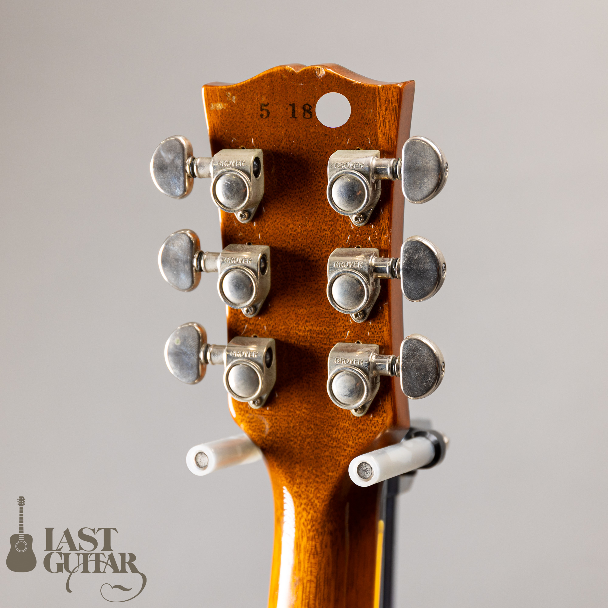 ピックアップは、フロントは、ギブソンの57クラシックに、リアは、ダンカンのSeth Loverに、ペグは、グローバーに交換されておりますので、こういった仕様がお好みの方にはお勧めです。またトラスロッドカバーが交換、ピックガードの取り付けがございますが、引き締まった印象のルックになりますのでこれはこれで良いと思います。