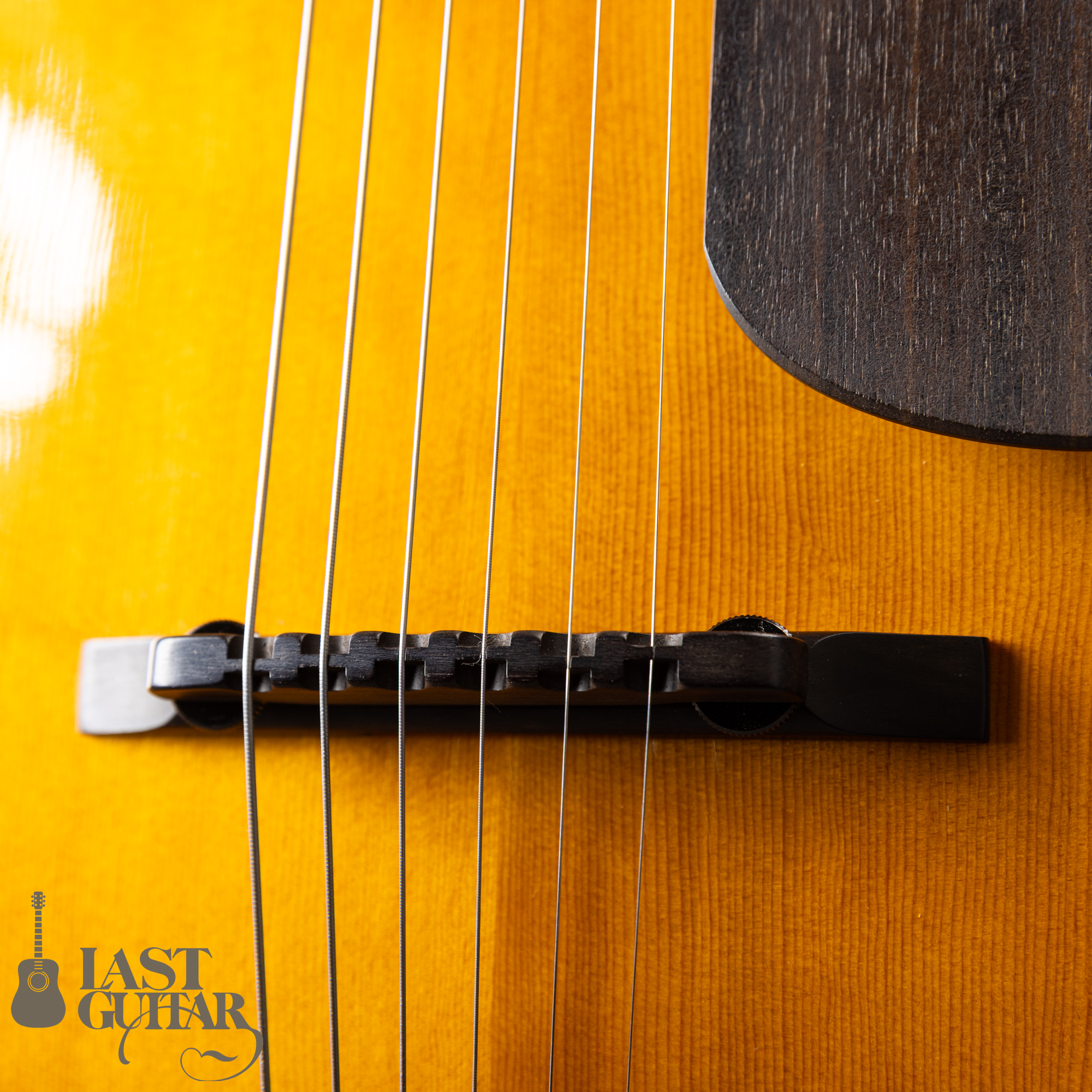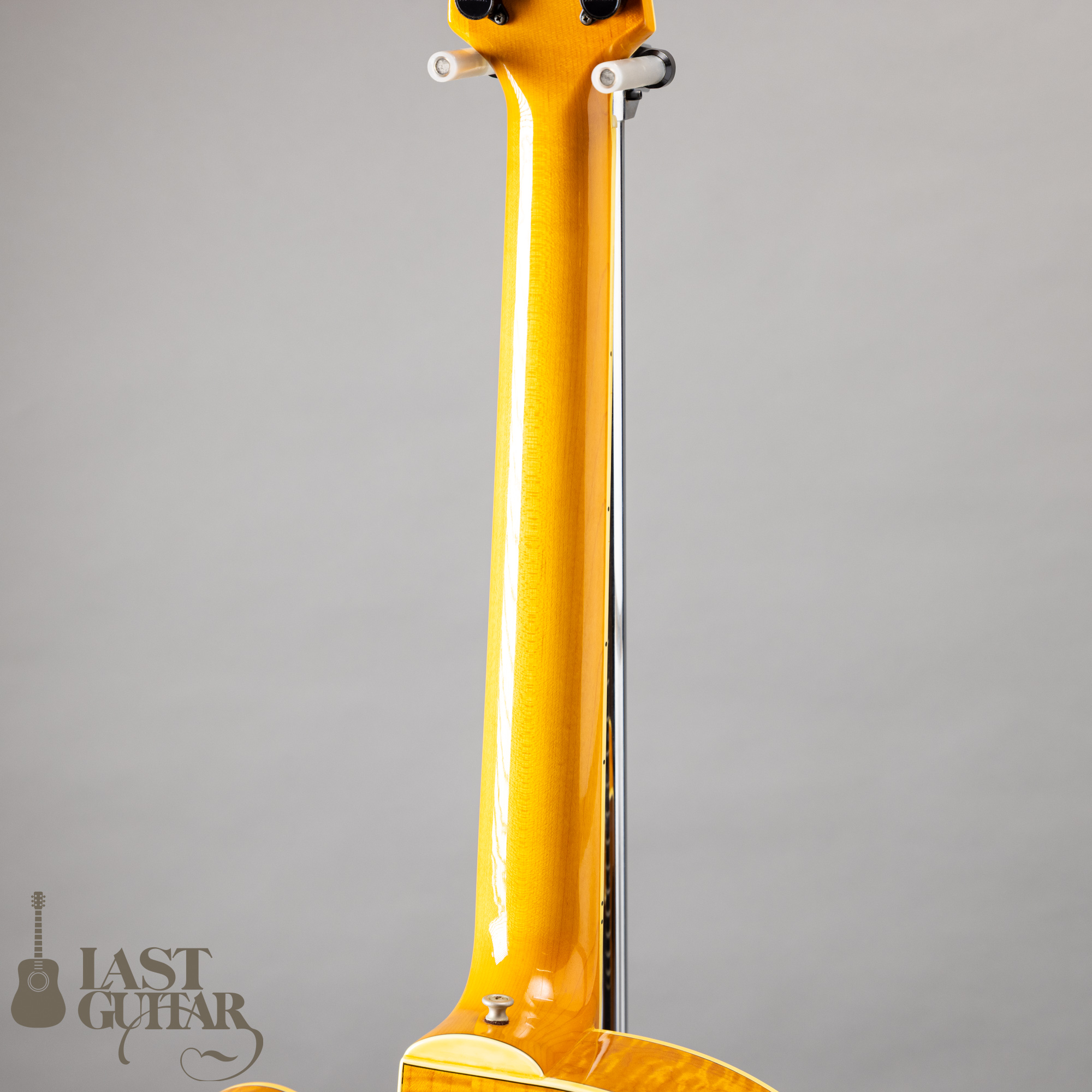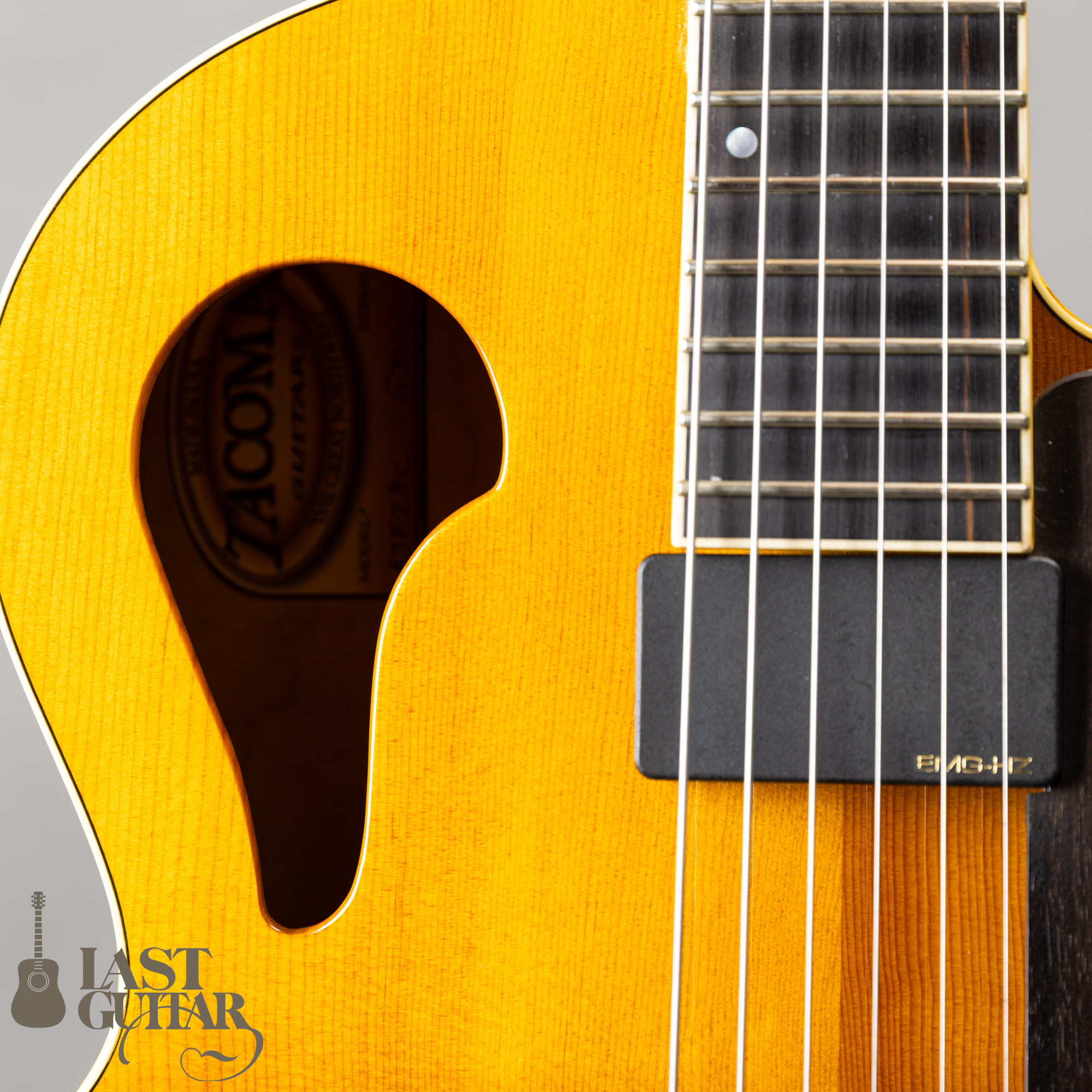 本機は、国内市場ではほとんど見かけることがないレアな16.875インチボディワイド、タコマのアーチトップ・ラインの最上位モデルです。美しいナチュラルフィニッシュで、タコマ特有のアッパーベースバウトに配置されたペイズリーサウンドホールが印象的です。