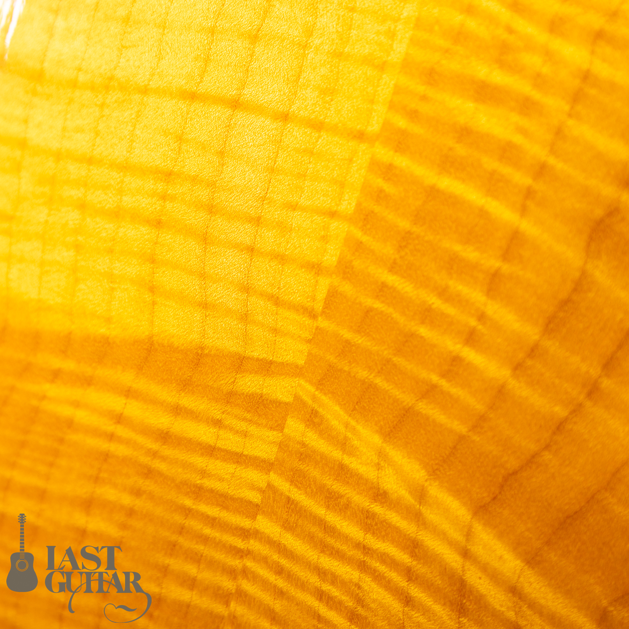オールソリッドボディの仕様で、なかなか雰囲気あるスプルーストップに、杢入りのメイプルサイド・バックは、特に美しくインパクトがあります。ネックは良質なメイプルで、フィンガーボードは、黒く引き締まったエボニーでオフセットのドットインレイが良く映えています。ブレイシングは、Xブレイシングで、しっかりとした出音を生みます。ネックまわりは、約42.9mmで、程よいラウンドシェイプで馴染みやすいです。ピックアップは、フローティングEMG-HZハムバッキングピックアップを搭載しております。コントロールは、ピックガード裏に、ディスクタイプのボリュームとトーンコントロールが付いております。