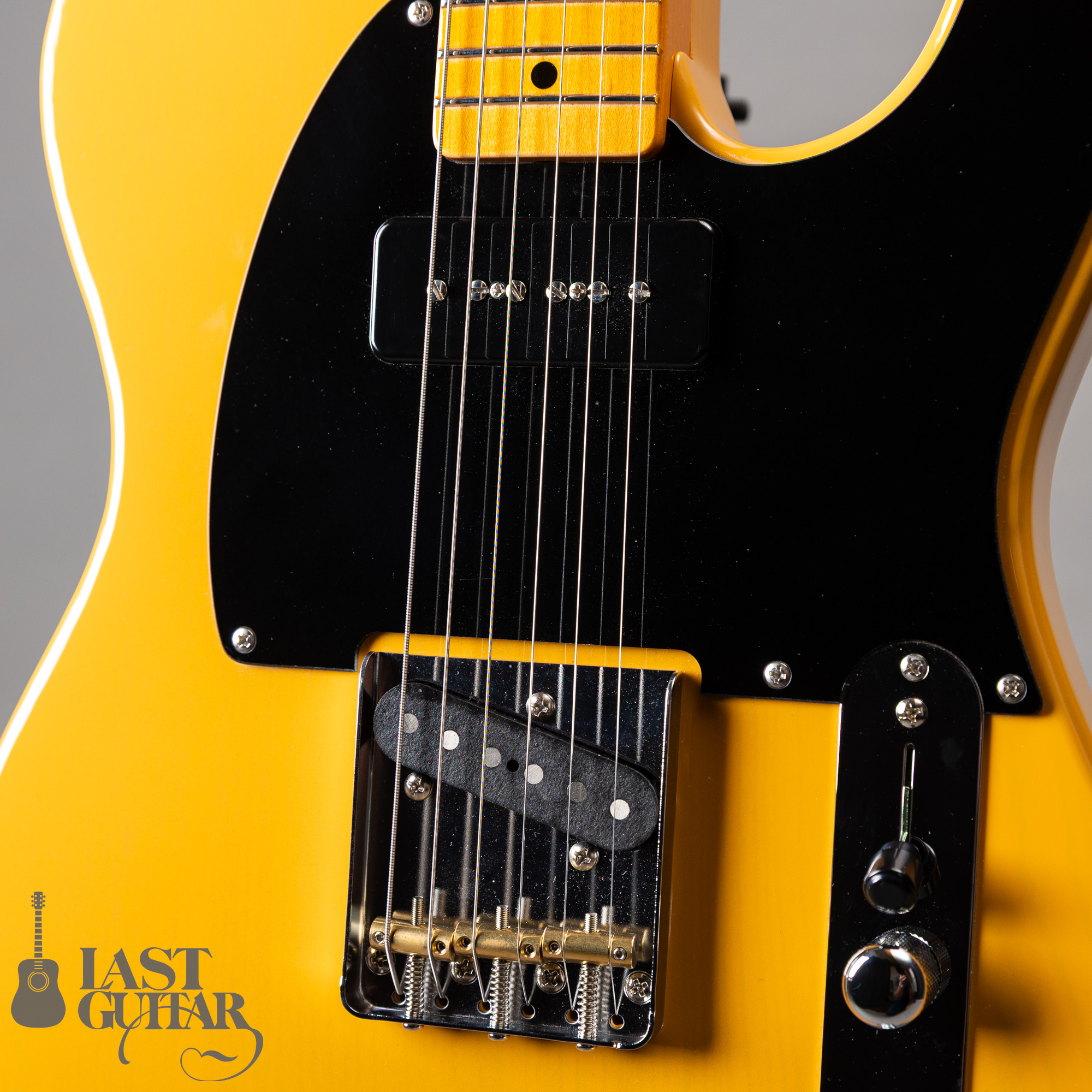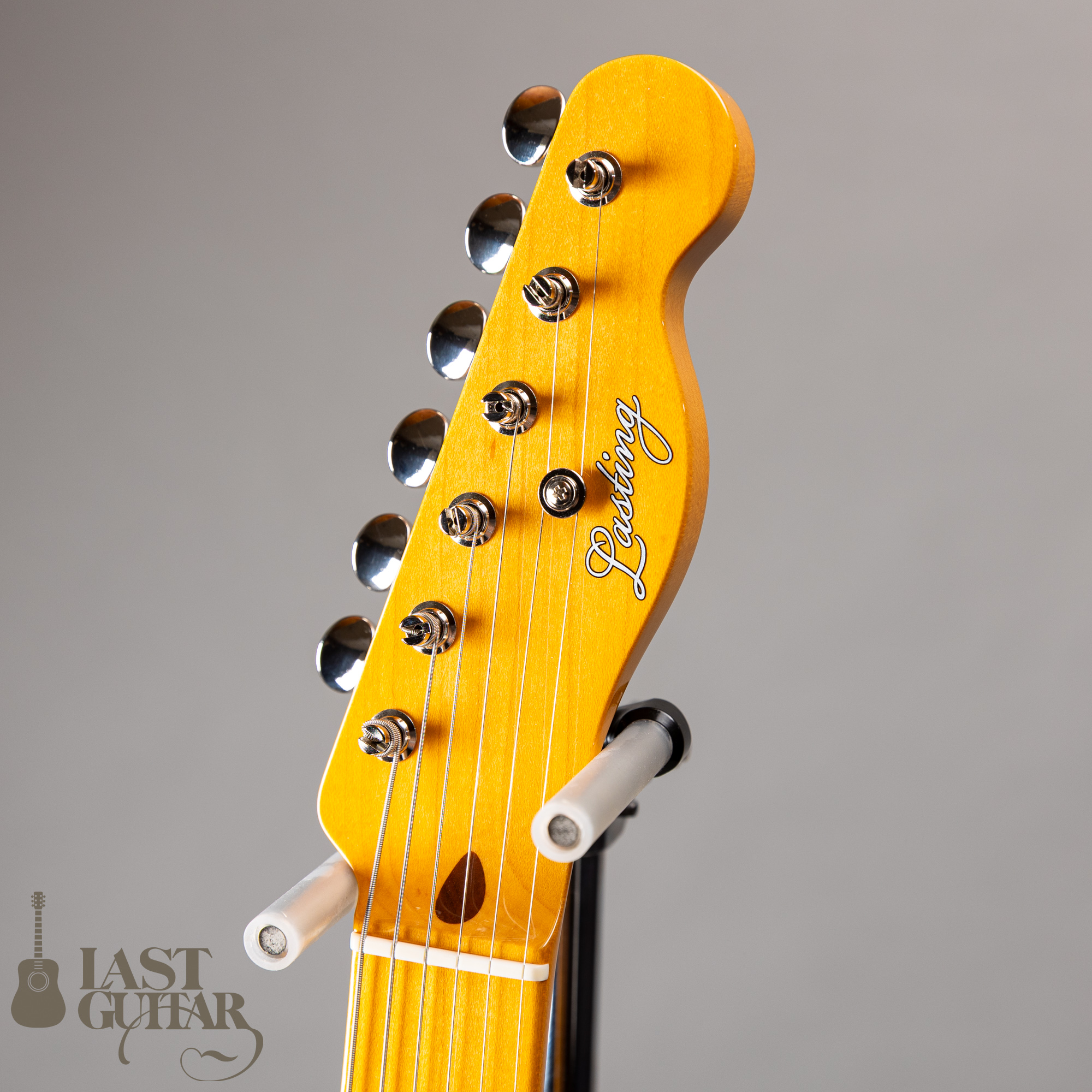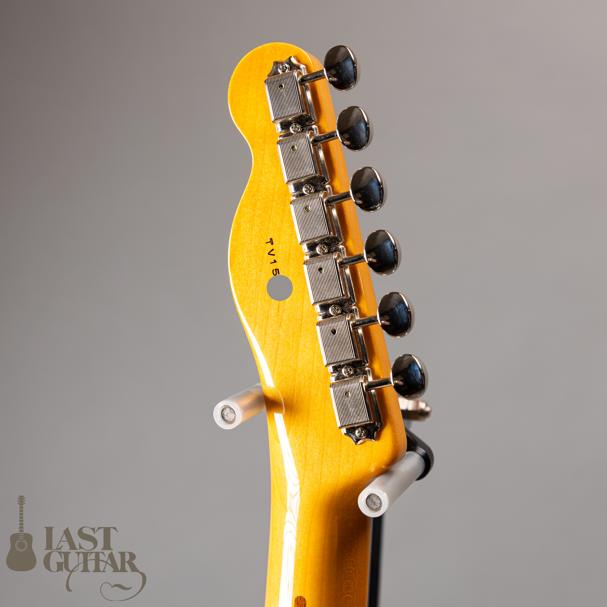 まずなんと言ってもボディーにライトアッシュ材を採用しておりウェイトが約3.1kgとソリッドギターとは思えないほど軽量です。ホロウボディーのギターを使用されている方でもストレスなく演奏をお楽しみいただけます。ルックスに関しましてはまろやかなバタースコッチブロンドカラー、ベークライト素材を使用した5点留めのブラックピックガード、メイプル指板、50年代を彷彿とさせるヴィンテージスタイルで当店のこだわりを詰め込んだルックスとなっております。塗装の質感も良く艶っとしたボディーにブラックガードがマッチしており非常にかっこ良いです。