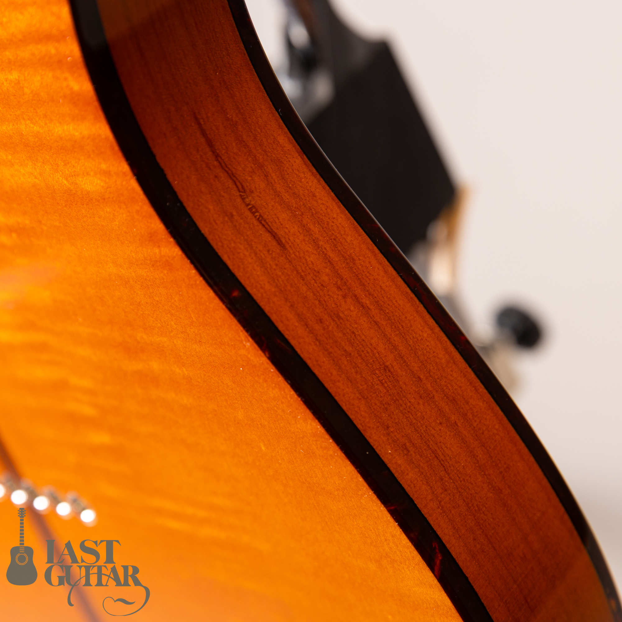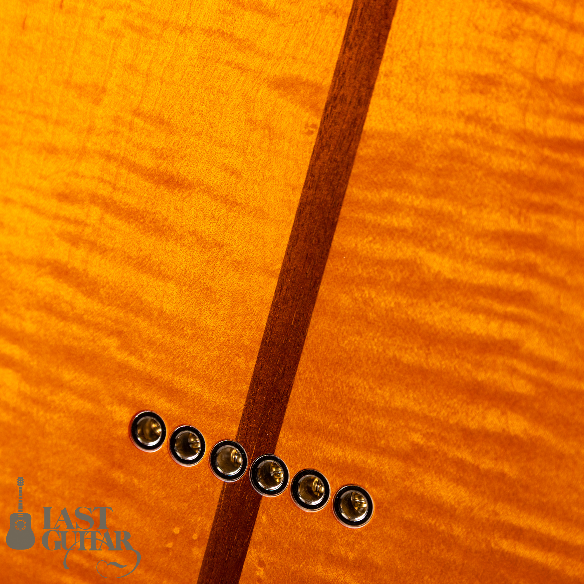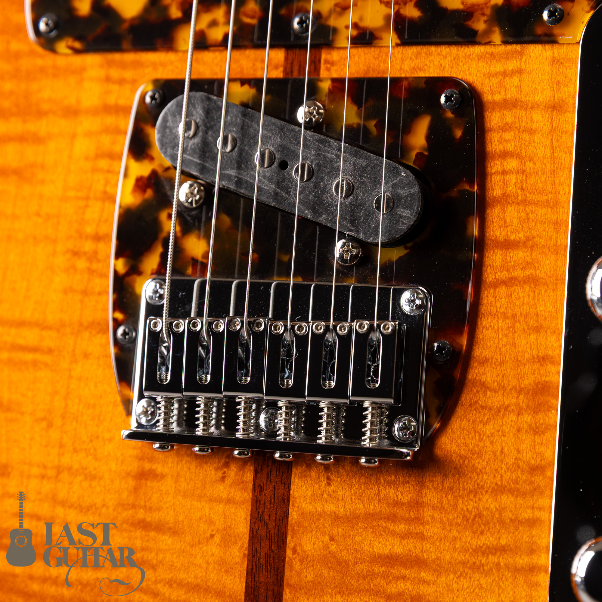 まず目を引くのはこの特徴的なルックスです。個性的なべっ甲柄ピックガードと濃いナチュラルカラーが相まってグッドなルックスです。ボディーマテリアルはトップ・バック共に雰囲気の良いトラ杢のフレイムメイプルを採用しており中にアッシュ材を挟んでおります。ボディーセンターにはウォルナット材を使用したセンターストライプが入っておりかっこ良いです。