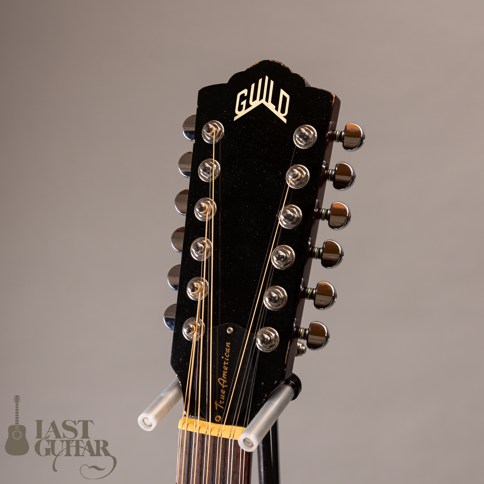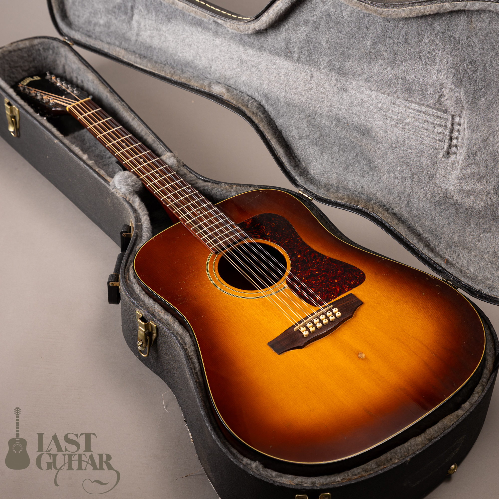 しっかりと弾き込まれた貫禄たっぷりのギルド12弦ギターです。激しめの使用キズやウェザーチェック、サンバーストのフェイド感とカッコいいヴィンテージのようなルックスです。ネック折れのリペアはございますが、現在は問題なくご使用いただける状態です。