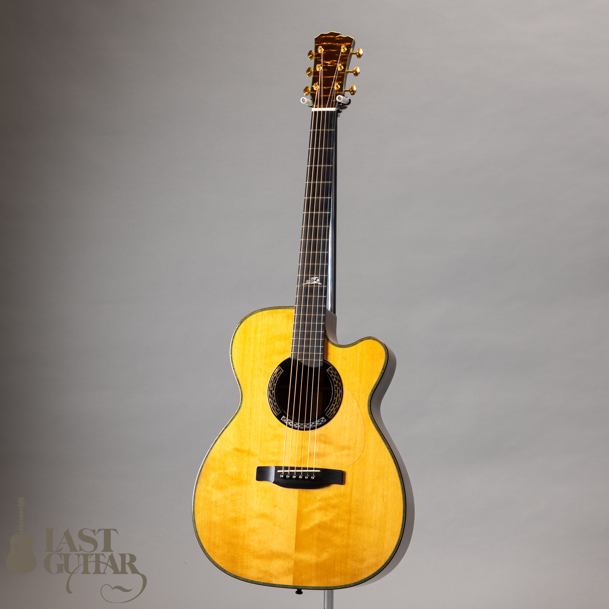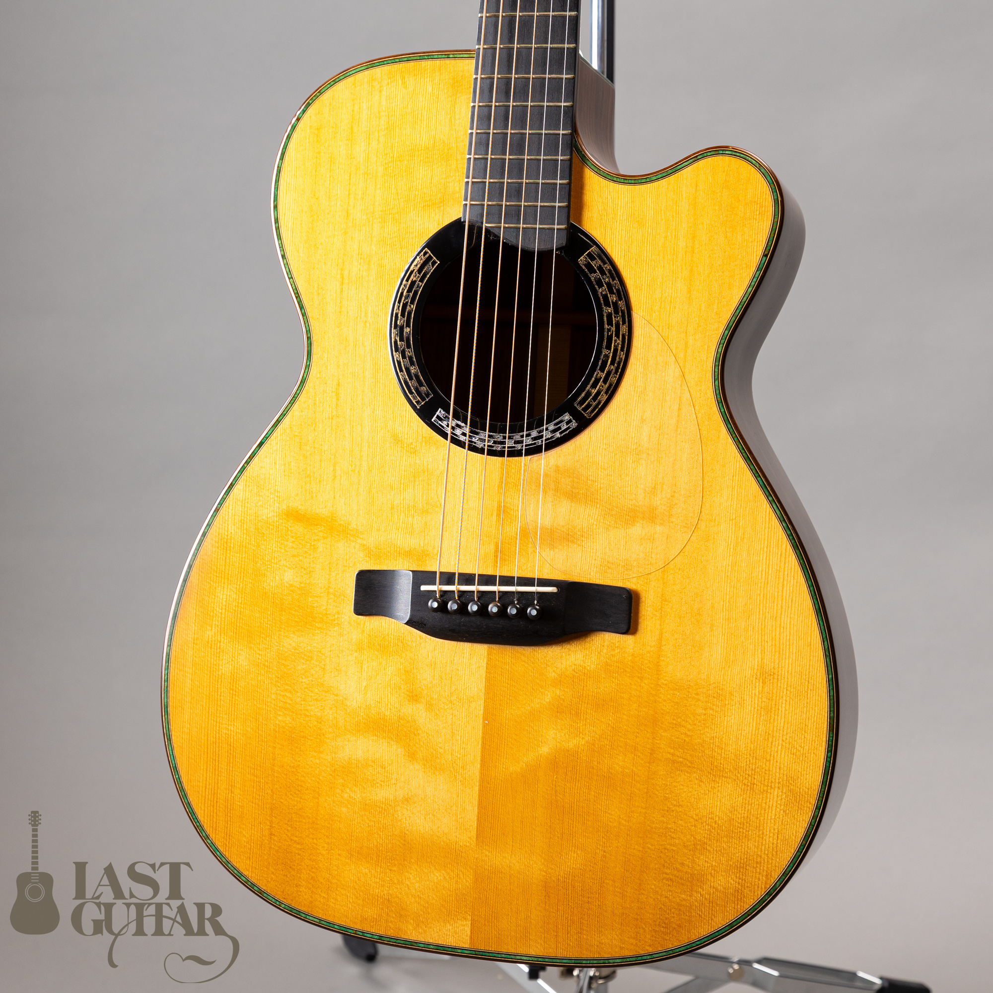 本機は、塩崎氏が全面的に手がけるブランドM.SHIOZAKIで、本漆によるロゼッタ、樺細工のヘッド・プレート、花押風“塩”マークのフィンガーボードインレイ、バックストリップなど和のテイストが印象的なルックスです。ボディサイズは、000と00の中間といったサイズで、抱えやすいです。