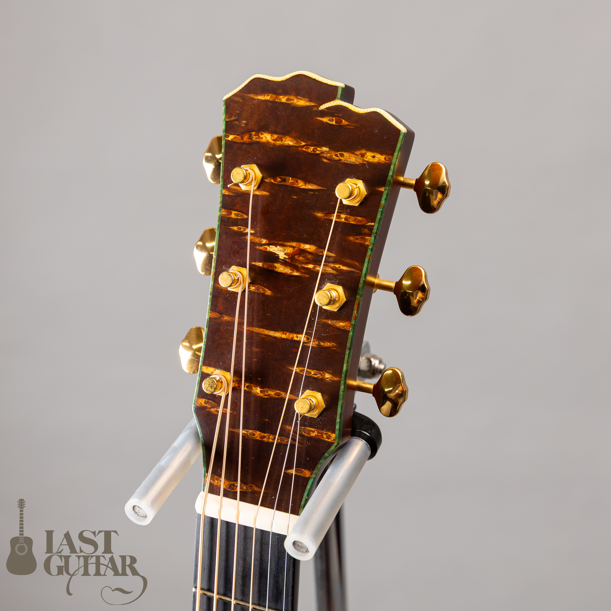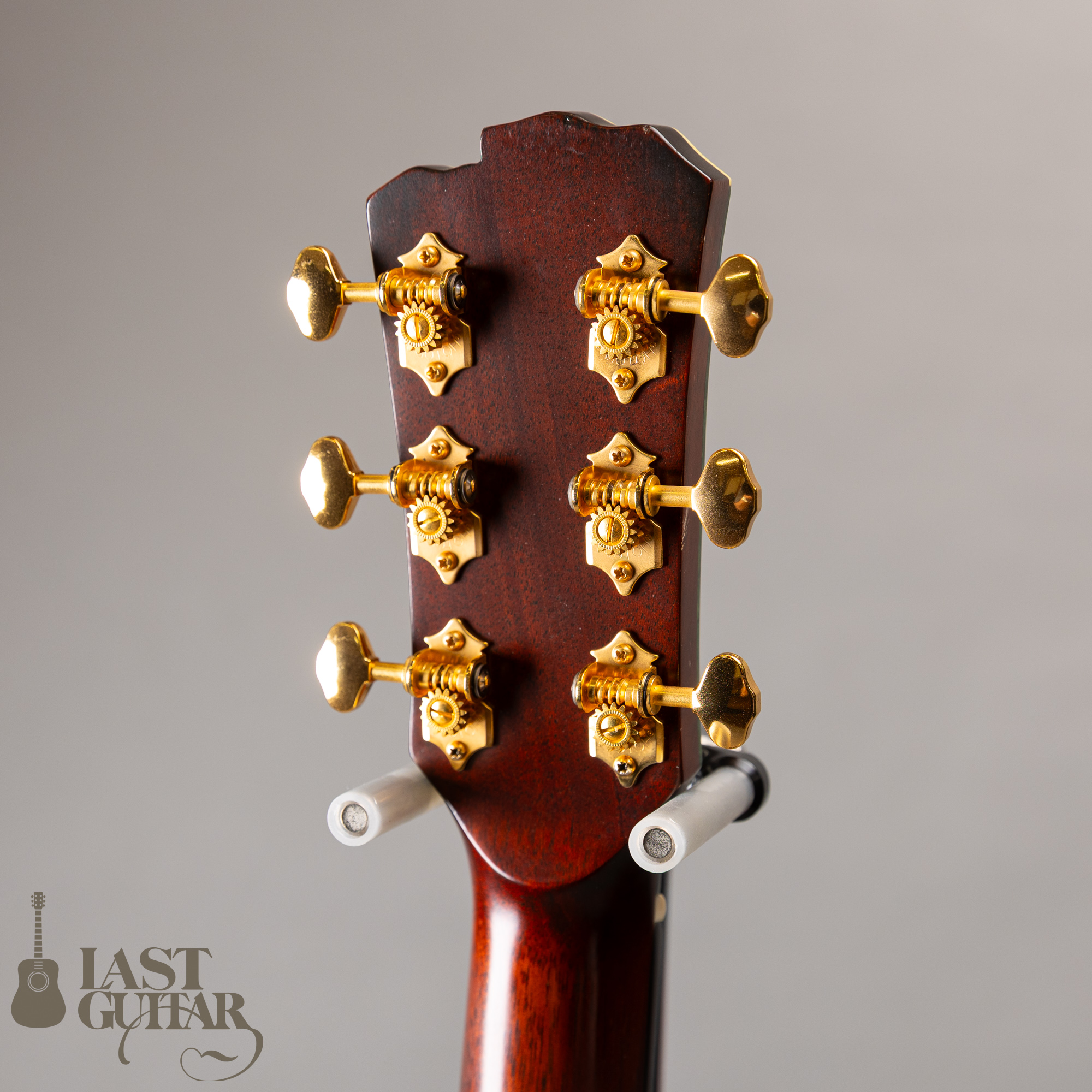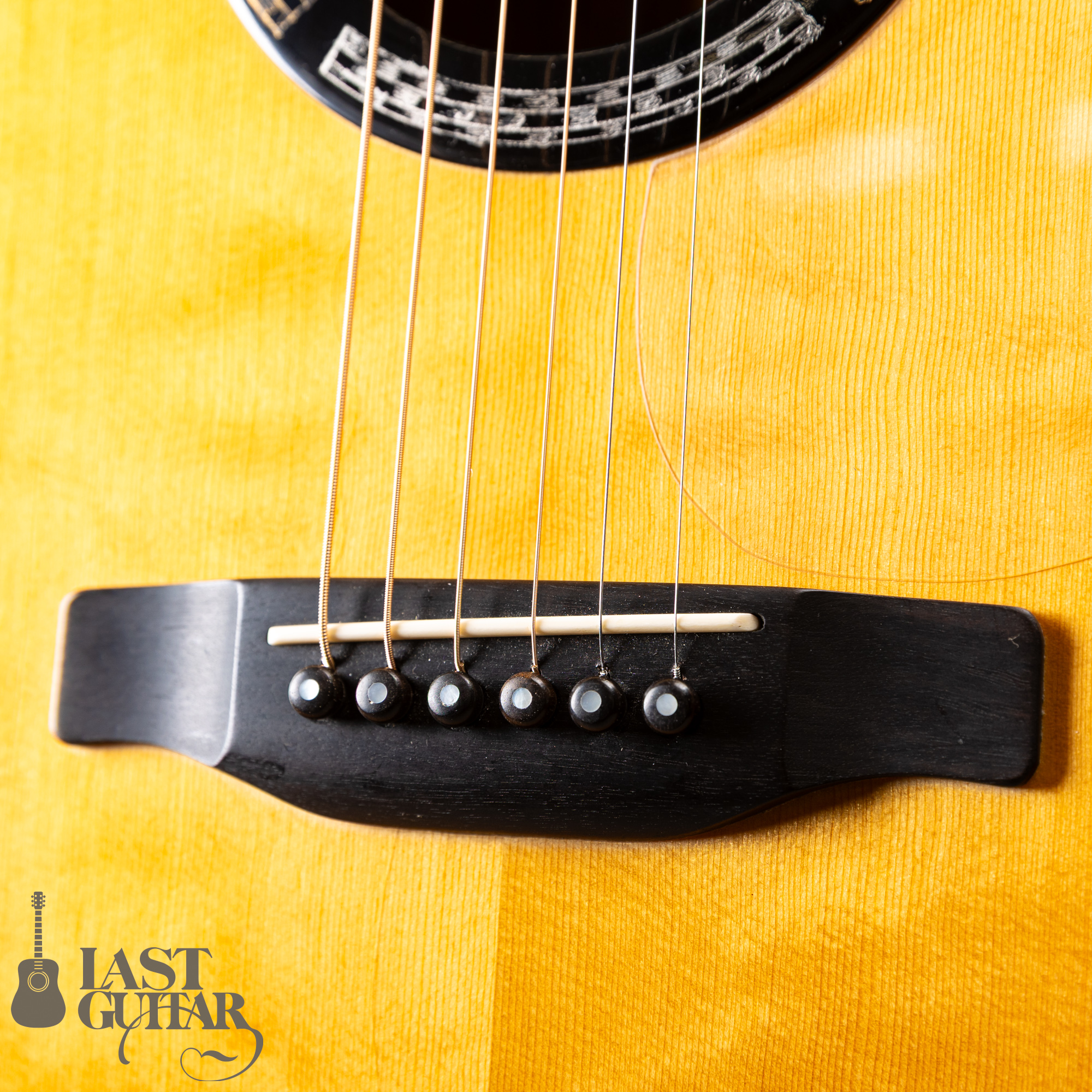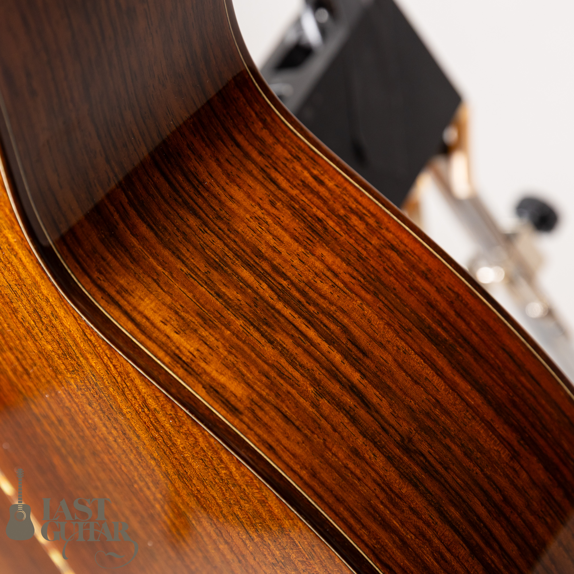 トップは、何とも味わいがある、揺れるような木目を持ったエゾ松で、和のテイストを持ったルックスにもよくマッチしています。サイドとバックのインディアンローズウッドもすごくきれいです。ネックは、密度の高いホンジュラスマホガニーで、フィンガーボードとブリッジは、黒く良質なエボニーです、ネックまわりは、43mmナット幅で、馴染みやすいラウンドシェイプです。ペグは、ゴトーのオープンタイプです。クリアガードが付いています。