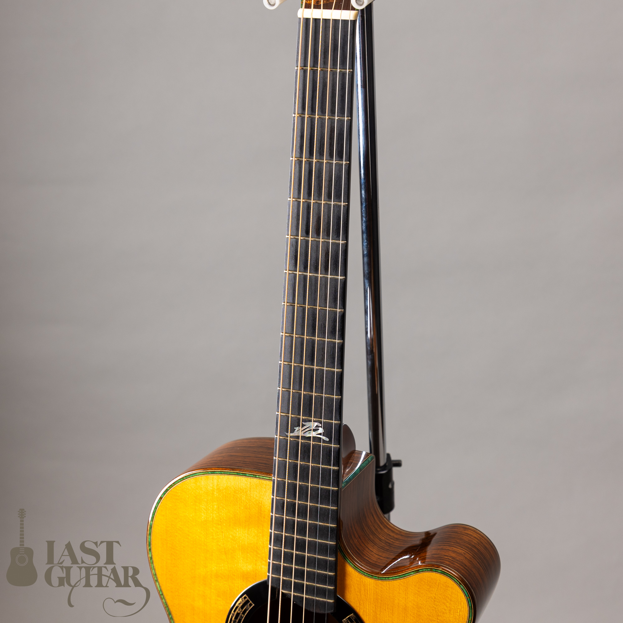 フィンガーボードインレイ:12Fに白蝶貝の花押(かおう)風“塩”マーク