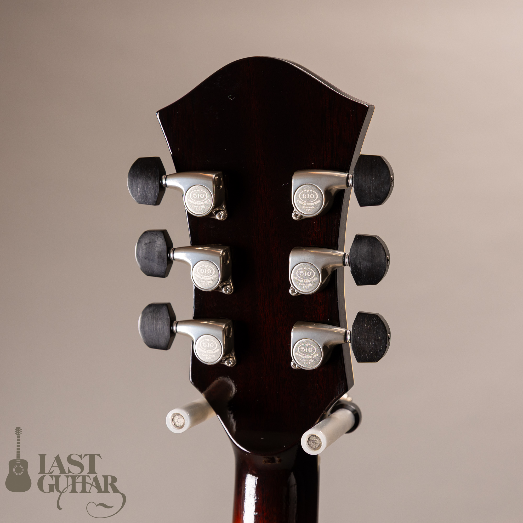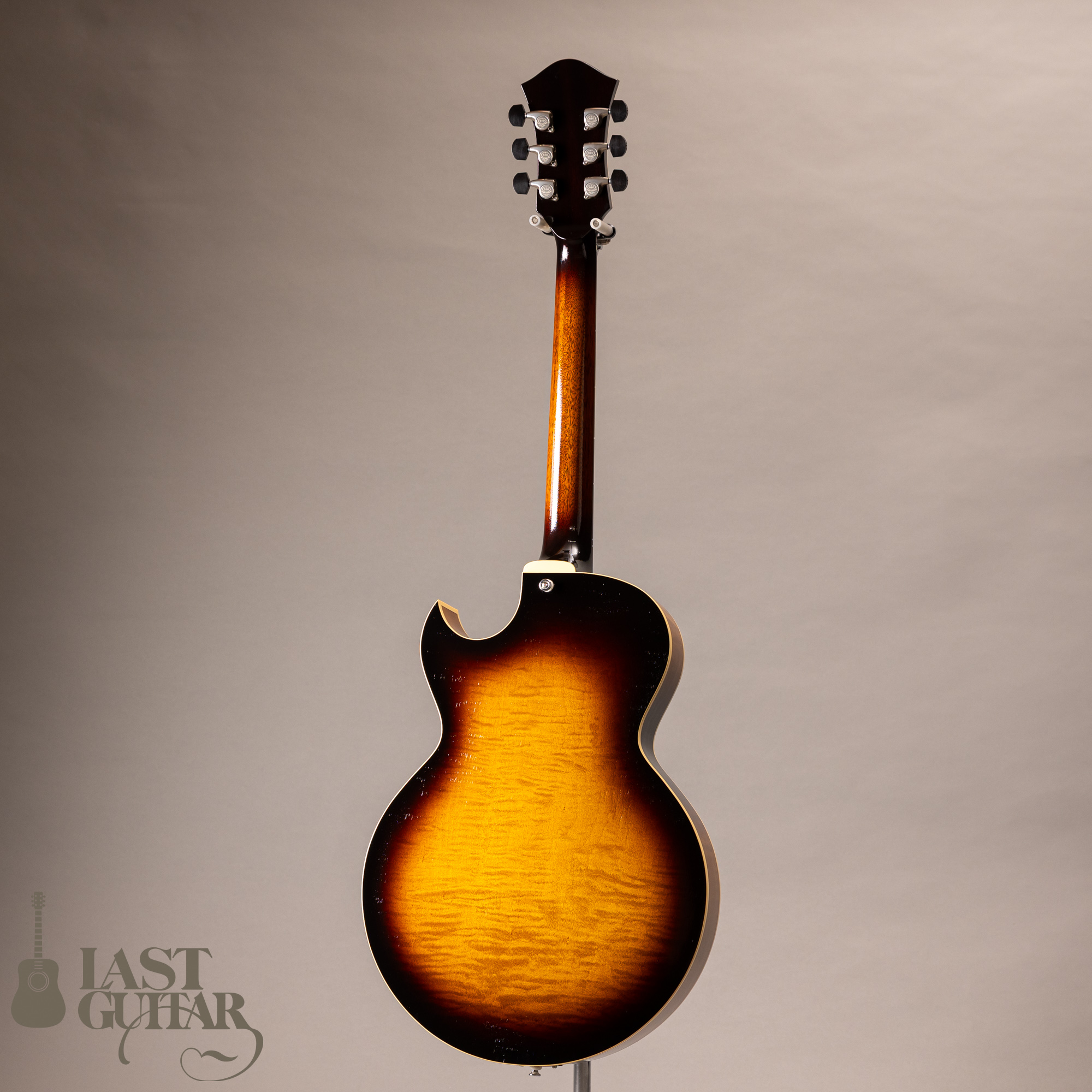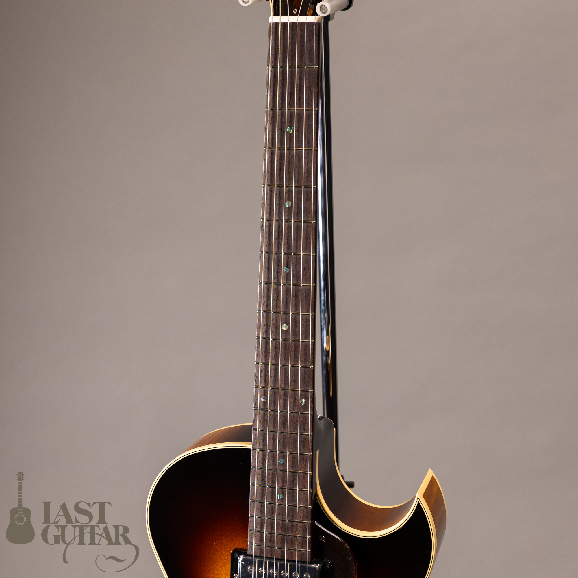 本機は、フローレンタインカッタウェイ、オープン・ポアのラッカーフィニッシュ仕上げの当店特注モデルです。サイド&バックにはカーリーメイプルを採用し、すごく味わいがあります。そしていつもハムバッカータイプのピックガードはブラックを指定しておりますが、今回はべっ甲柄に変更してみました。また渋くカッコいいルックスになっていると思います。その他にも、ストライプドエボニーのヘッドプレート、シルバーカラー系でまとめたパーツ類、Gotoh 510(ギヤ比1:21)ペグにアップグレードとこだわっております。
