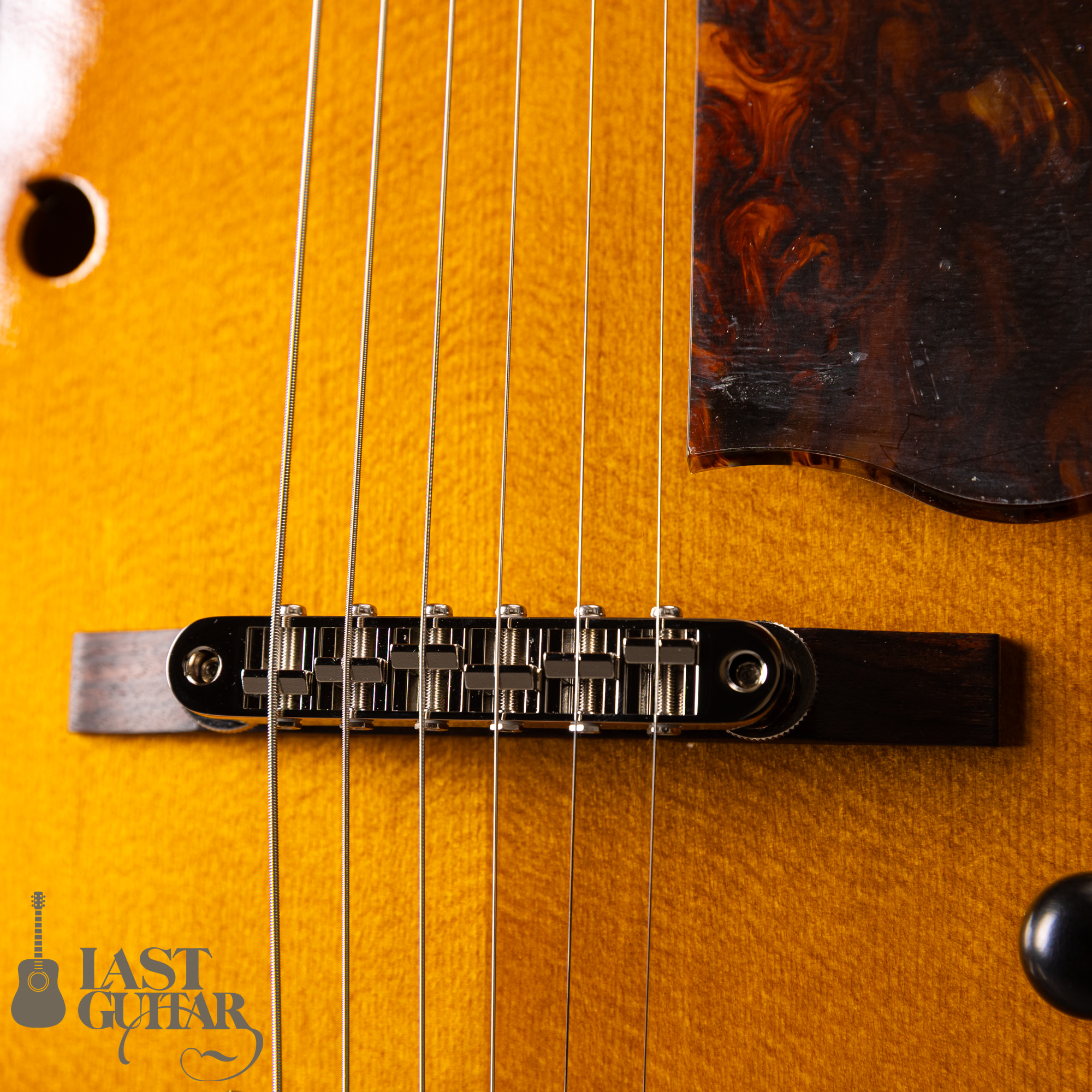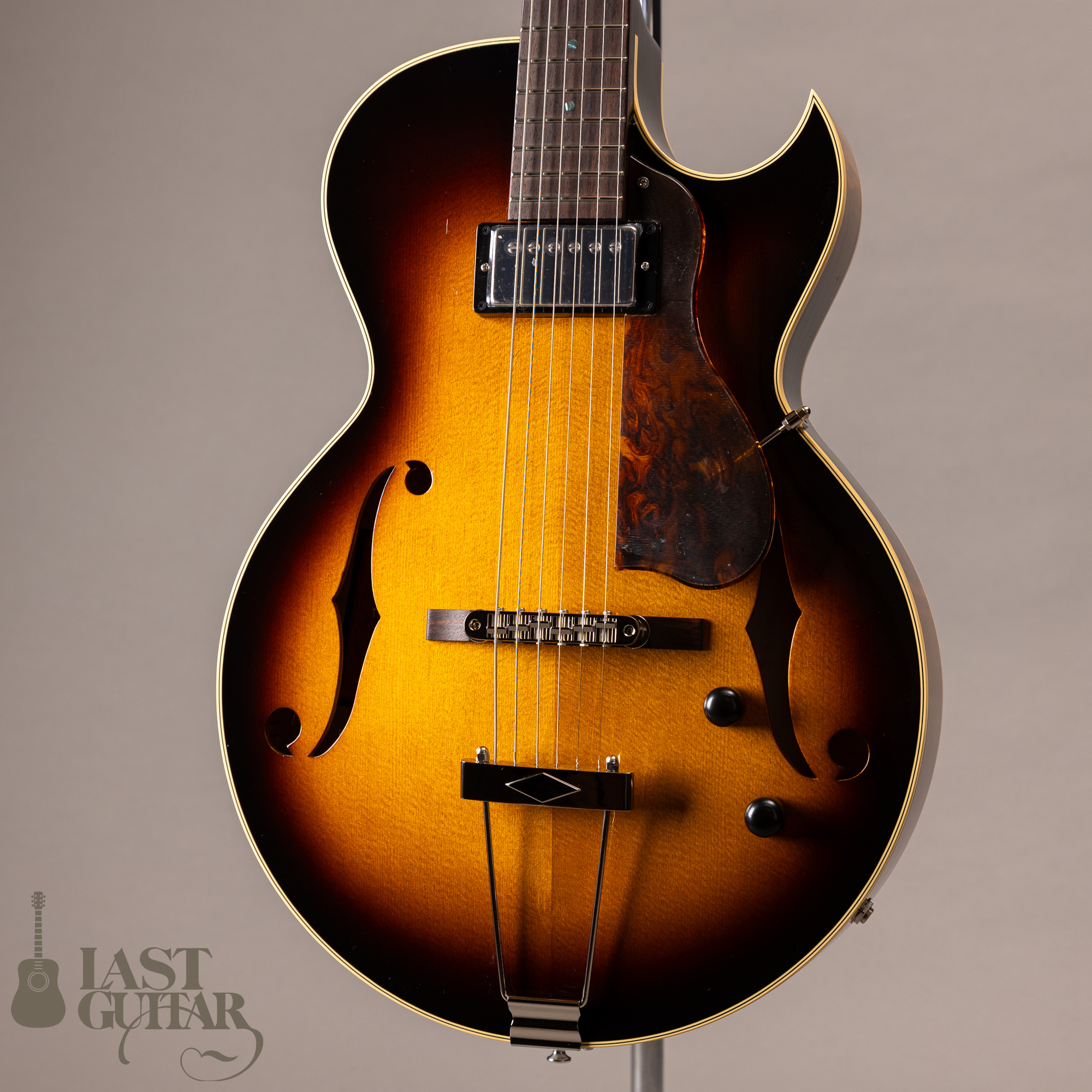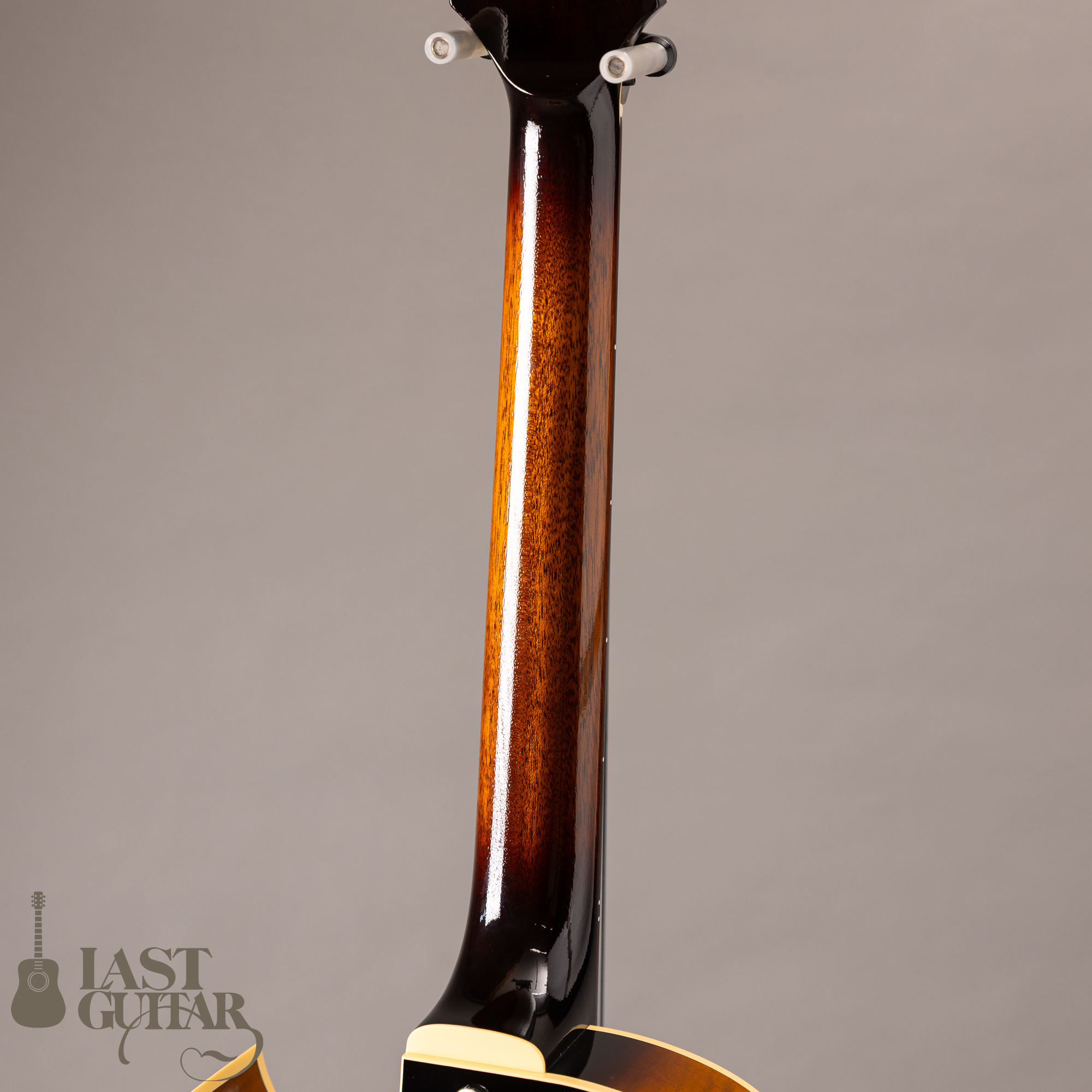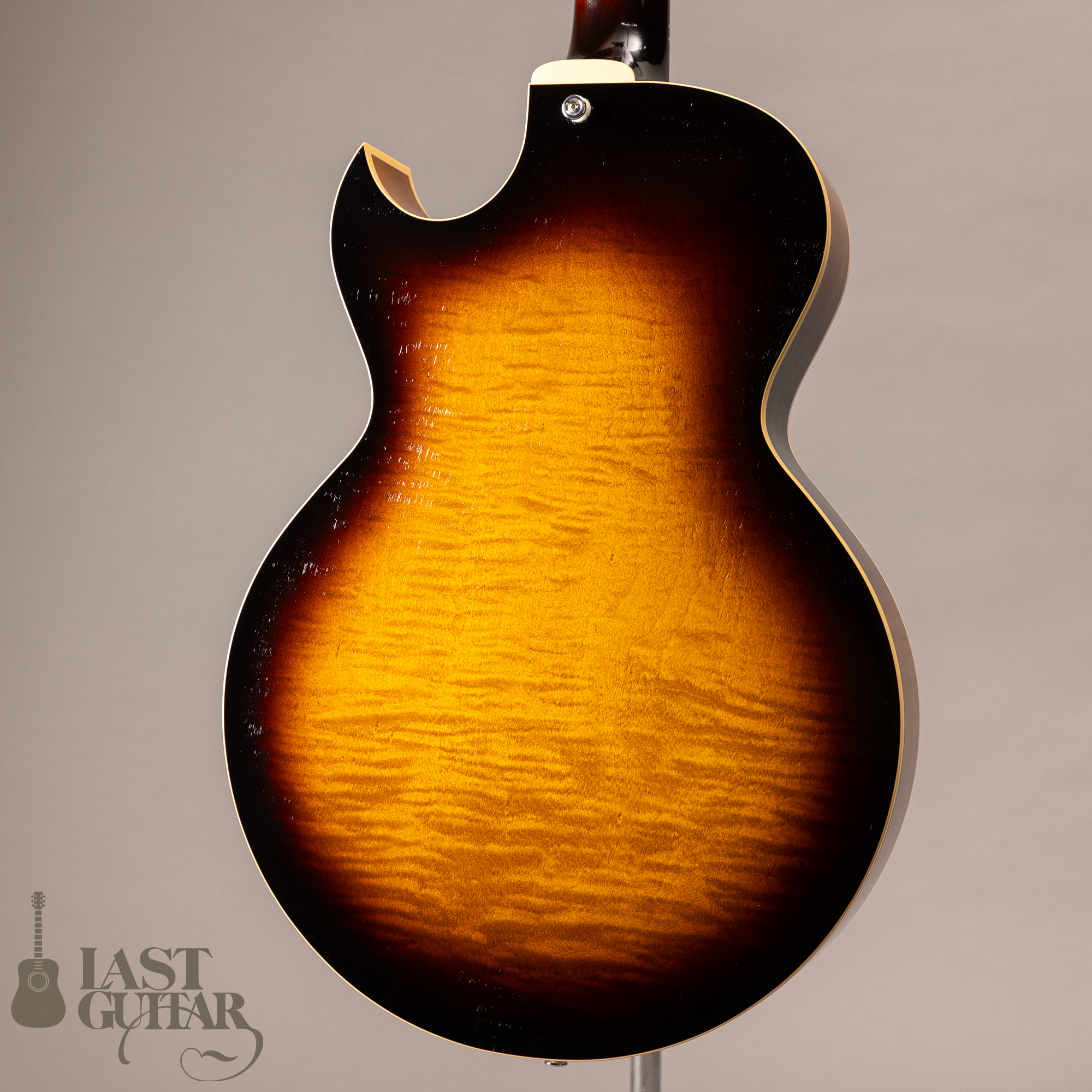 本機は、フローレンタインカッタウェイ、オープン・ポアのラッカーフィニッシュ仕上げの当店特注モデルです。サイド&バックにはカーリーメイプルを採用し、すごく味わいがあります。そしていつもハムバッカータイプのピックガードはブラックを指定しておりますが、今回はべっ甲柄に変更してみました。また渋くカッコいいルックスになっていると思います。その他にも、ストライプドエボニーのヘッドプレート、シルバーカラー系でまとめたパーツ類、Gotoh 510(ギヤ比1:21)ペグにアップグレードとこだわっております。