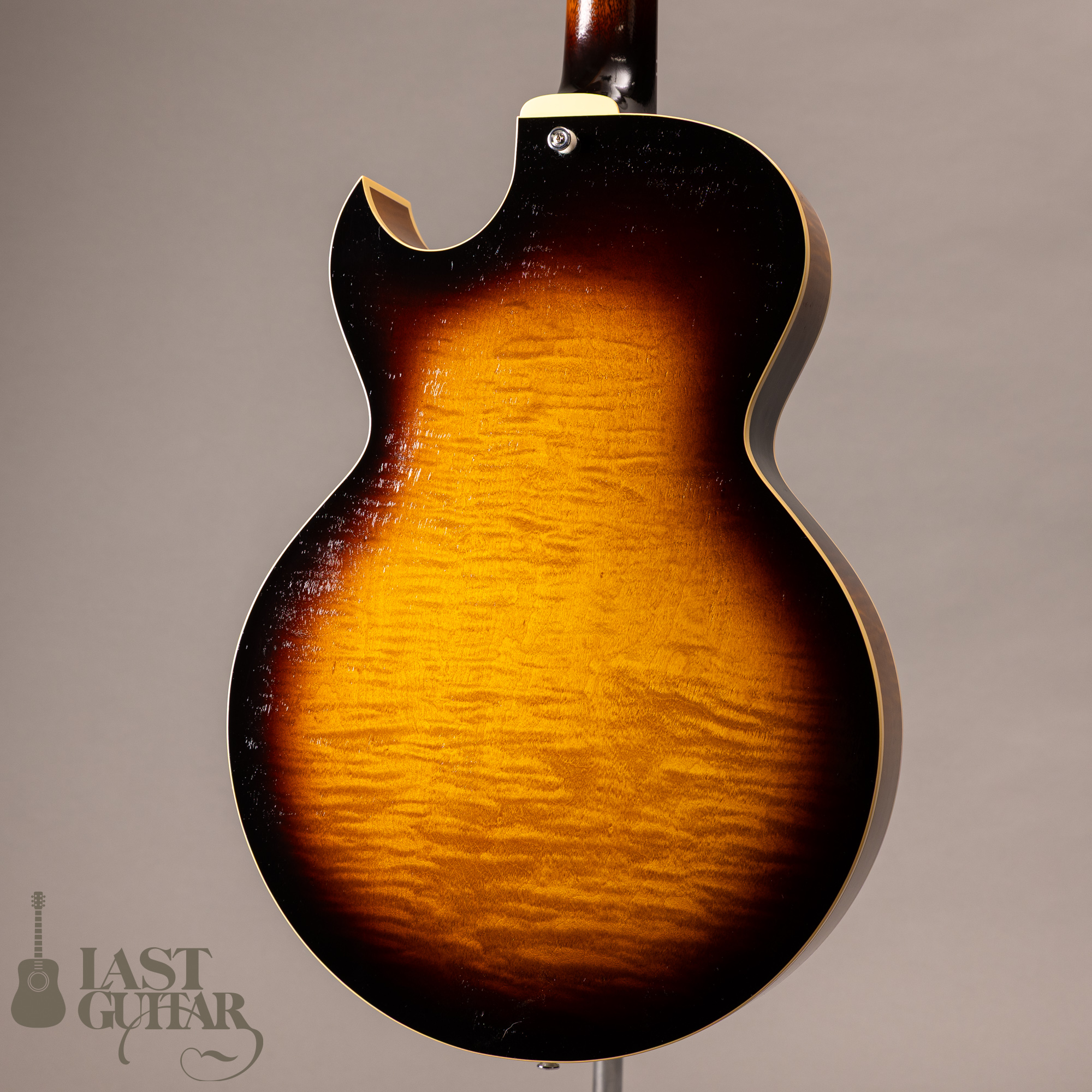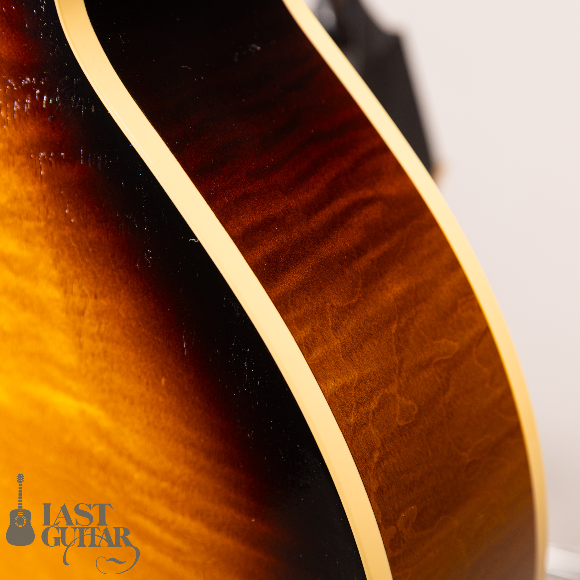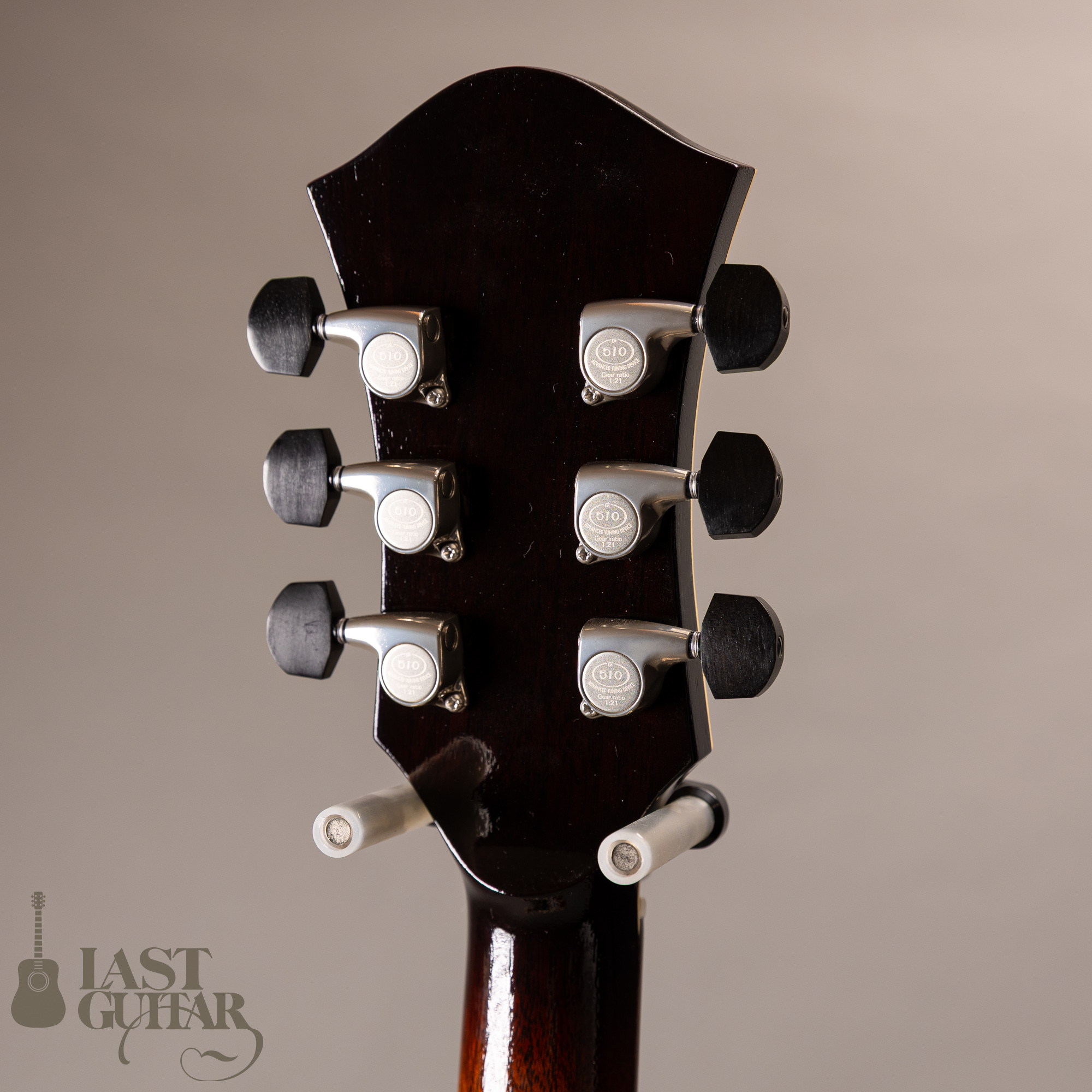 本機は、フローレンタインカッタウェイ、オープン・ポアのラッカーフィニッシュ仕上げの当店特注モデルです。サイド&バックは見る角度によって雰囲気が変わるカーリーメイプルをチョイスしております。極薄ラッカーのフィニッシュと相まって味わいあるルックスに仕上がっていると思います。その他にもストライプドエボニーのヘッドプレート、パーツをシルバーカラー系でまとめるなどこだわっております。さらにペグは、Gotoh 510(ギヤ比1:21)にアップグレードし高精度です。