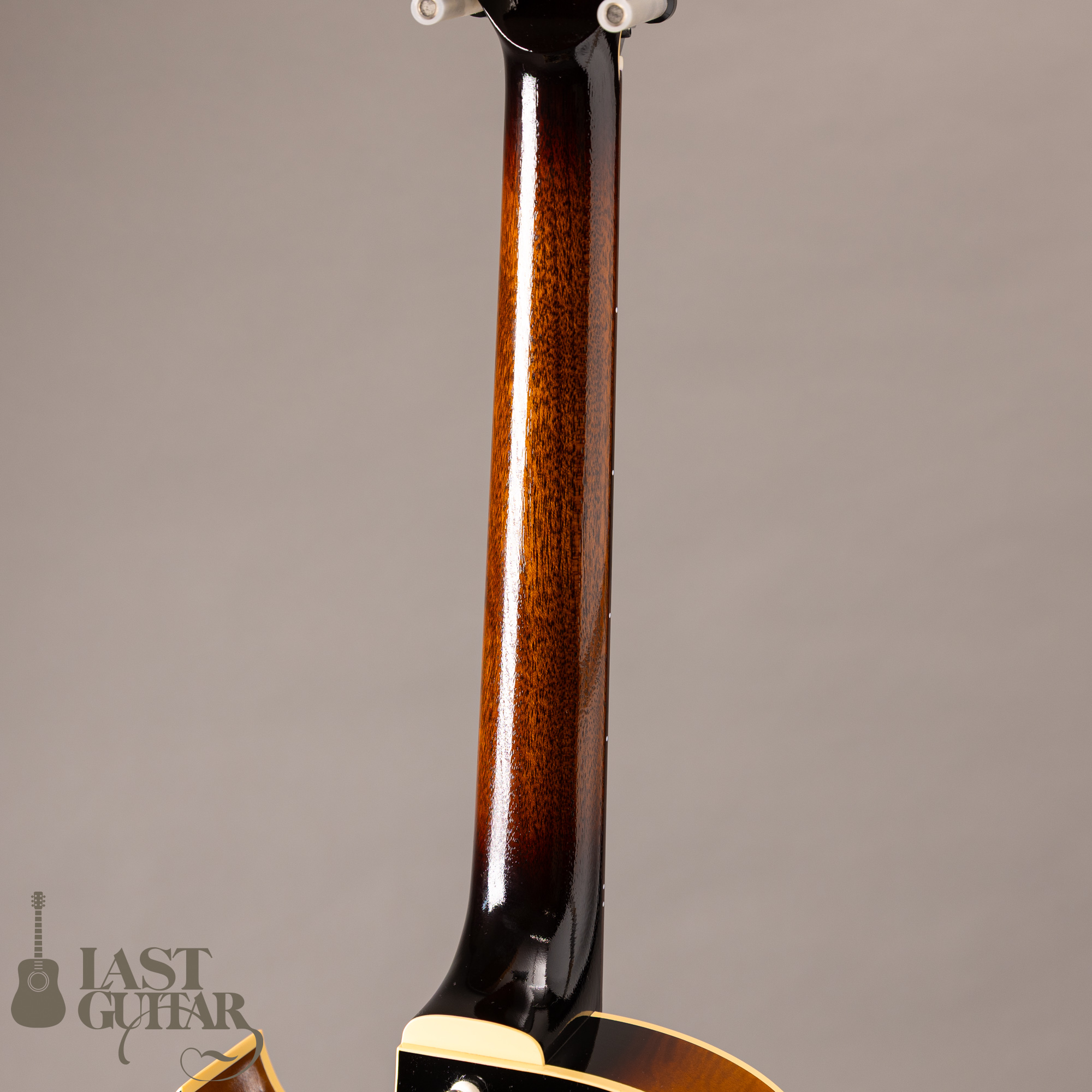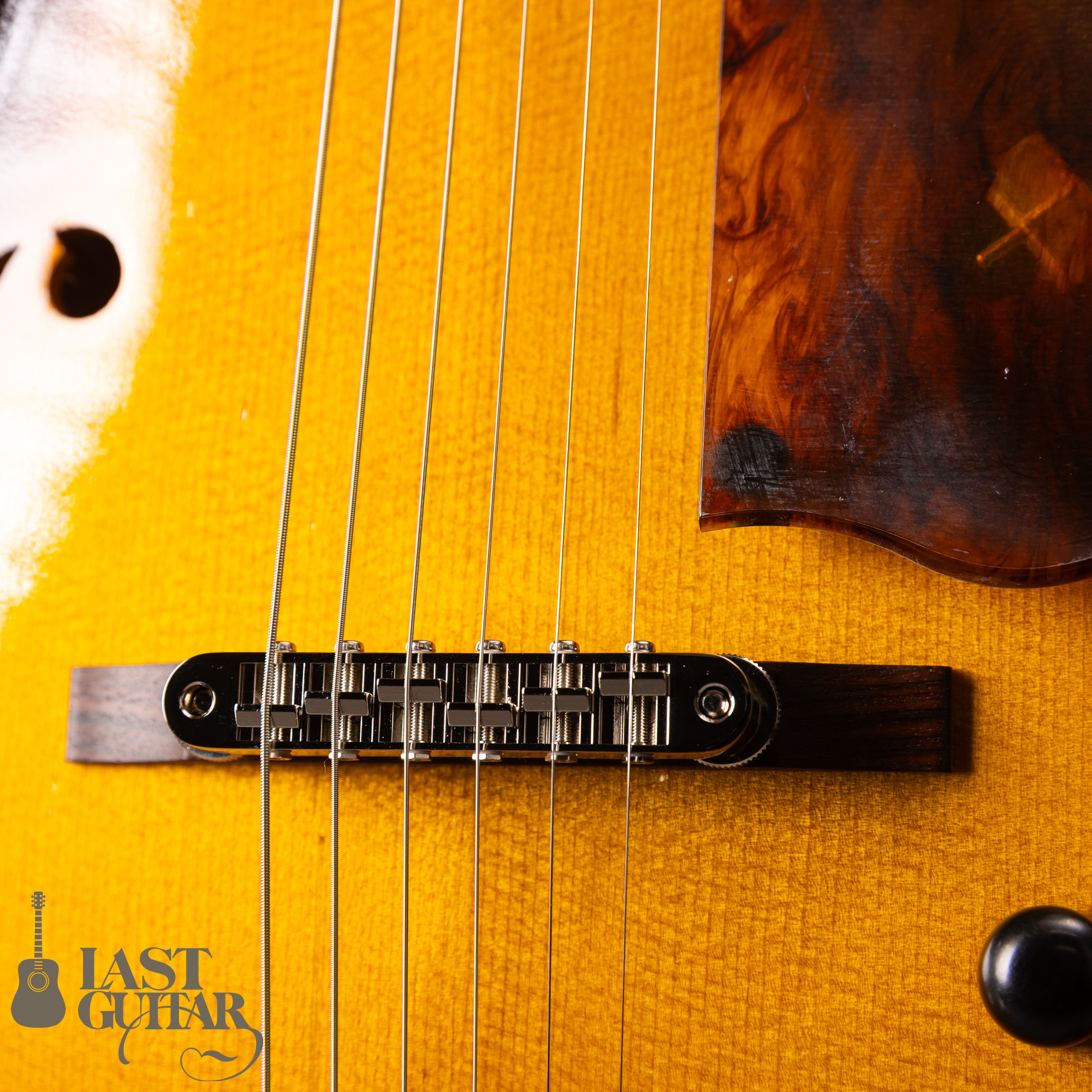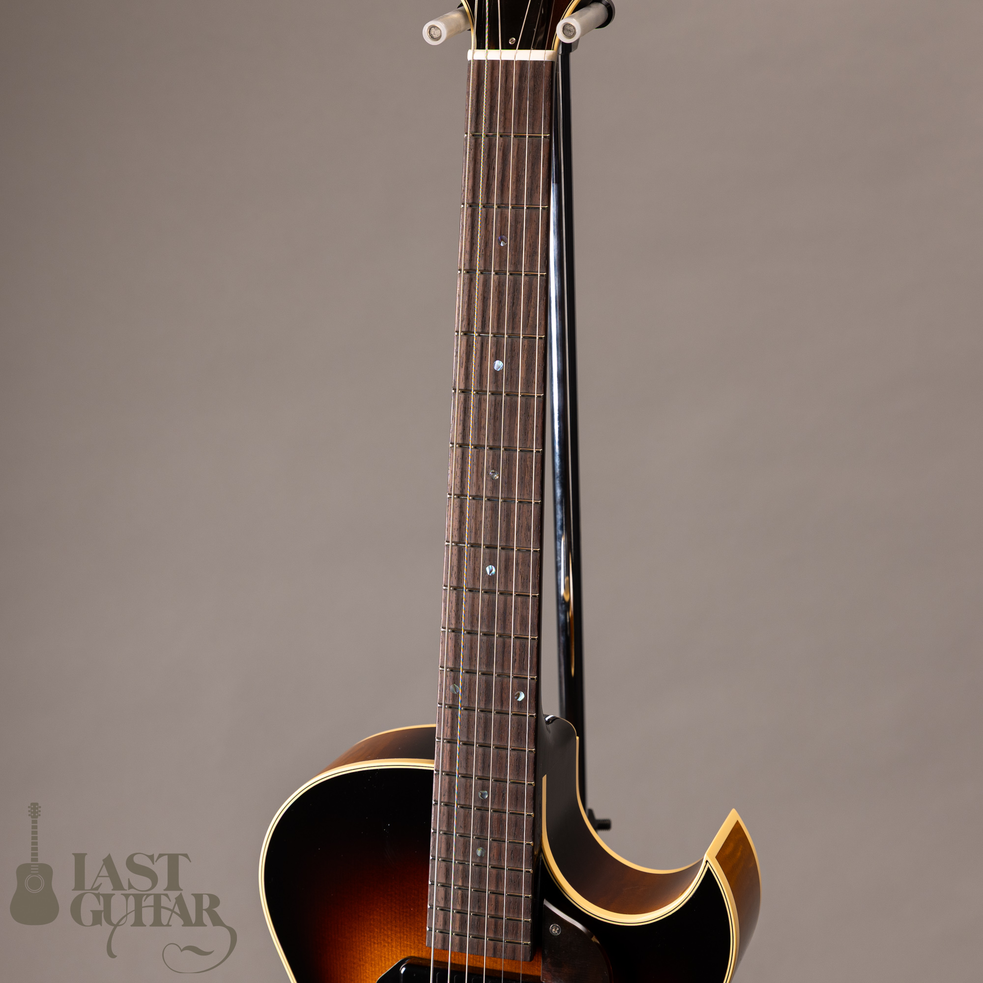 本機は、フローレンタインカッタウェイ、オープン・ポアのラッカーフィニッシュ仕上げの当店特注モデルです。サイド&バックは見る角度によって雰囲気が変わるカーリーメイプルをチョイスしております。極薄ラッカーのフィニッシュと相まって味わいあるルックスに仕上がっていると思います。その他にもストライプドエボニーのヘッドプレート、パーツをシルバーカラー系でまとめるなどこだわっております。さらにペグは、Gotoh 510(ギヤ比1:21)にアップグレードし高精度です。