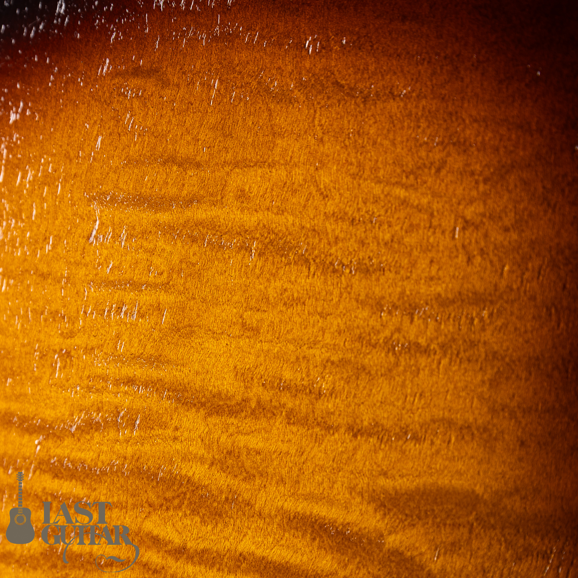 主なスペックは、通常胴厚の70ミリ胴厚、P-90タイプピックアップ1基搭載、スプルーストップ、カーリーメイプルサイド&バック、マホガニーネック、ローズウッドフィンガーボード、636mmスケール、ナット幅43mmです。コントロールは、シンプルな1 Volume, 1 Toneです。