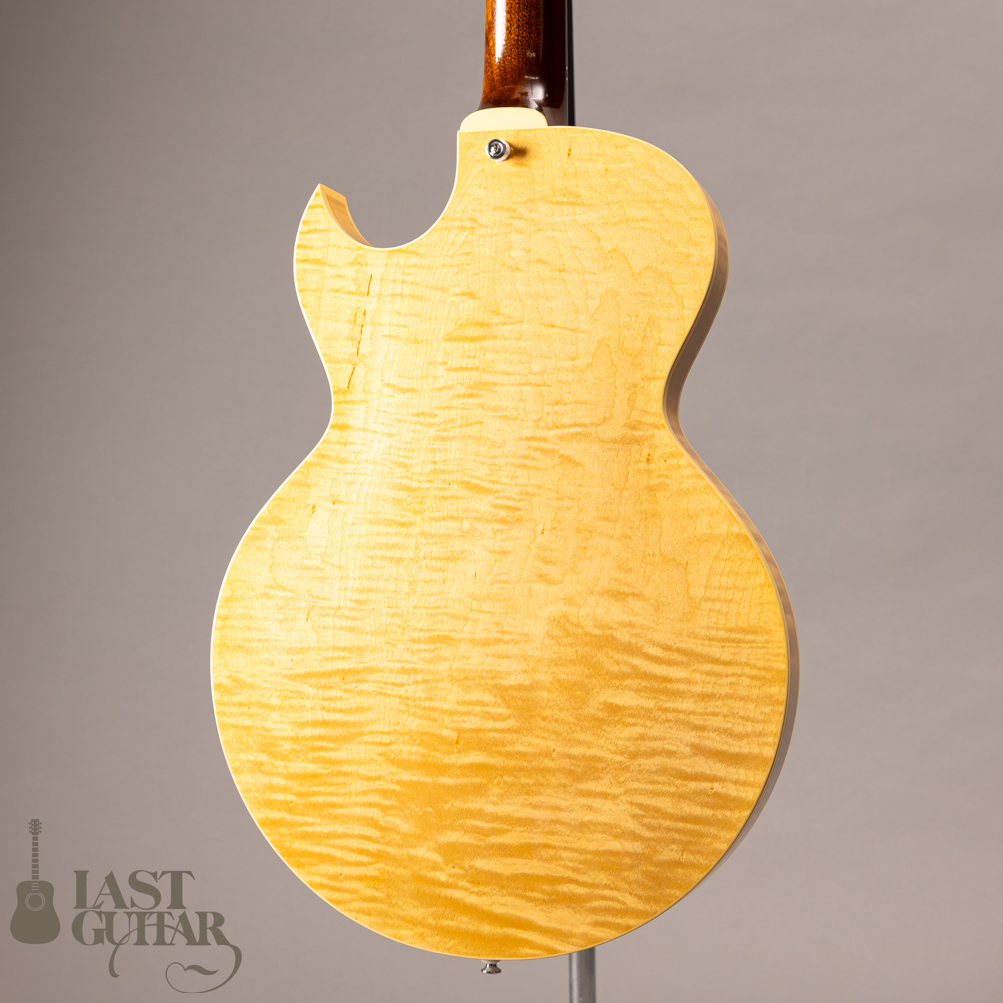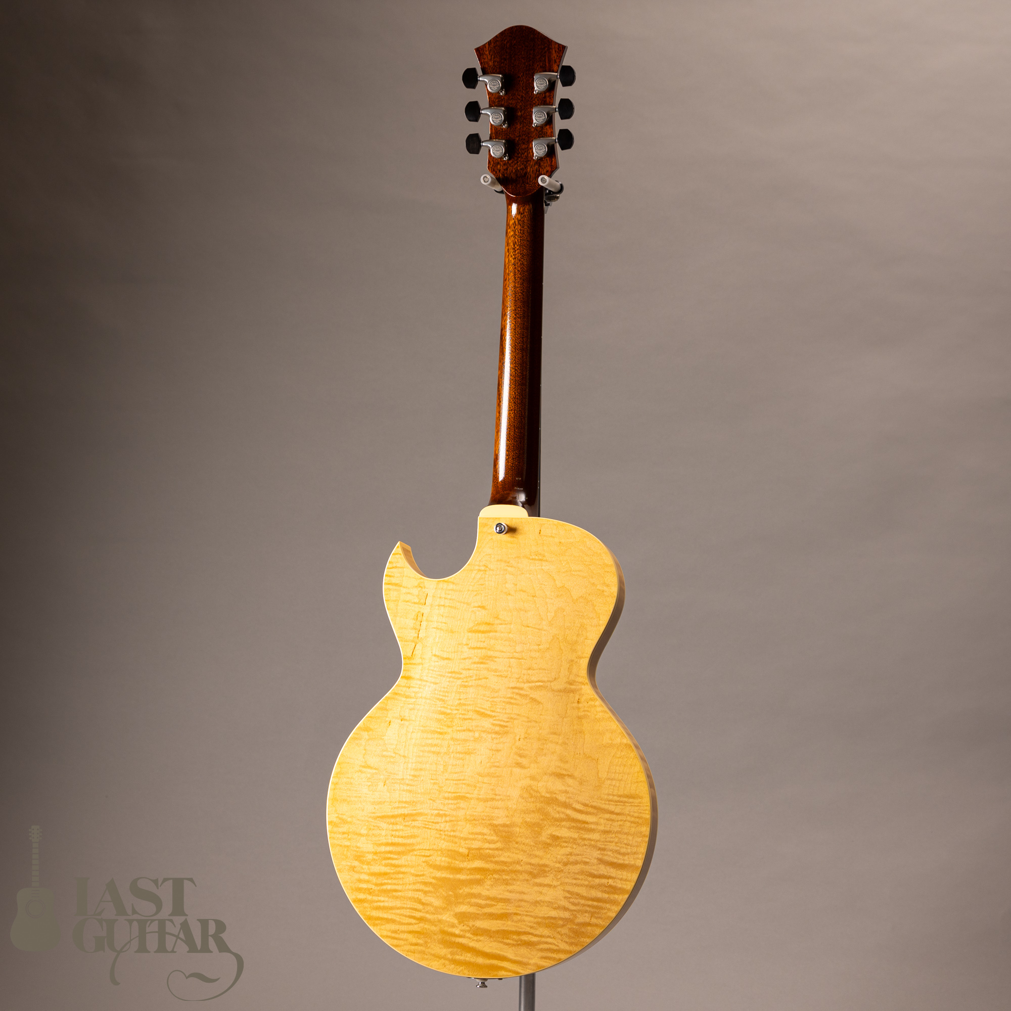 本機は、フローレンタインカッタウェイ、オープン・ポアのラッカーフィニッシュ仕上げの当店特注モデルです。またサイド&バックは見る角度によって雰囲気が変わるカーリーメイプルを採用しているのも特徴です。そしていつもハムバッカータイプのピックガードはブラックを指定しておりますが、今回はべっ甲柄に変更してみました。また渋くカッコいいルックスになっていると思います。その他にもストライプドエボニーのヘッドプレート、パーツをシルバーカラー系でまとめるなどこだわっております。さらにペグは、Gotoh 510(ギヤ比1:21)にアップグレードしており高精度です。