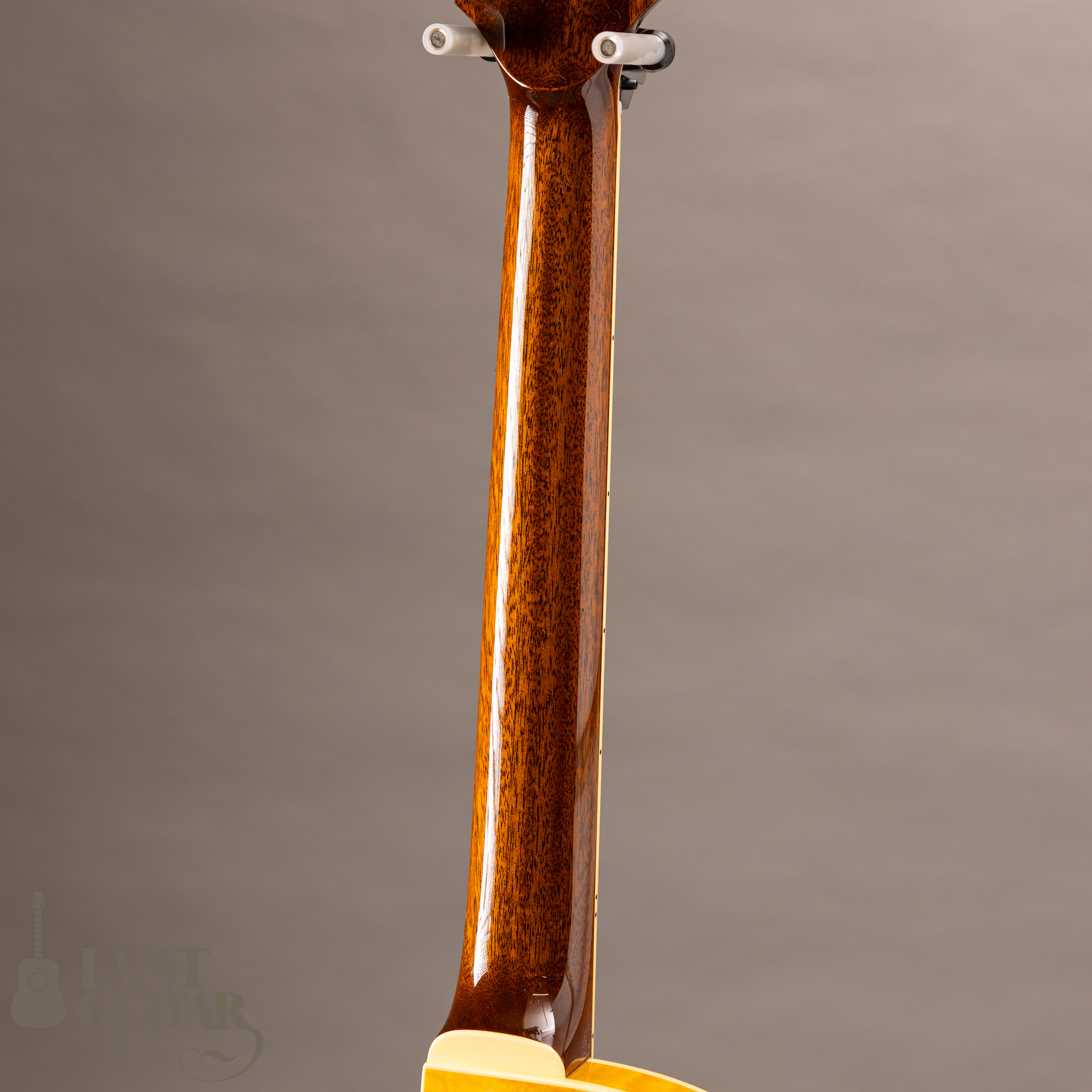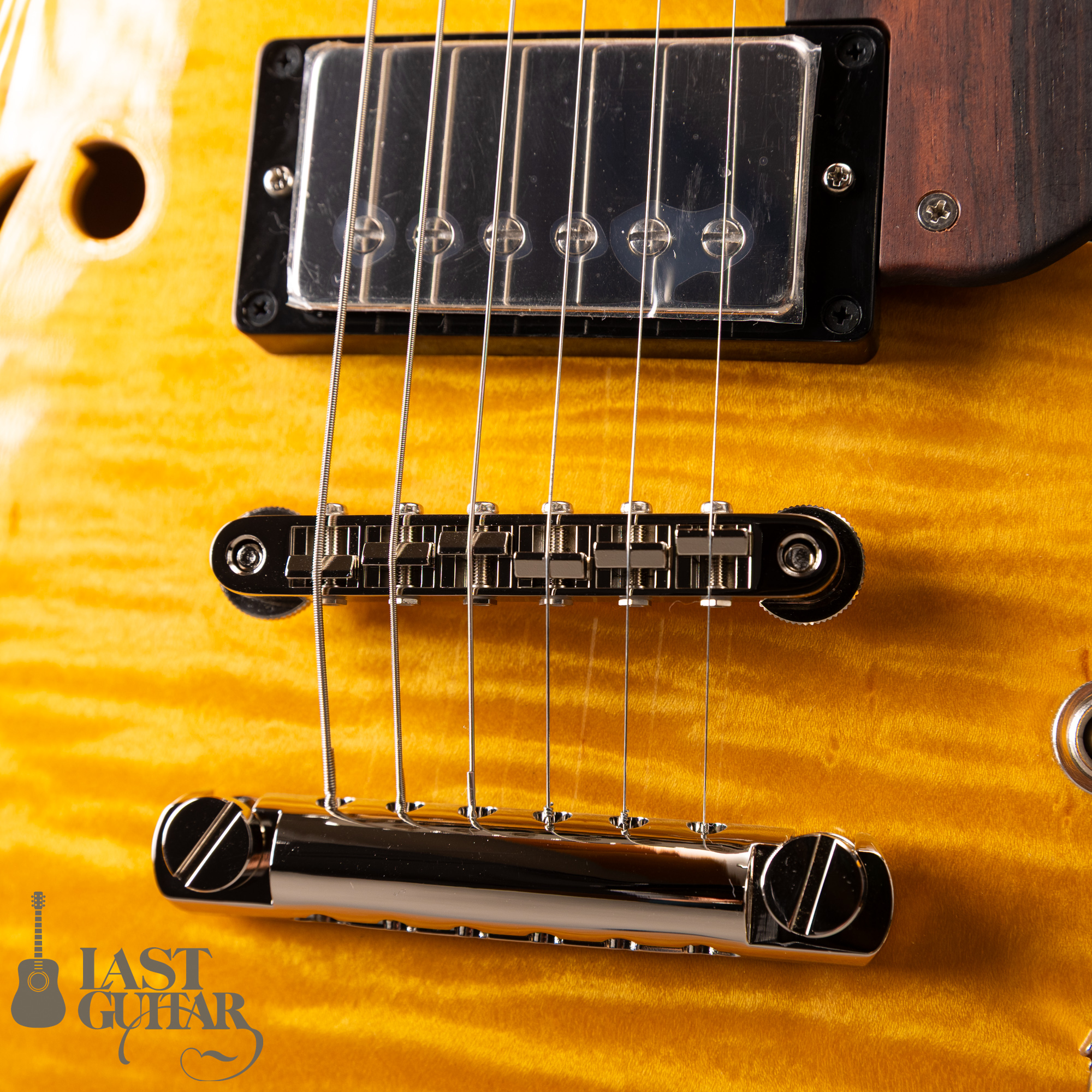 本機は、ギタリストの関口シンゴさんが所有するロゼオギターと”ほぼ同仕様”のセミアコモデルです。レギュラーのモデルとの違いは、ピックガードがエボニー材製、ビンテージ・アンバーのカラー、コントロールノブ・トグルノブです。