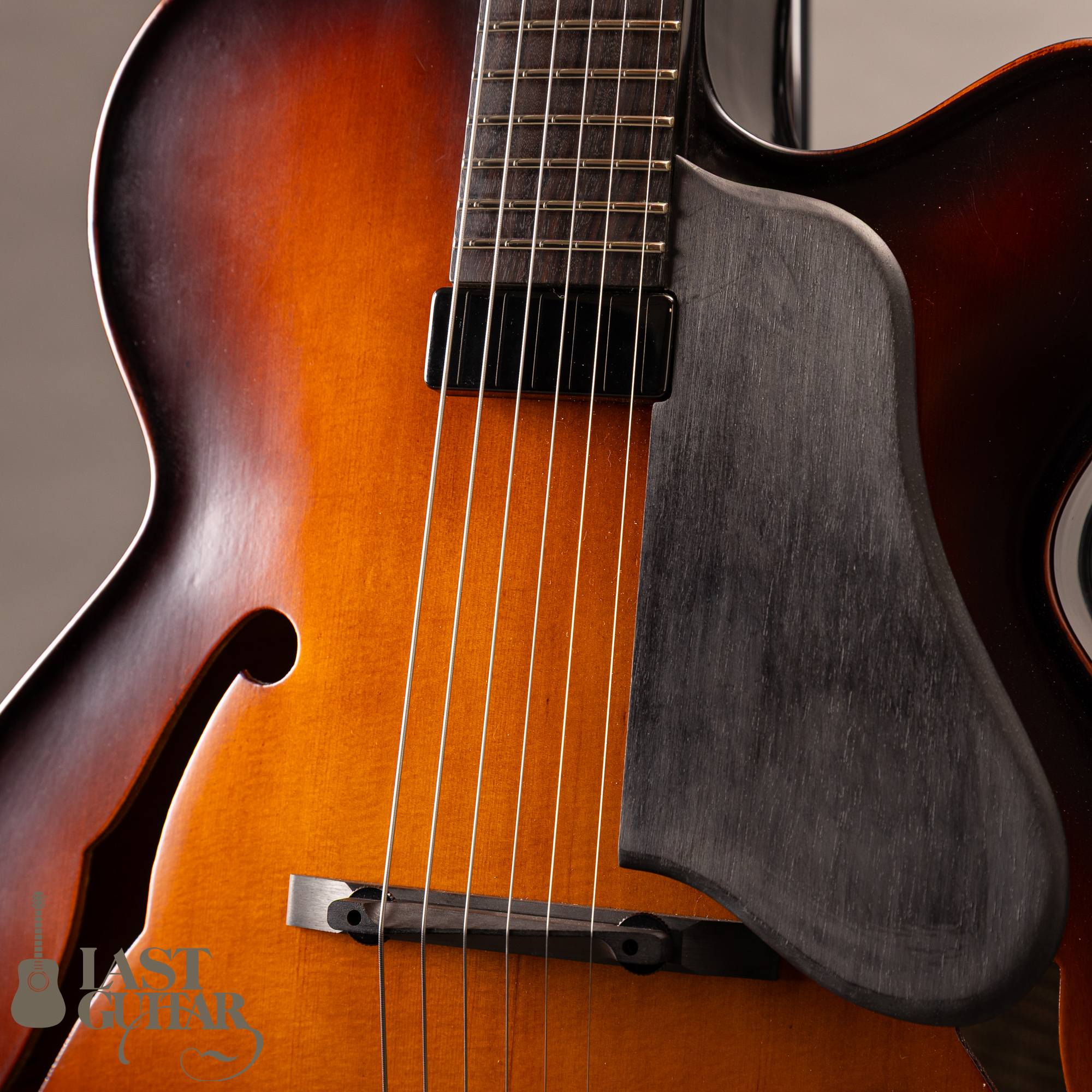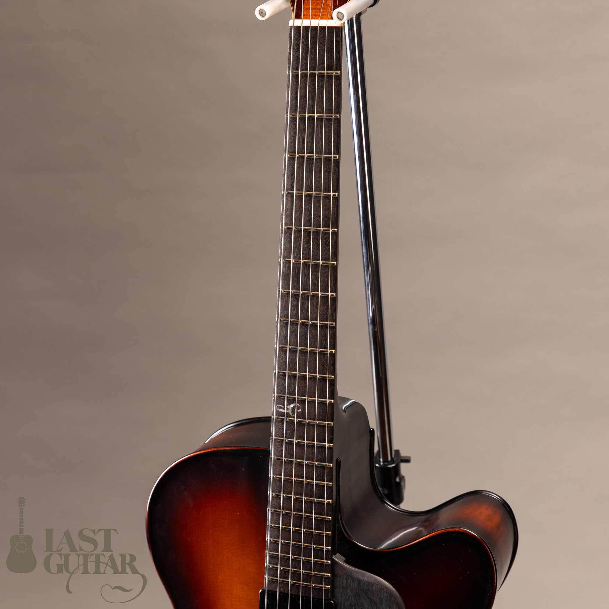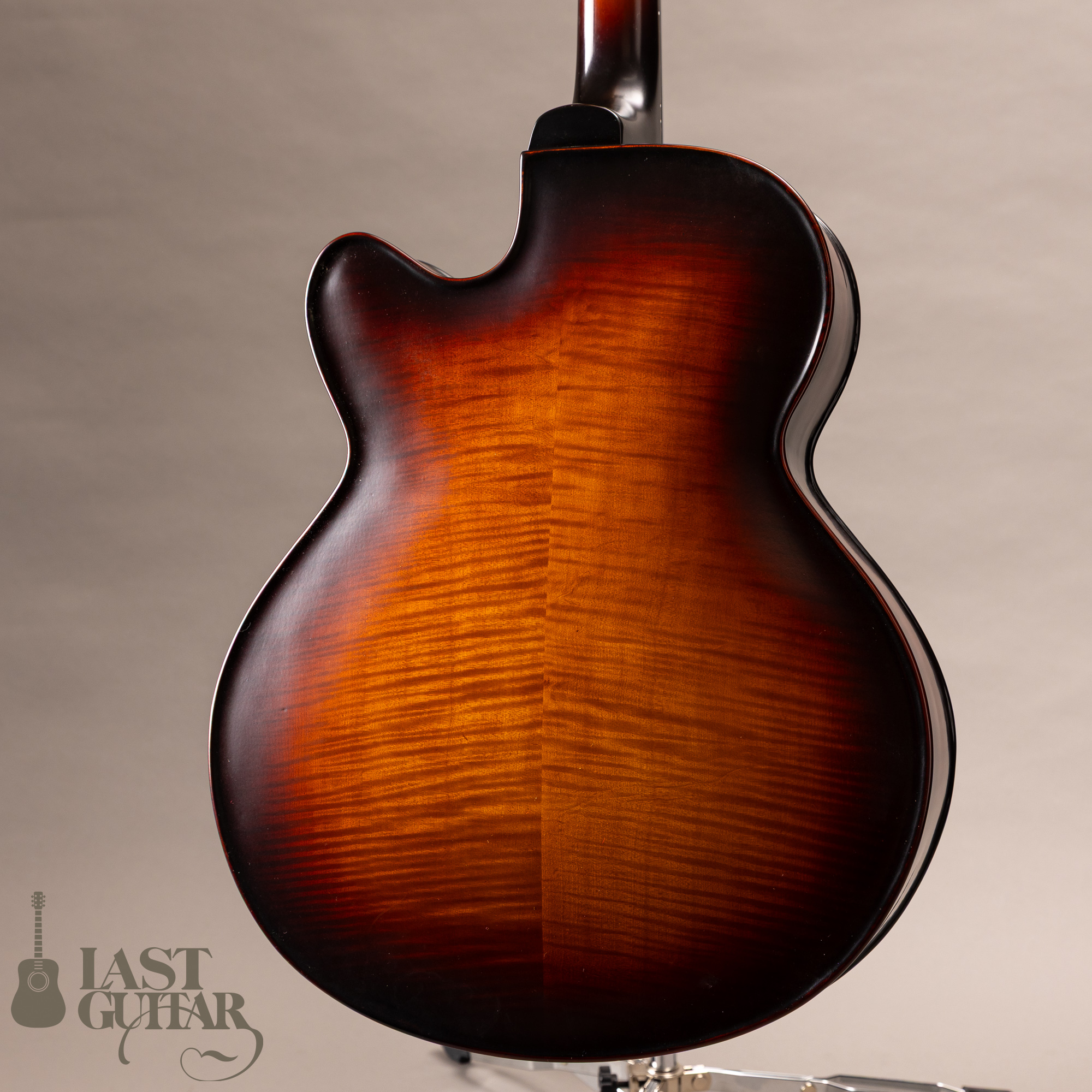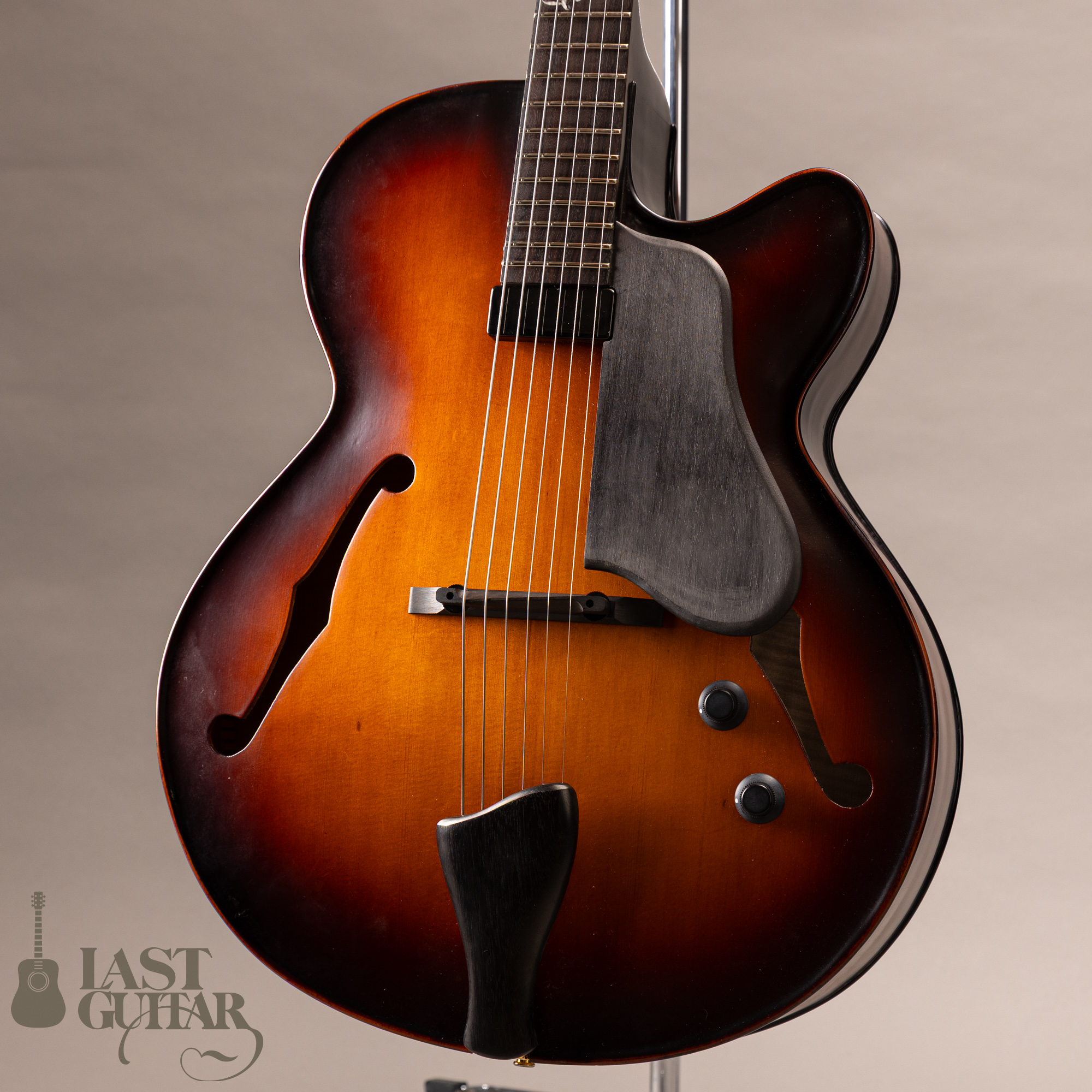 本機は、伝統的なバイオリンの工法を取り入れた17インチボディ幅のフルアコモデルです。古いバイオリンのような雰囲気で、趣あるルックスです。トップとバックは伝統的な工法にのっとったハンドアーチで、スプルース単板トップ、メイプルサイド&バック、メイプルネック、エボニー指板のスペックです。ピックガードとテールピースは、エボニーで全体の雰囲気によくマッチしていて味わい深いです。フィニッシュは艶を抑えたさらさらとした手触りの仕上げです。ネックまわりは、約42.5mmナット幅に、程よい厚みのDシェイプといった印象です。