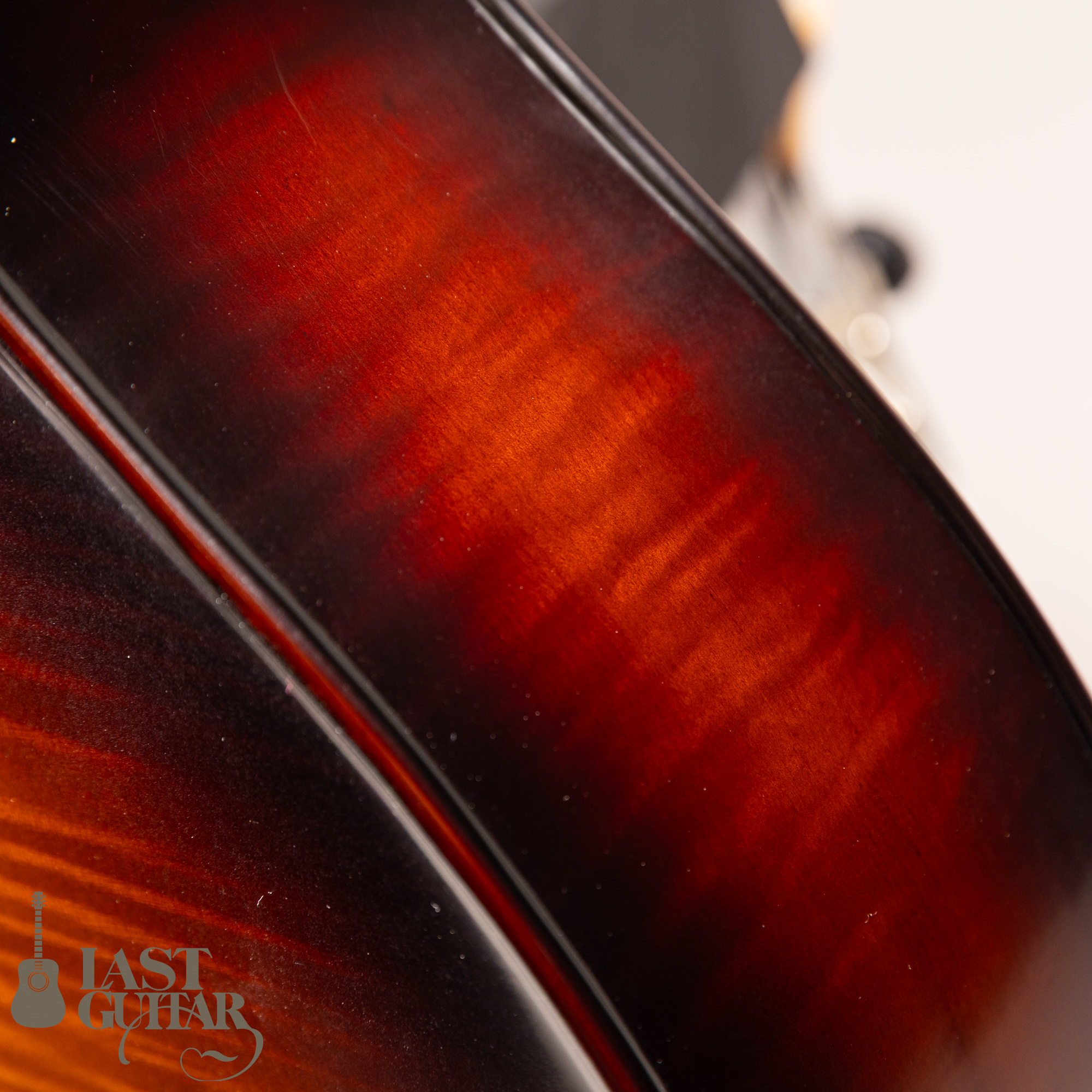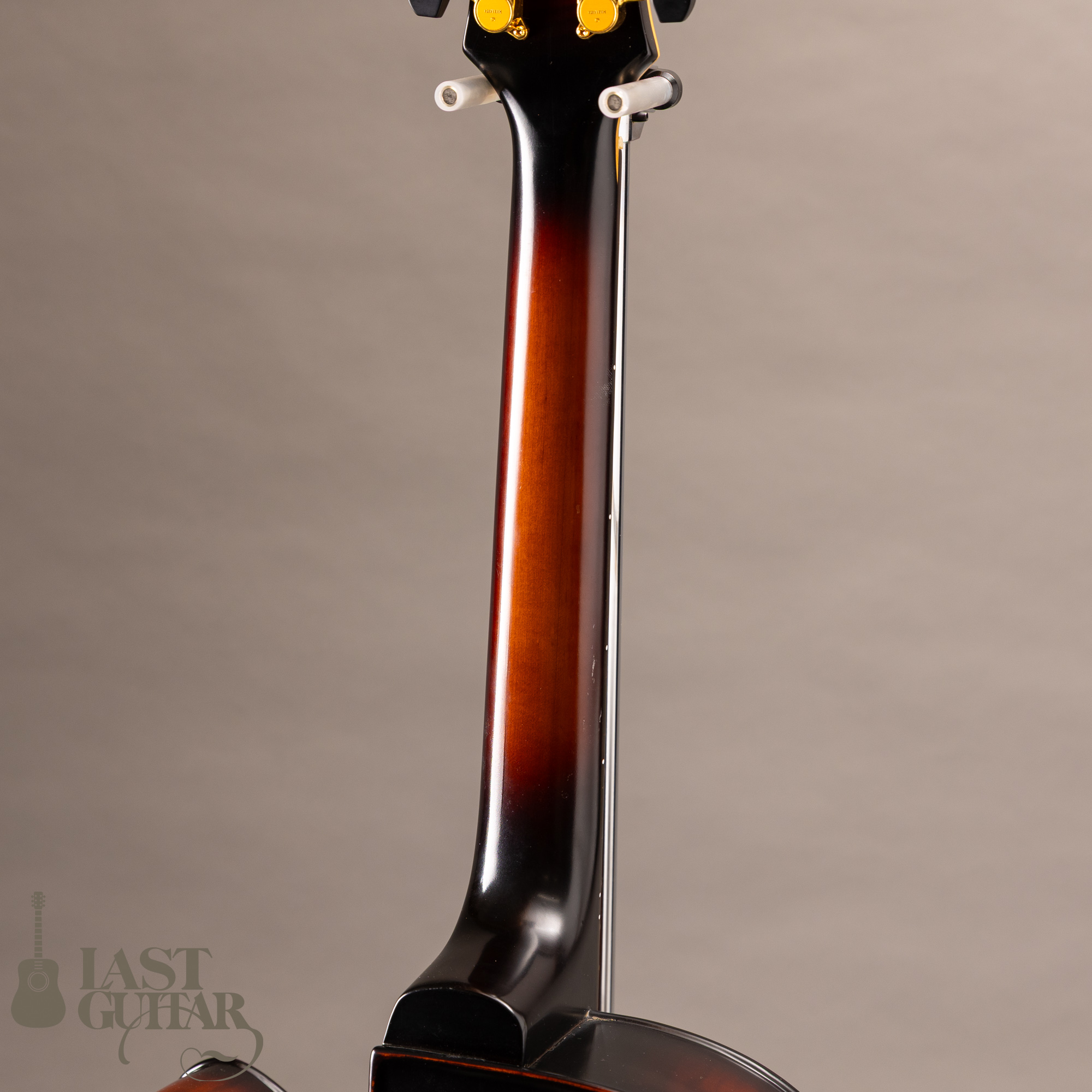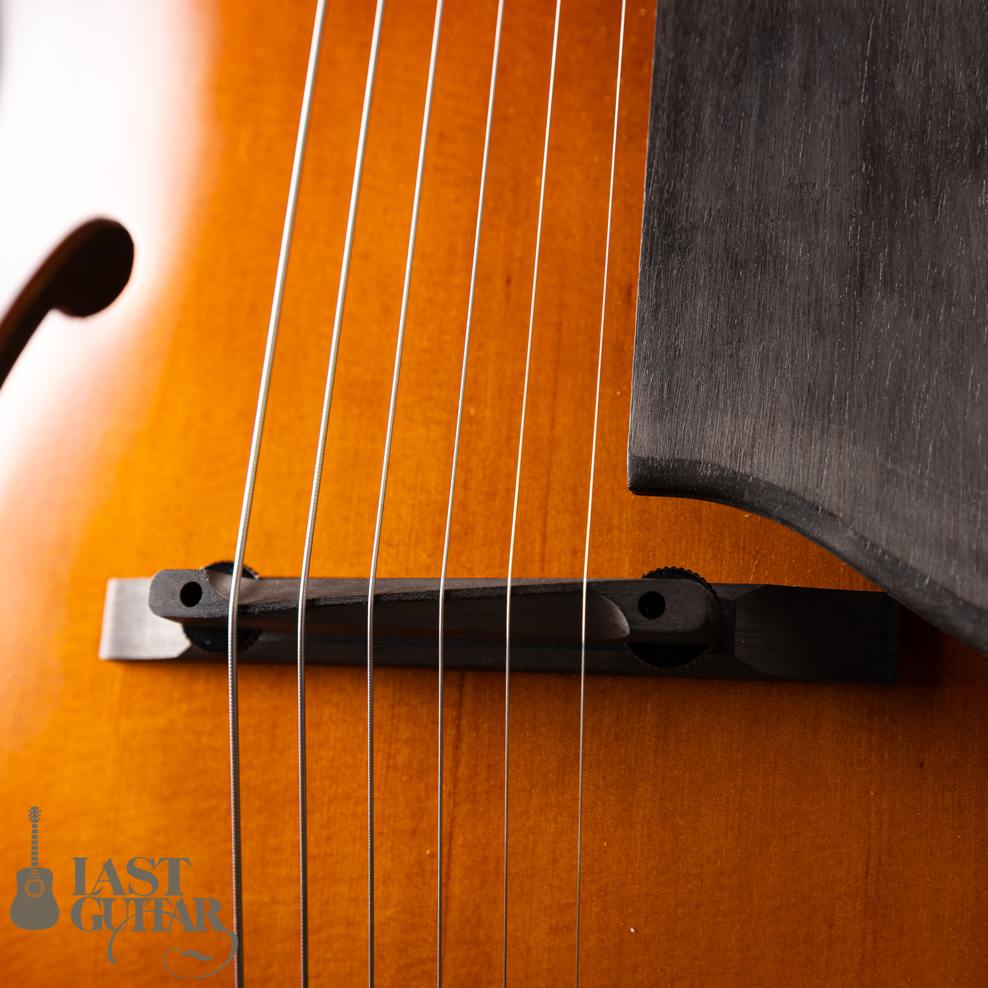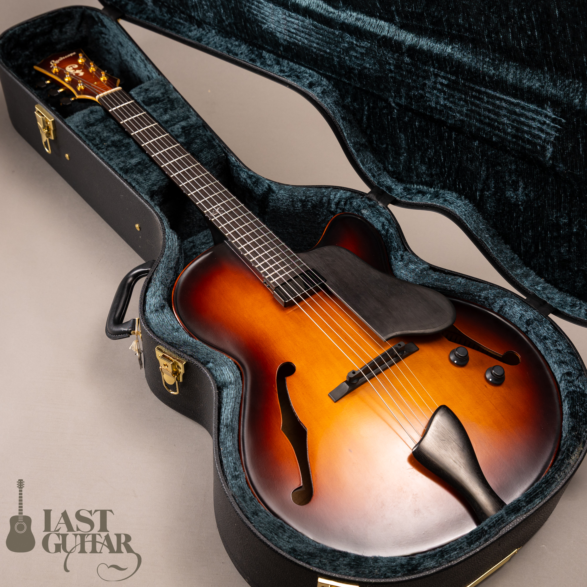 本機は、伝統的なバイオリンの工法を取り入れた17インチボディ幅のフルアコモデルです。古いバイオリンのような雰囲気で、趣あるルックスです。トップとバックは伝統的な工法にのっとったハンドアーチで、スプルース単板トップ、メイプルサイド&バック、メイプルネック、エボニー指板のスペックです。ピックガードとテールピースは、エボニーで全体の雰囲気によくマッチしていて味わい深いです。フィニッシュは艶を抑えたさらさらとした手触りの仕上げです。ネックまわりは、約42.5mmナット幅に、程よい厚みのDシェイプといった印象です。