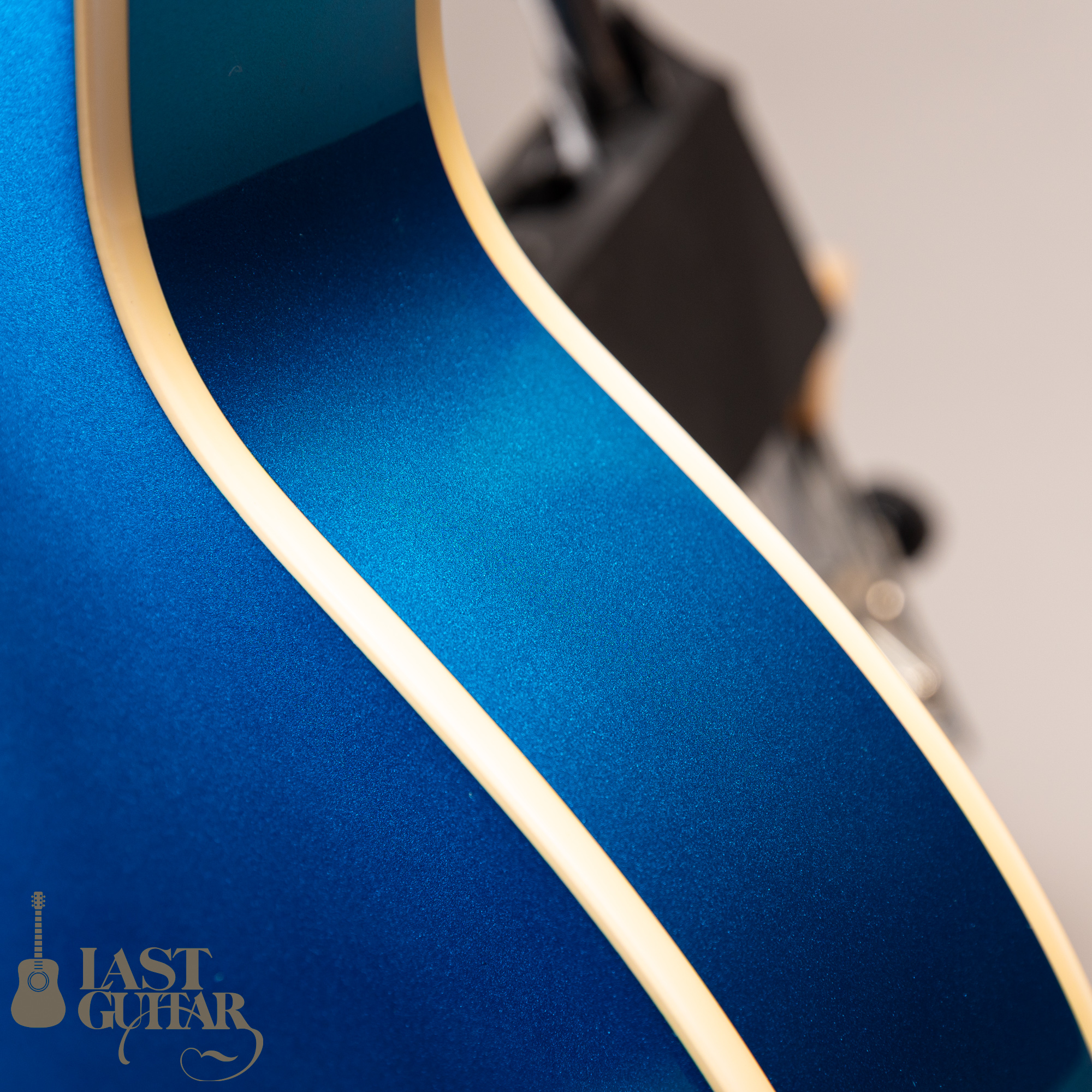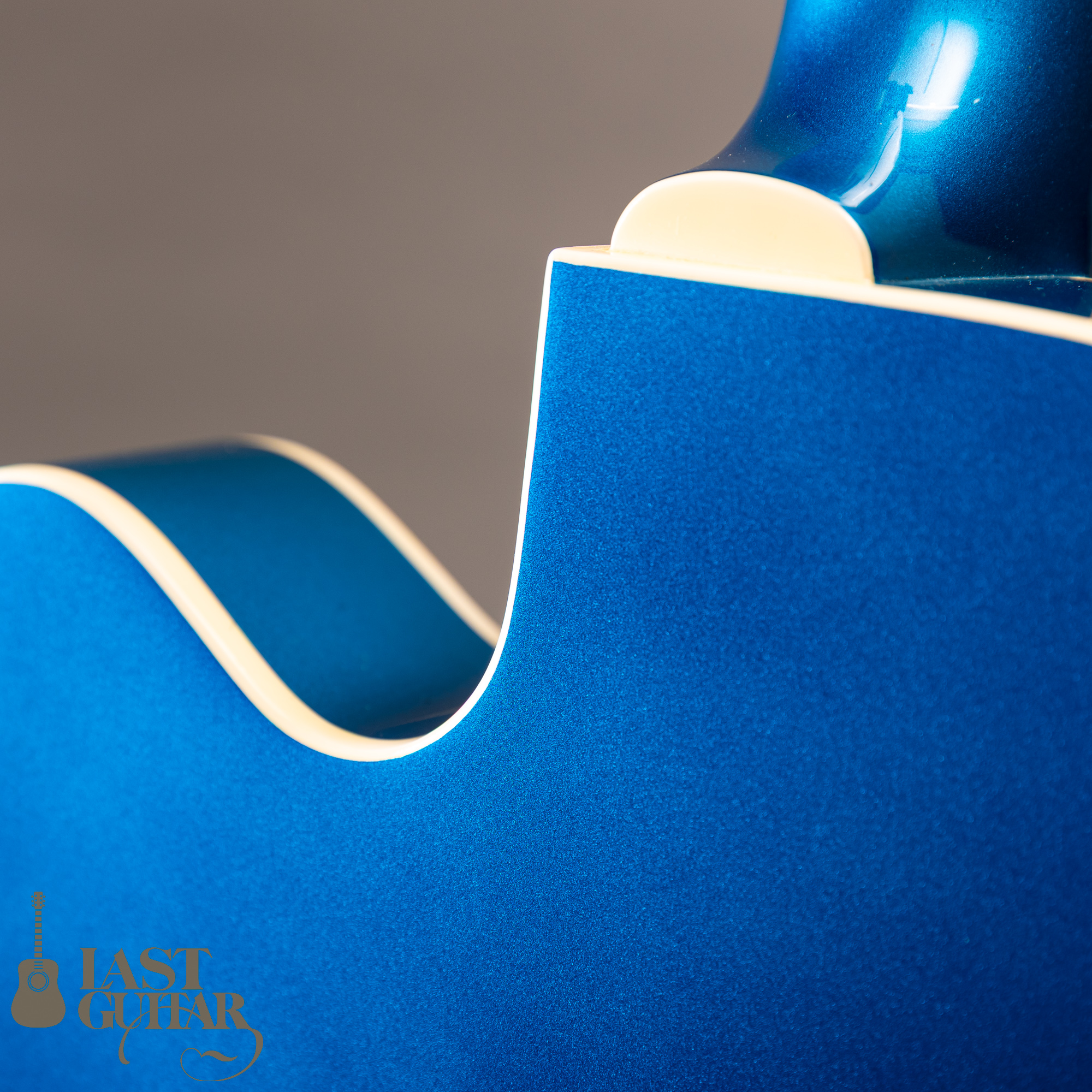 映えるリーガルブルーカラーでヘッドには「Brian Setzer hod rod mdel」と彫金されたプレートが付いており非常にいかしたルックスをしております。またBigsbyや金属パーツのくすみ、クリーム色のバインディングなどががマッチしており全体的に明るい雰囲気の良い一本となっております。中でもリーガルブルーカラーのこのシグネイチャーモデルは市場にも少ないレアな一本となっております。