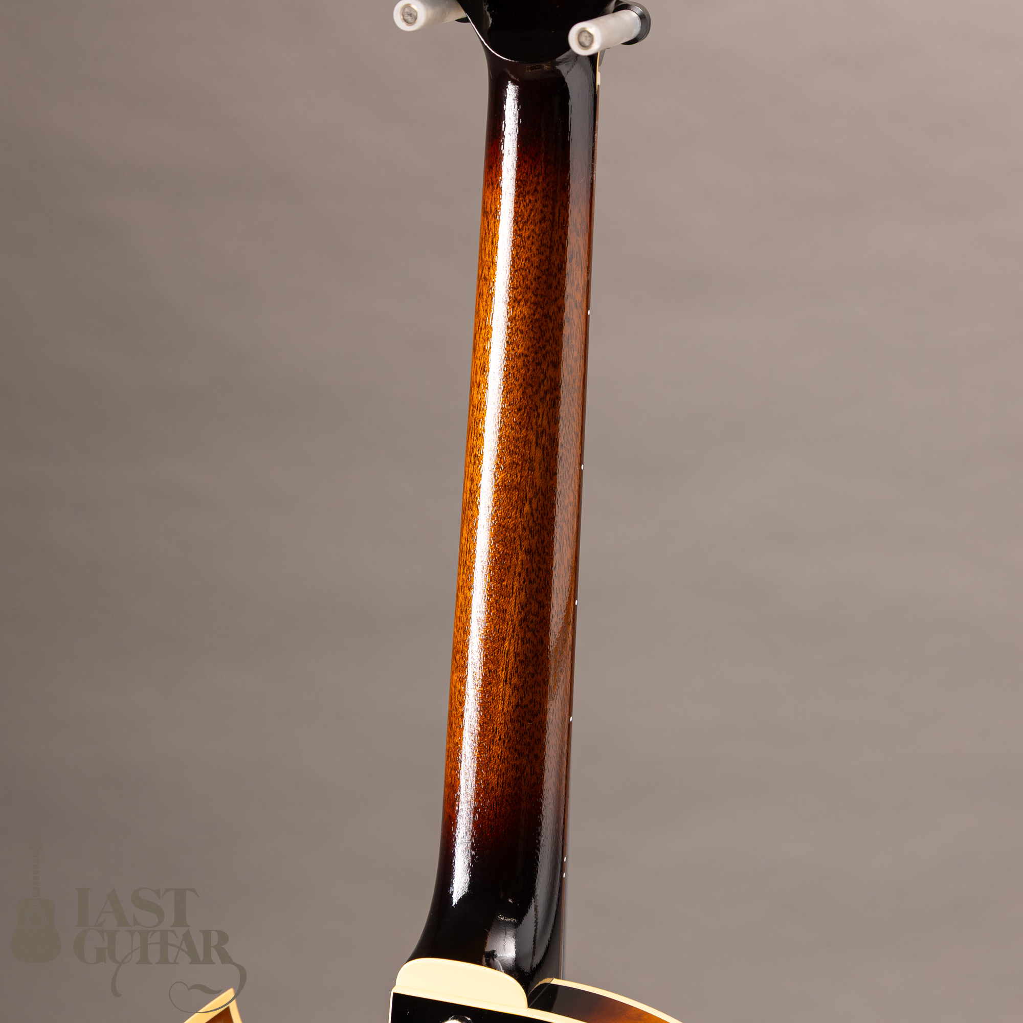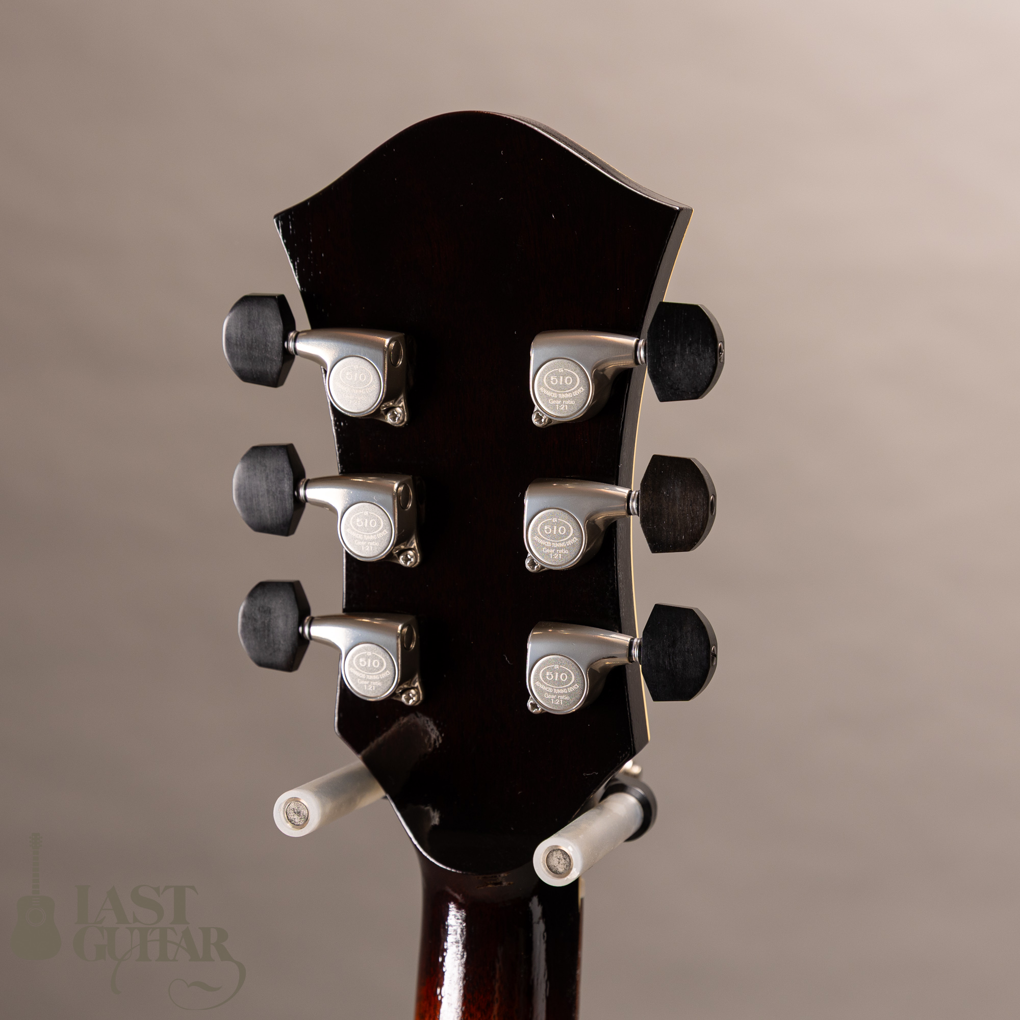 本機は、フローレンタインカッタウェイ、オープン・ポアのラッカーフィニッシュ仕上げの当店特注モデルです。またサイド&バックは見る角度によって雰囲気が変わるカーリーメイプルを採用しているのも特徴です。そしていつもハムバッカータイプのピックガードはブラックを指定しておりますが、今回はべっ甲柄に変更してみました。また渋くカッコいいルックスになっていると思います。その他にもストライプドエボニーのヘッドプレート、パーツをシルバーカラー系でまとめるなどこだわっております。さらにペグは、Gotoh 510(ギヤ比1:21)にアップグレードしており高精度です。