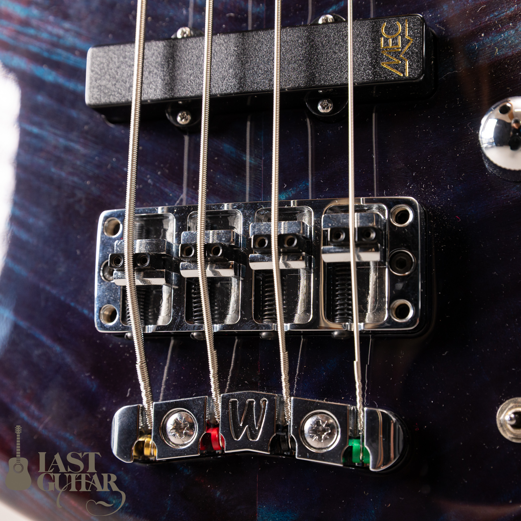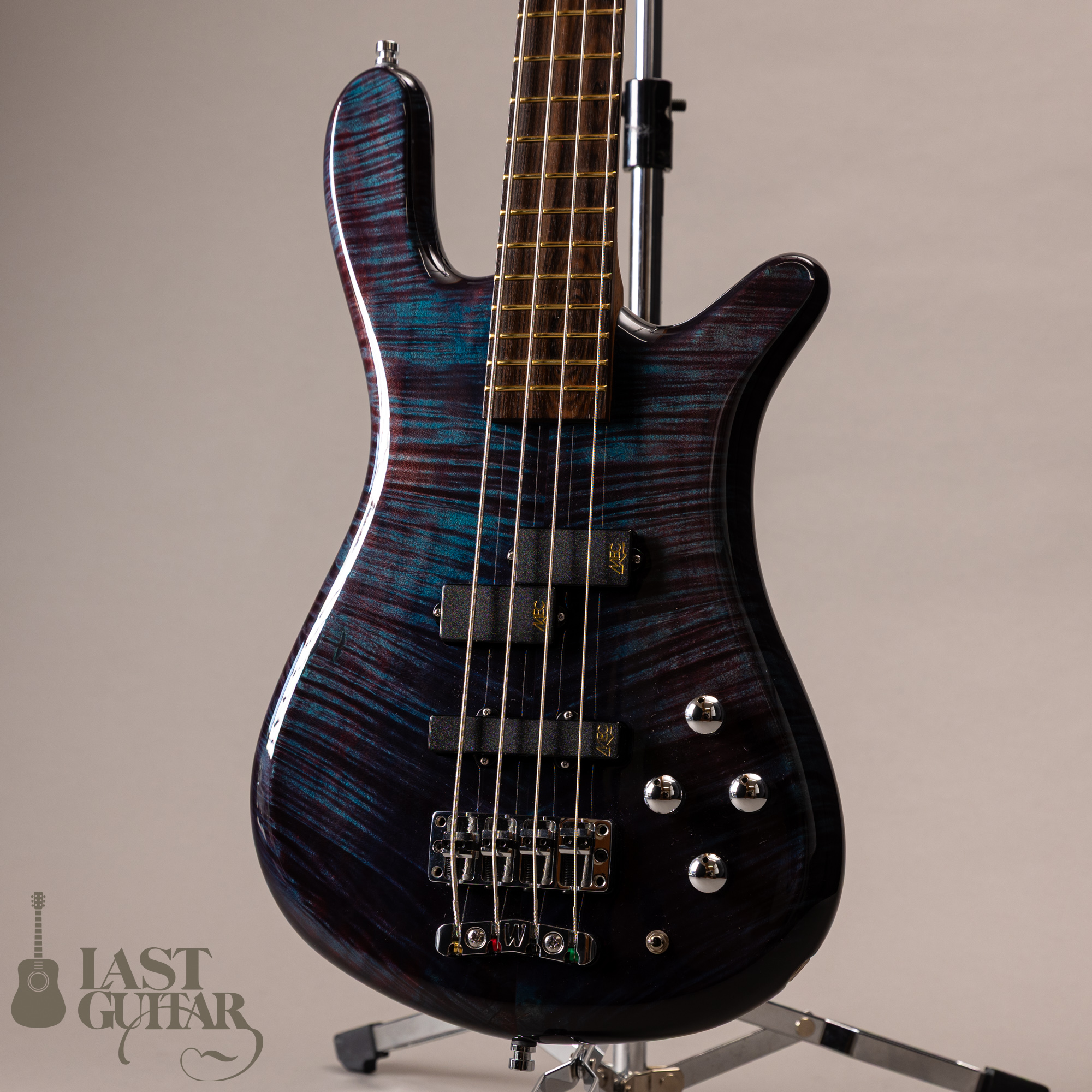サウンド面ではMECのアクティブPJタイプのピックアップが搭載しておりフロントは低音、中音、高音ともにトーンの効いたバランスの取れたサウンドでリアは一音一音の粒だちが良くフロントよりタイトに鳴ってくれる印象です。コントロールはボディー上からピックアップバランサー・マスターヴォリューム・ベース・トレブルとなっており多彩なサウンドメイクにも対応し様々な音楽ジャンルにマッチします。