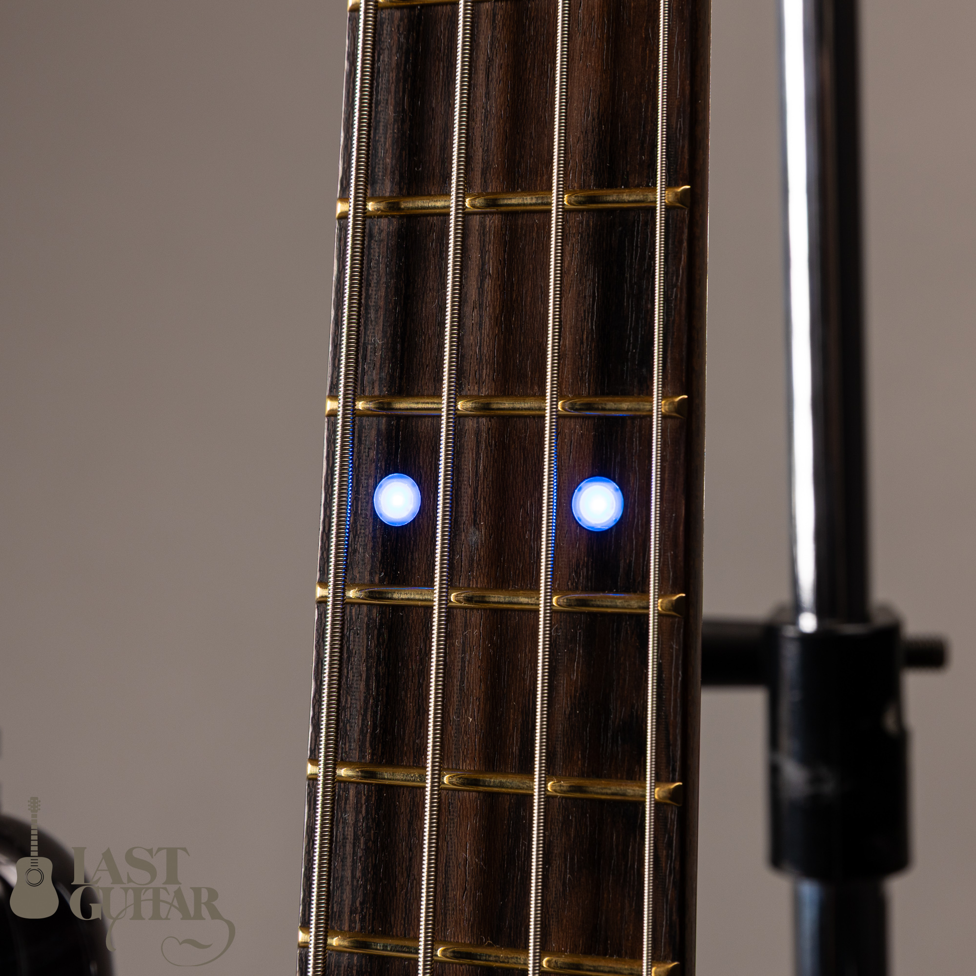 まず外観ですが美しい木目が入ったカーリーメイプル使用しており青と紫が綺麗に混ざったミッドナイトブルーカラーと相まって非常にシックなかっこ良いルックスです。またマッチングヘッドやブラスナットゴールドのフレットなどが高級感があり良い雰囲気を醸し出しています。12フレットのポジションマークにLEDが搭載しており暗いステージ上でも一際目立ちます。